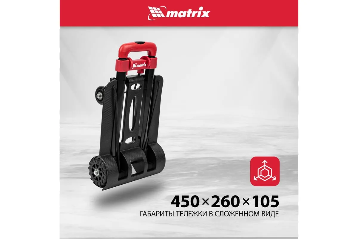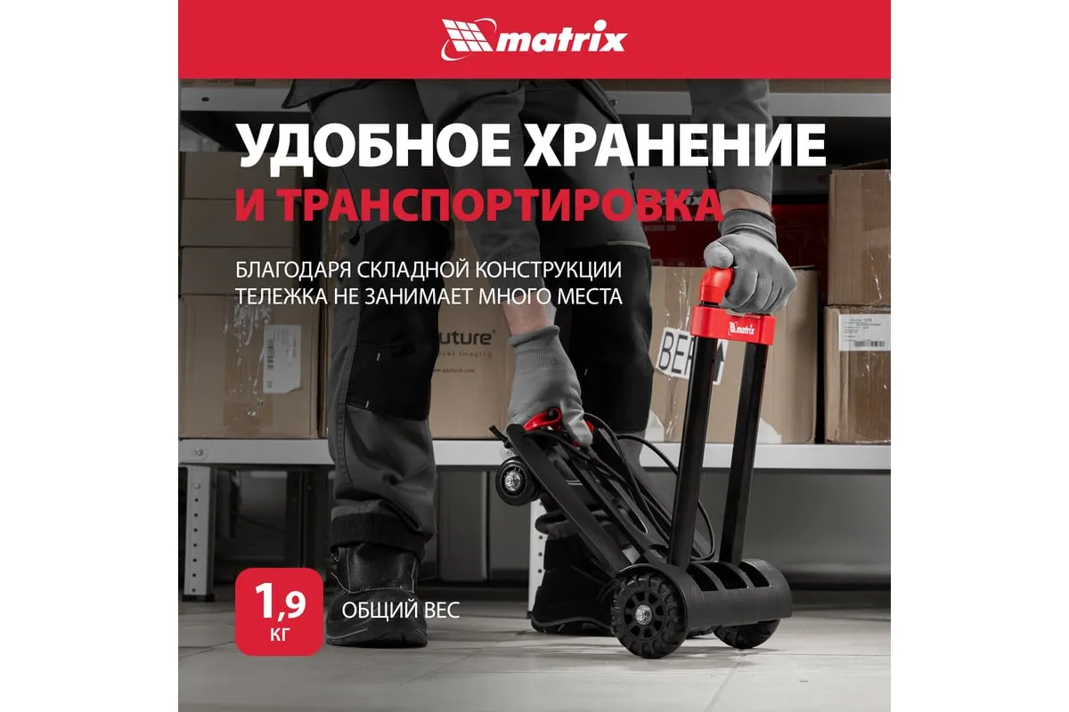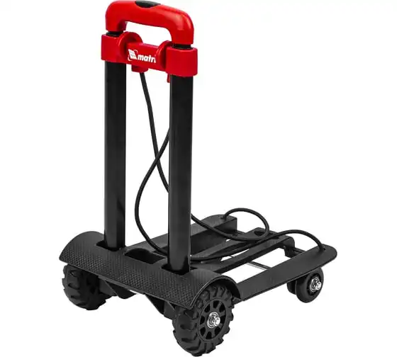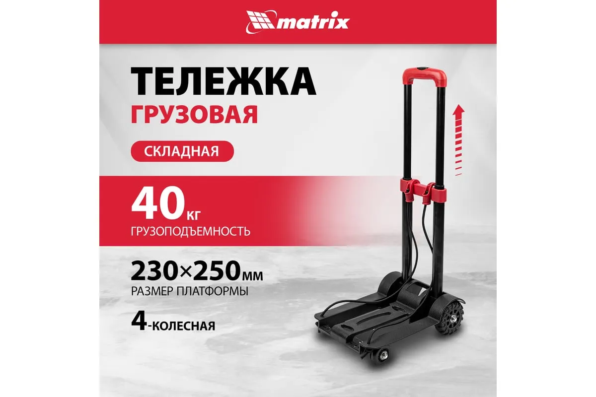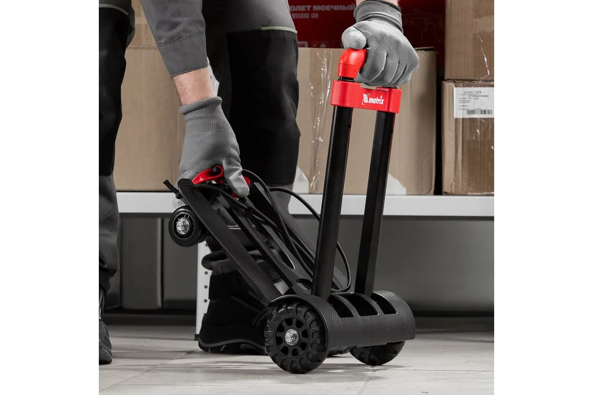 Складная хозяйственная 4-колесная тележка Matrix 98205 предназначена для перемещения грузов массой до 40 кг. Телескопическая рукоятка позволяет регулировать высоту тележки в соответствии с ростом пользователя. Для размещения груза предусмотрена платформа размером 230 x 250 мм.