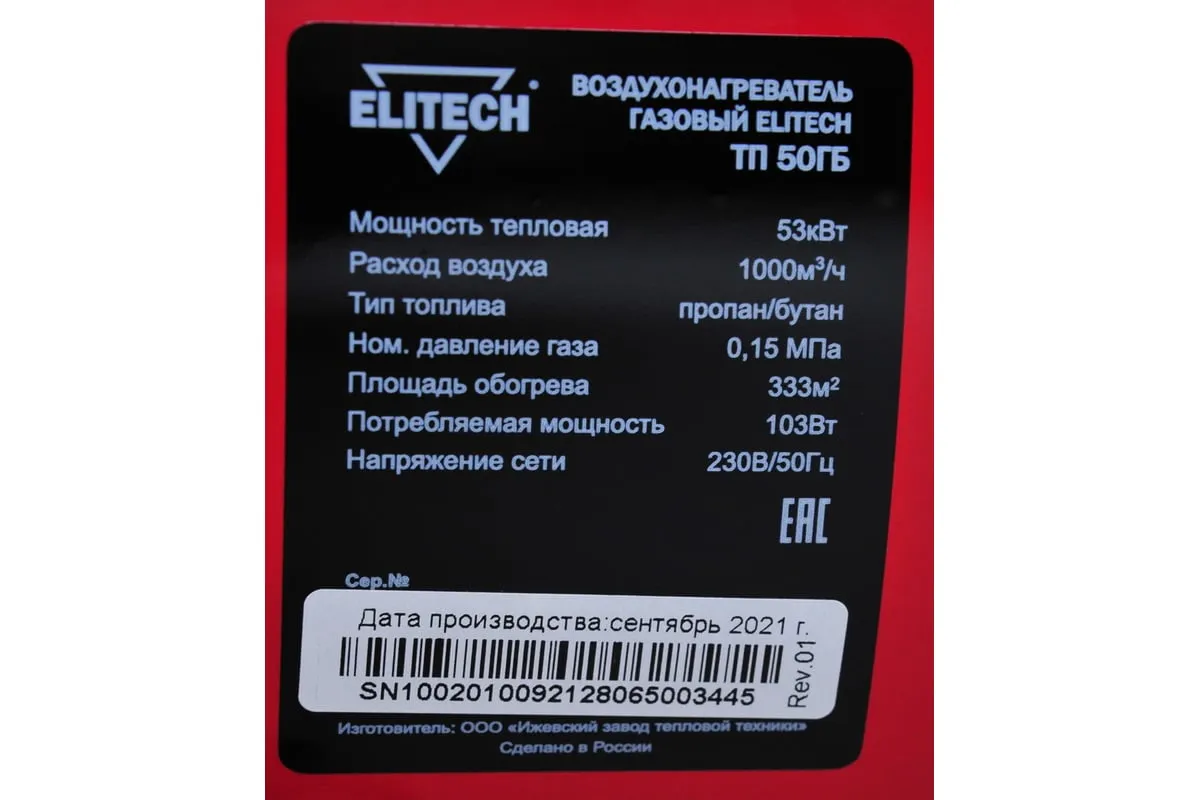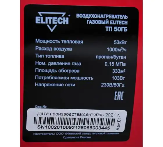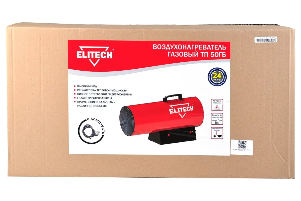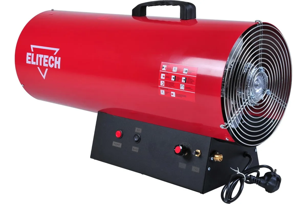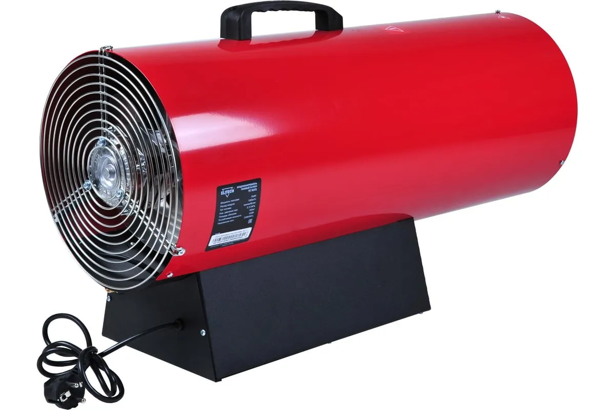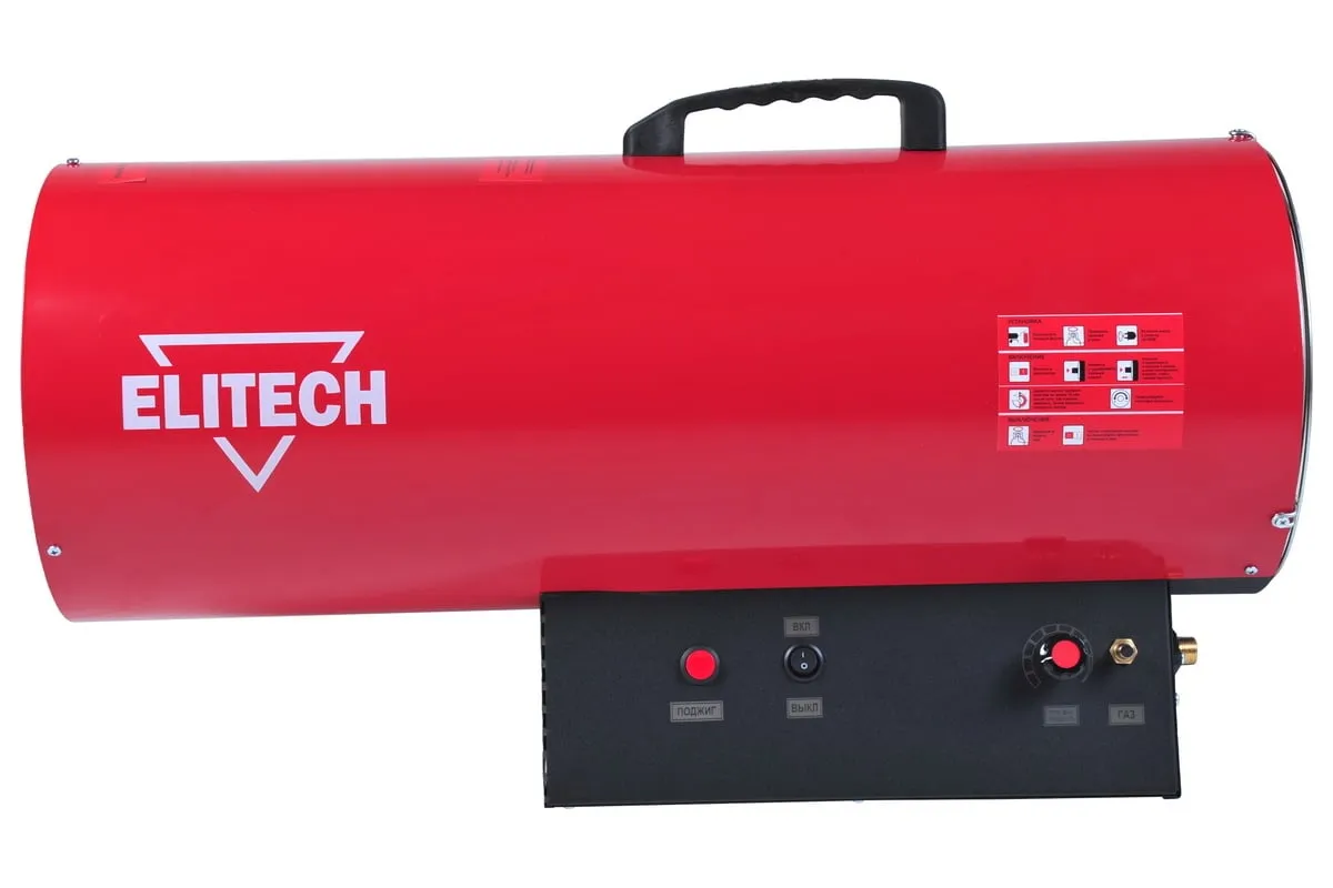 Тепловая пушка Elitech ТП 50ГБ работает на газе типа пропан/бутан. Данное отопительное устройство имеет электронный розжиг, термореле и высокий КПД. Тепловая пушка оснащена пластмассовой ручкой для удобства транспортировки. Данное устройство используют для обогрева хорошо вентилируемых производственных, общественных, складских помещений, а также на строительных площадках.