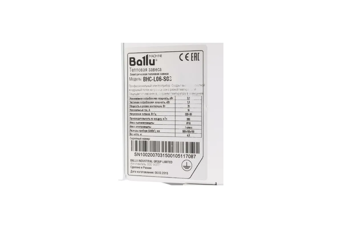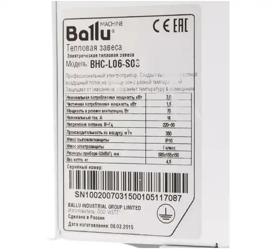 Электрическая тепловая завеса Ballu BHC-L06-S03 для проемов (дверей, ворот, окон) являются энергосберегающим элементом систем отопления и вентиляции зданий.