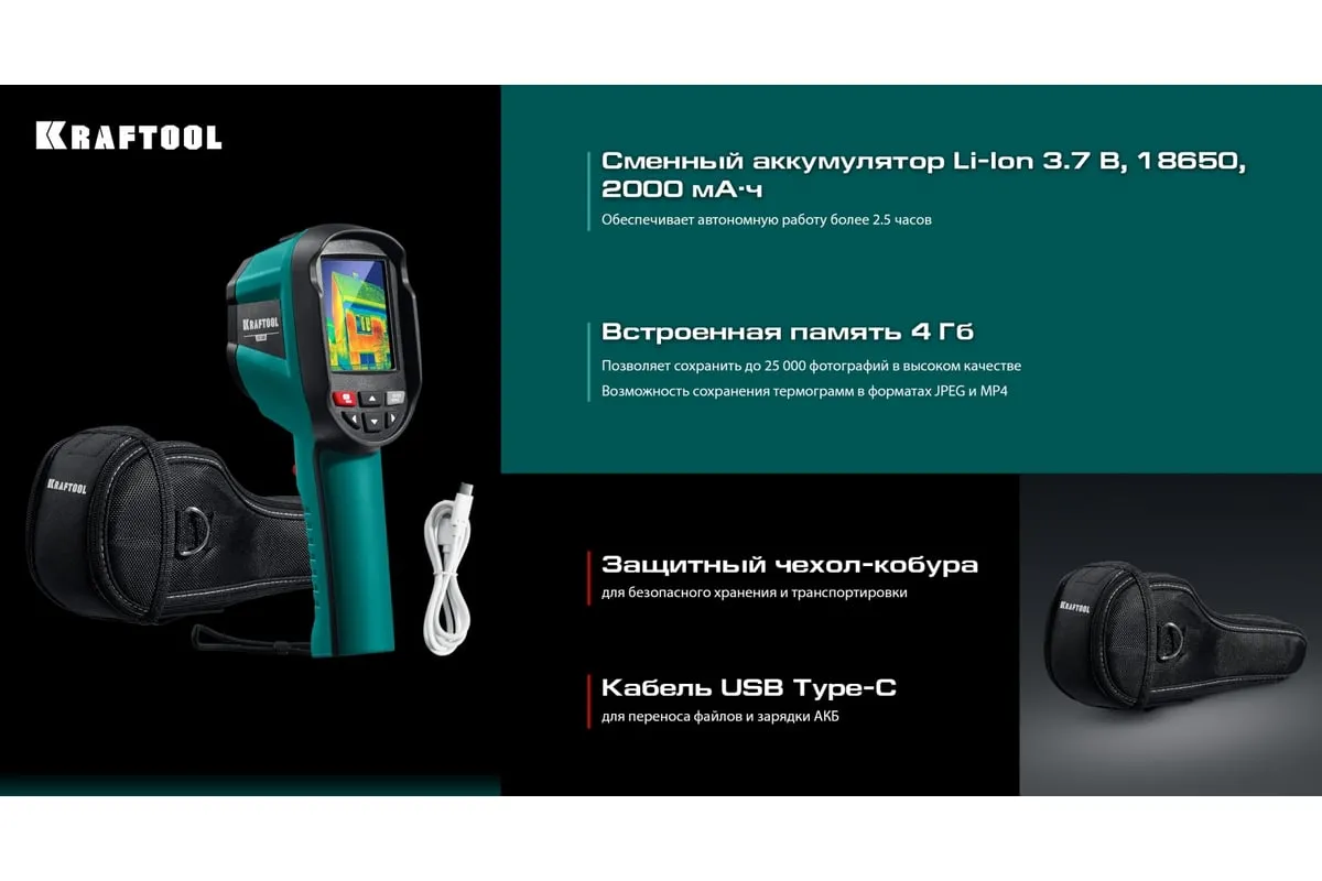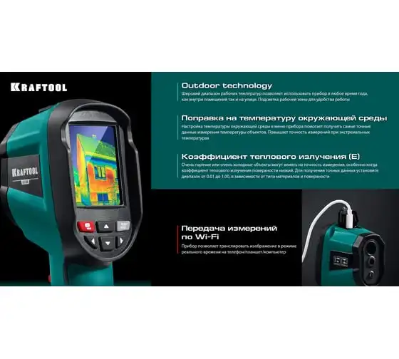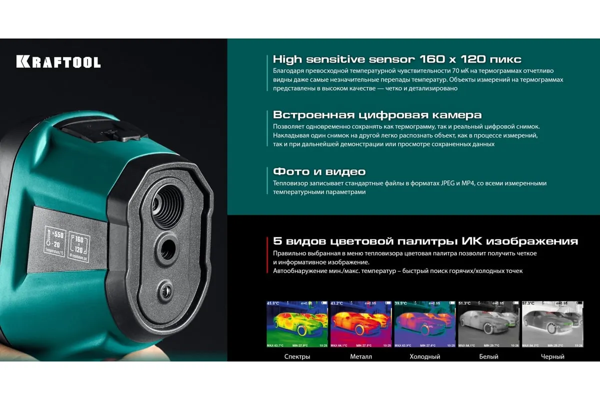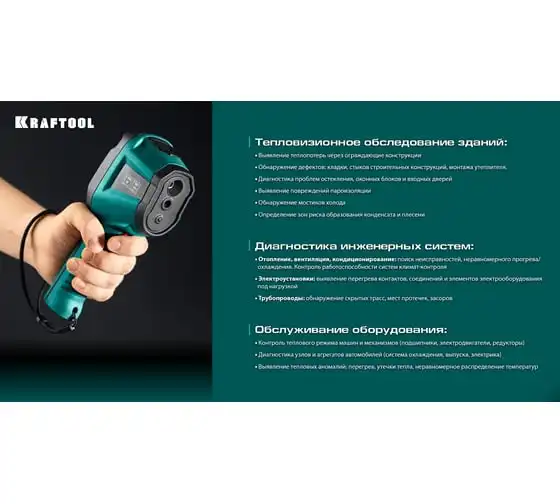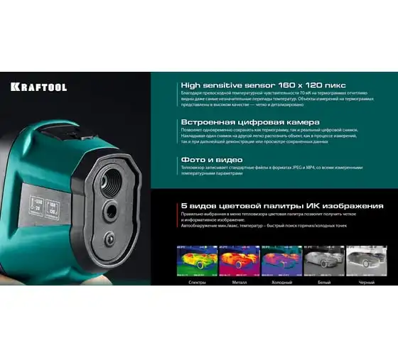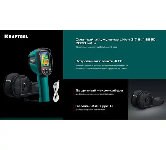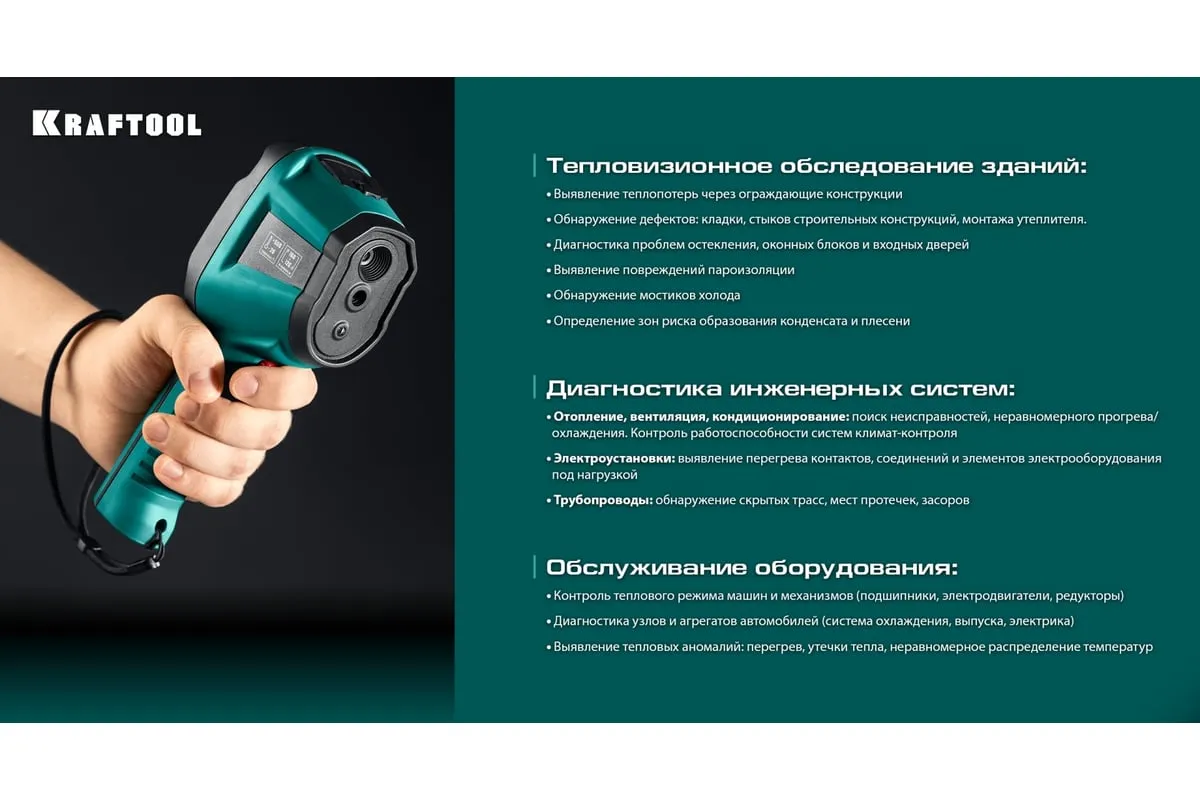 Тепловизоры KRAFTOOL обеспечивают точное обнаружение и локализацию утечек или дефектов ограждающих конструкций, незаменимы для профилактического и предупредительного обслуживания, диагностики состояния зданий, а также для исследований и разработок. Прибор оснащен мощным ИК сенсором 160 х 120 px, который позволяет получать термограммы высокой точности. Технология наложения изображений упрощает локализацию процесса измерения. Тепловизор имеет: Применяется для бесконтактного определения температуры поверхности различных объектов, позволяет обнаружить локализацию утечек или дефекты ограждающих конструкций.