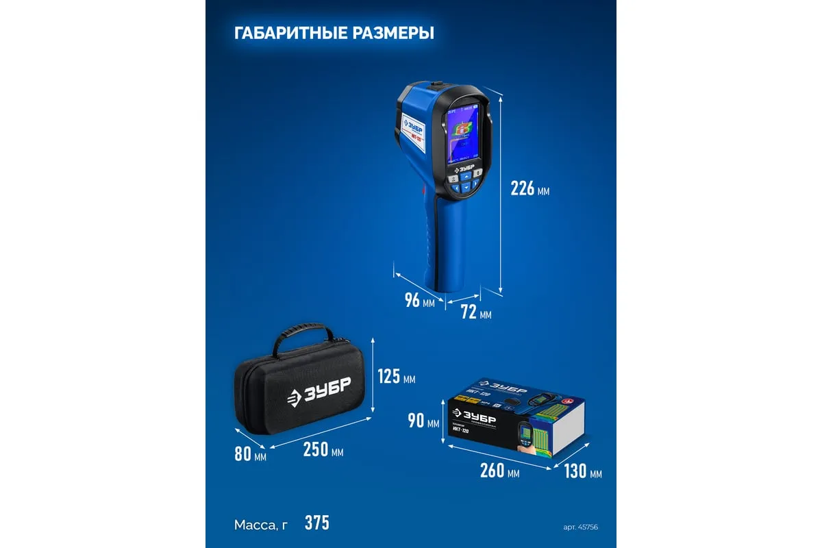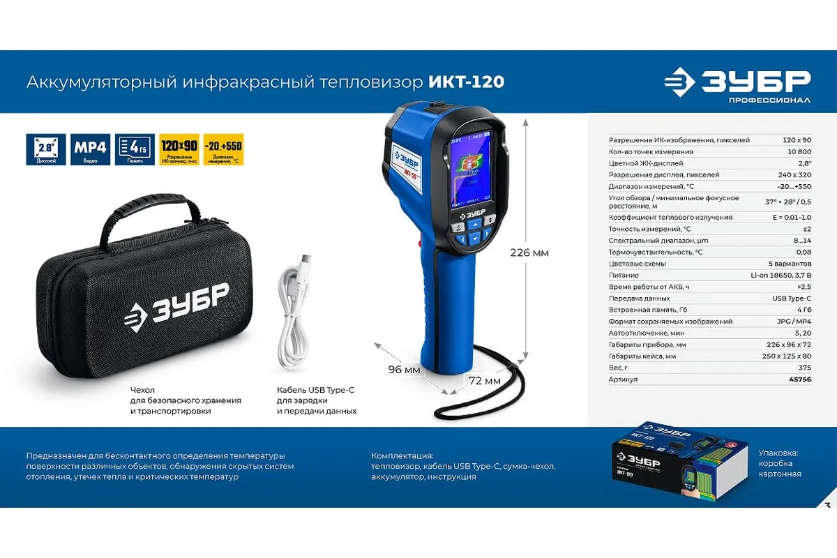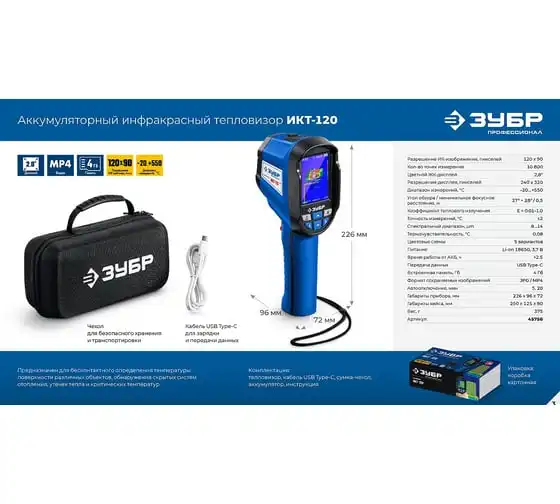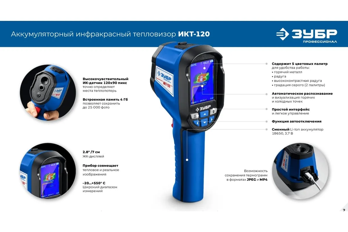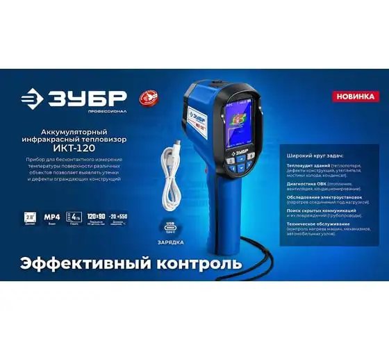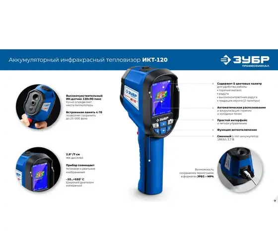 Тепловизоры ЗУБР обеспечивают точное обнаружение скрытых систем отопления, утечек тепла и критических температур. Он позволяет фиксировать видимое и инфракрасное изображение вместе с измеренными данными, сохраняя их в памяти прибора. Применяется для бесконтактного определения температуры поверхности различных объектов, обнаружение скрытых систем отопления, утечек тепла и критических температур.
