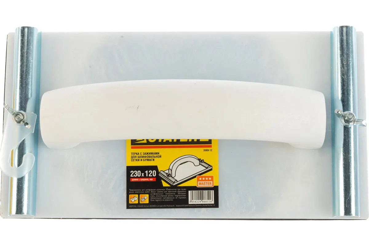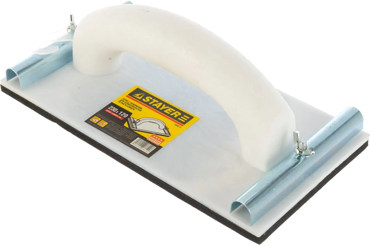 Терка для шлифования с металлическим фиксатором, 120x230мм STAYER 3569-12 выполнена из ударопрочного пластика. Поверхность из резины. На корпусе расположены металлические фиксаторы, благодаря которым крепится абразивный материал, например бумага или сетка для терки.