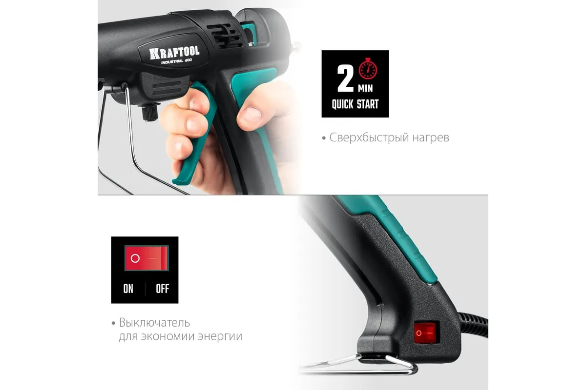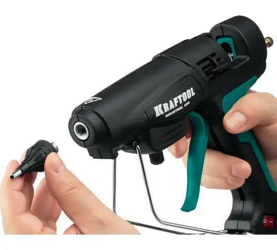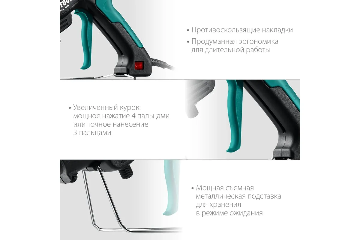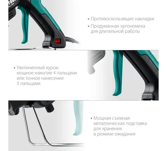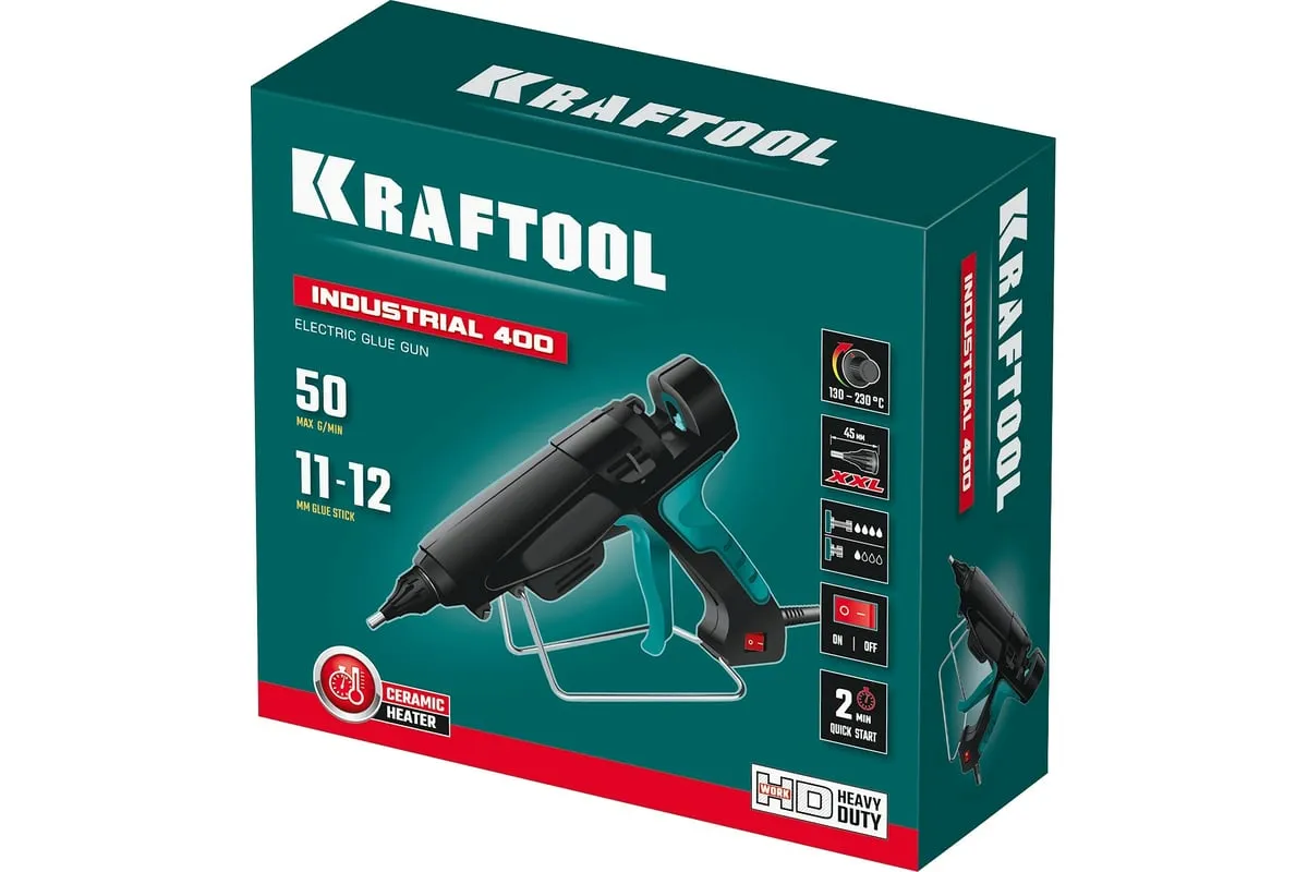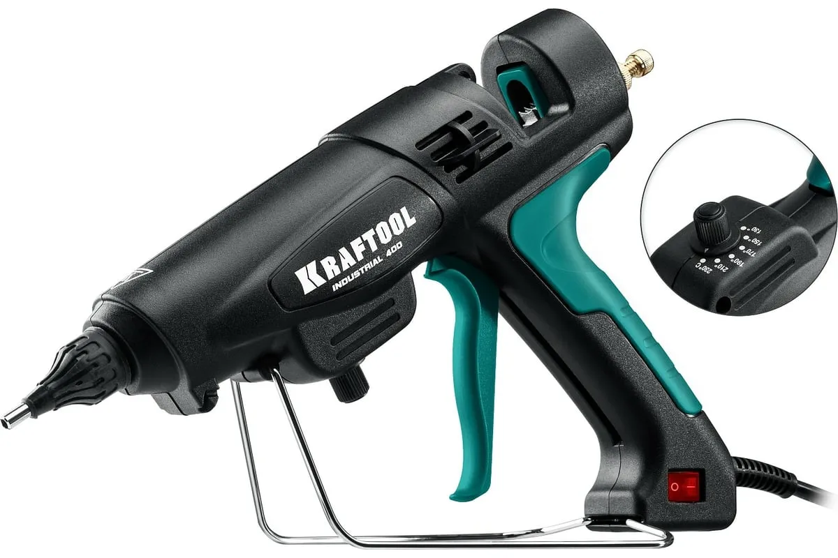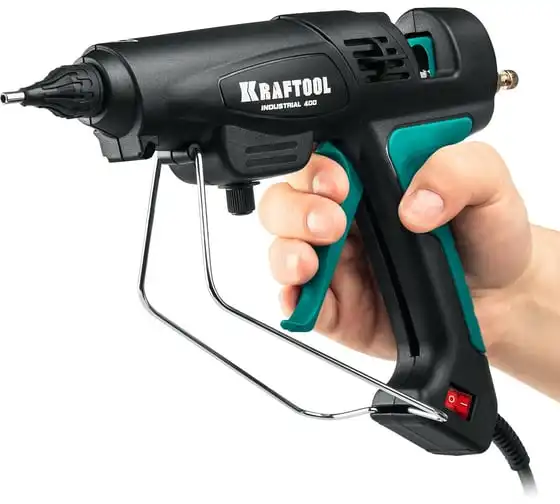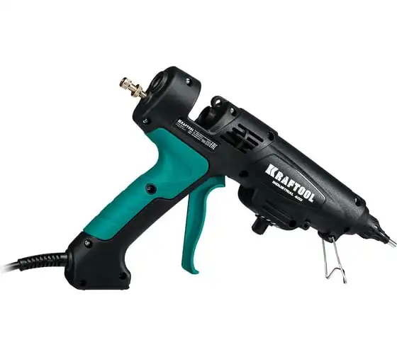 Термоклеящий пистолет KRAFTOOL Pro 06843-300-12 имеет длинный широкий курок, который удобно нажимать при любом хвате рукоятки. Специальная скоба позволяет фиксировать инструмент в нерабочем положении и обеспечивает его готовность к работе. Модель работает со стержнями диаметром 11-12 мм.