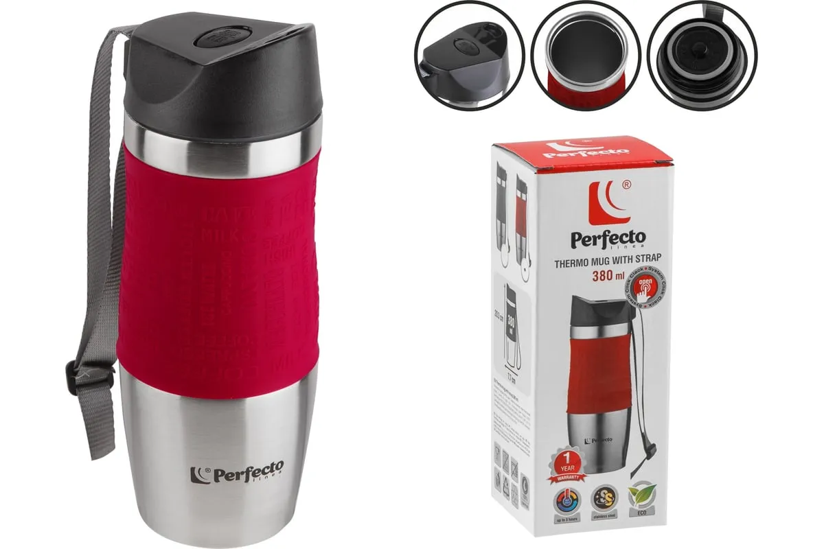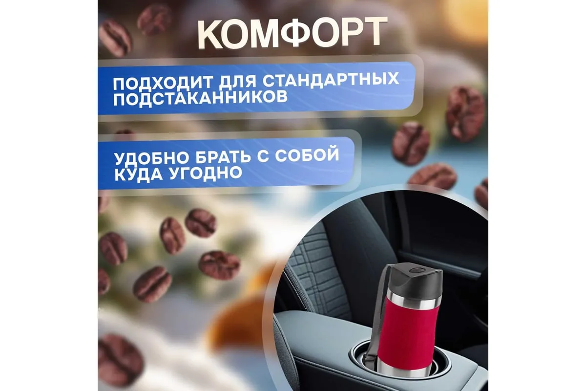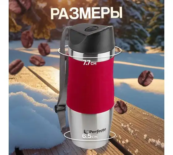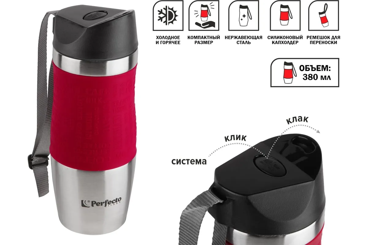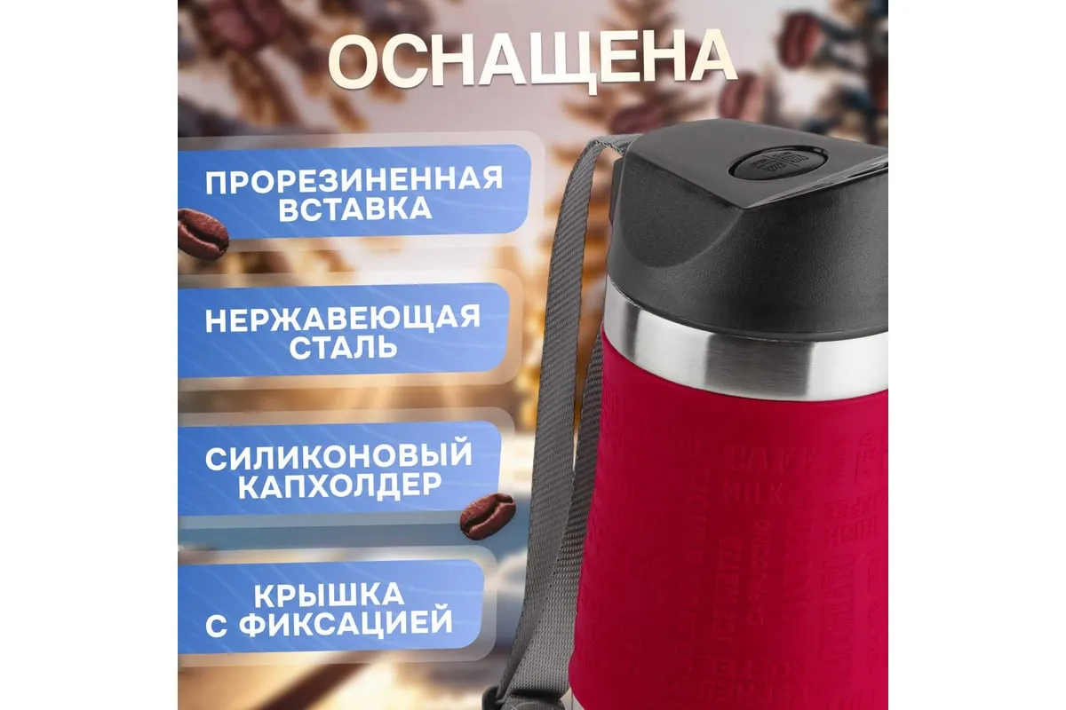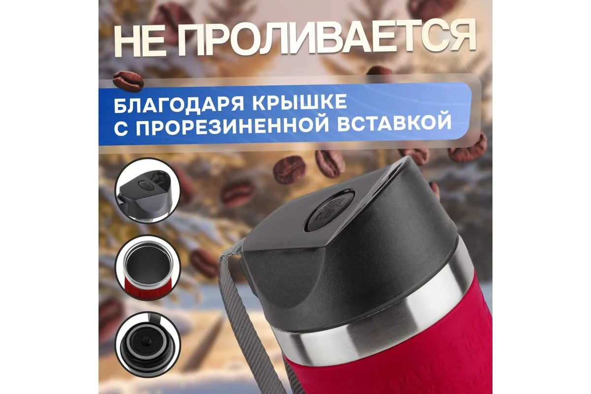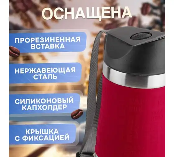 Высококачественная нержавеющая сталь Двойные стенки, создающие вакуумную теплоизоляцию, сохраняют температуру напитков в течение долгого времени Стильный дизайн Удобный ремешок Часть корпуса имеет силиконовую оболочку для защиты рук от высоких температур Механизм открытия/закрытия отверстия для питья Клик-Клак
