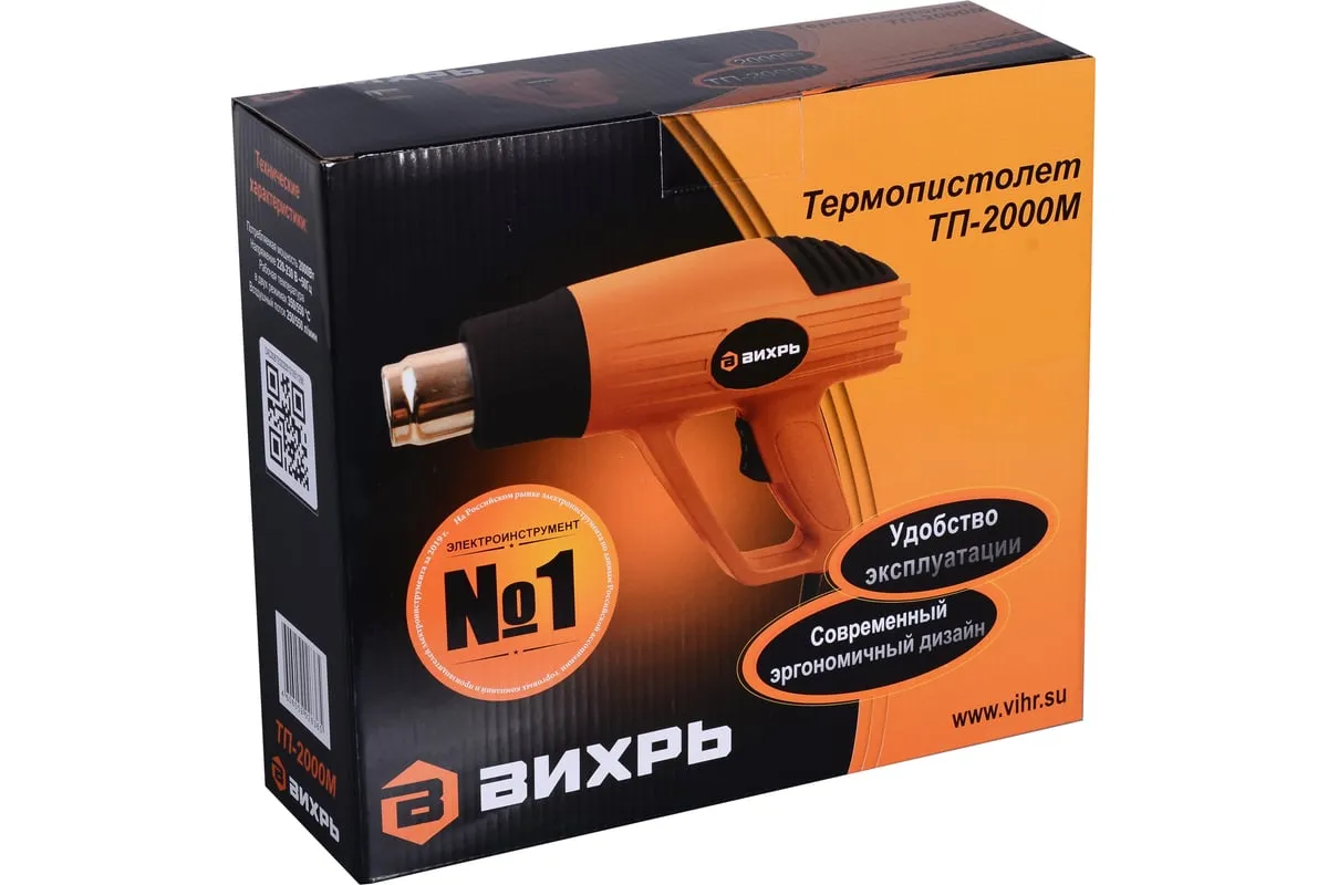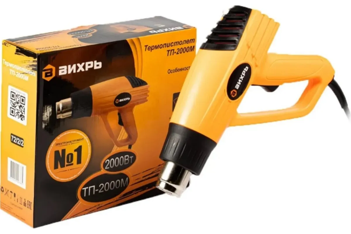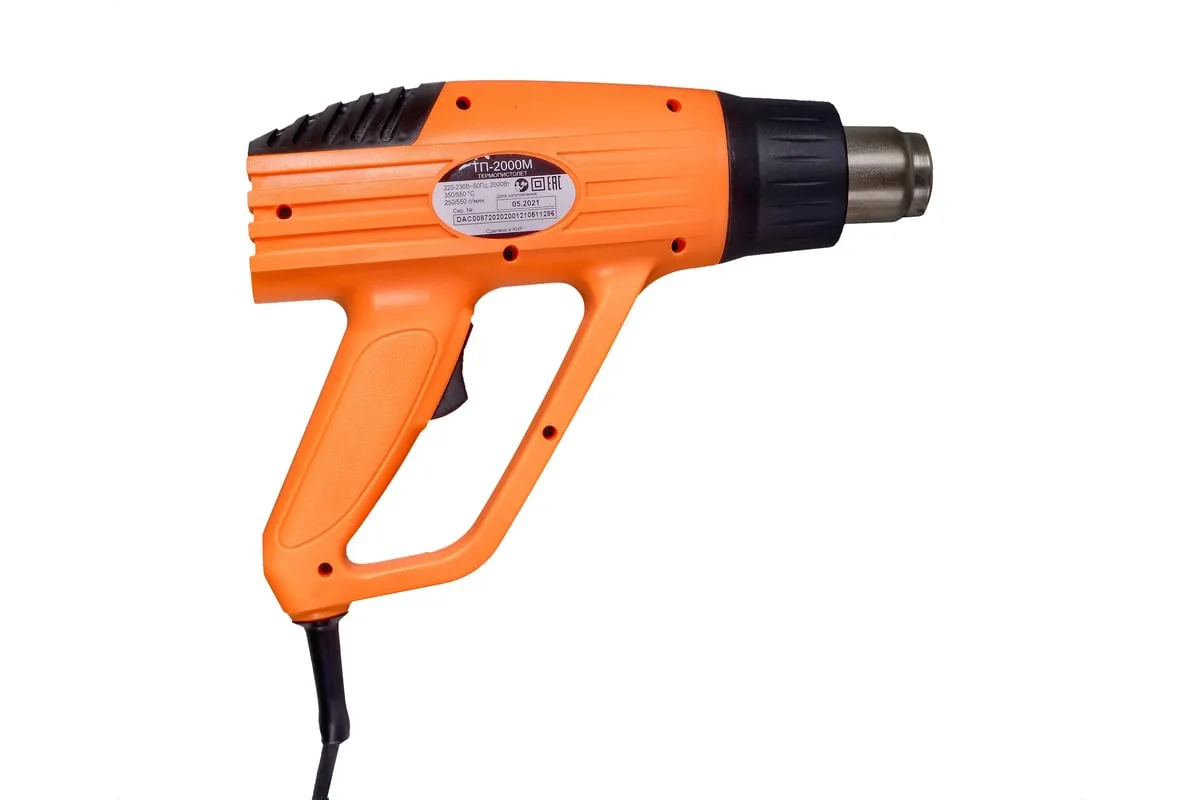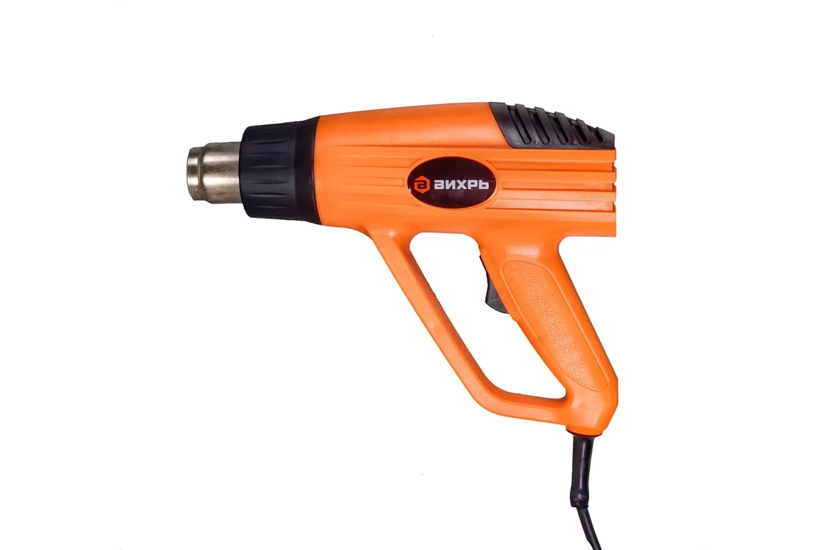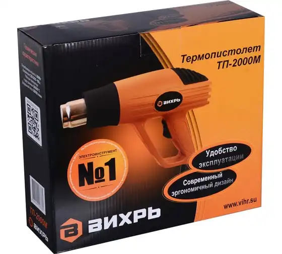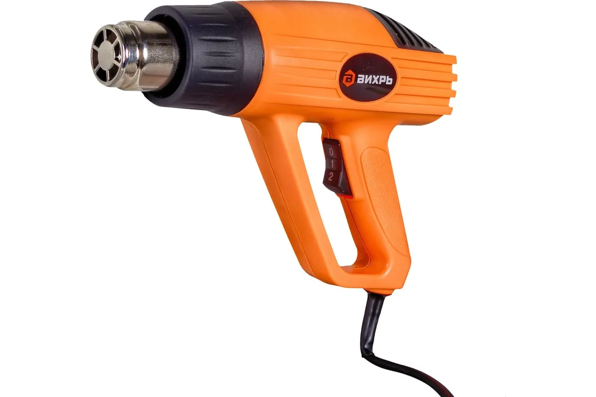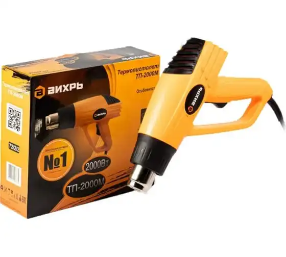 Термопистолет ВИХРЬ ТП-2000М – это электроинструмент ручного типа, который нашел свое широкое применение в быту и промышленных отраслях. Имеет простой принцип работы и применяется для обработки различных поверхностей потоком горячего воздуха. В данной модели предусмотрено два режима работы – температура выходящего потока составляет 350 и 550 градусов, при этом воздушный поток составляет до 250/550 л/мин. Инструмент может использоваться для удаления старого лакокрасочного покрытия, герметиков, нагревания термоусадки. Хорошо подходит для изготовления изделий из пластика, размораживания водопровода и других целей. Мощность инструмента составляет 2 кВт, поэтому он характеризуется высокой производительностью.