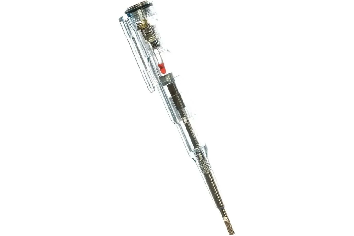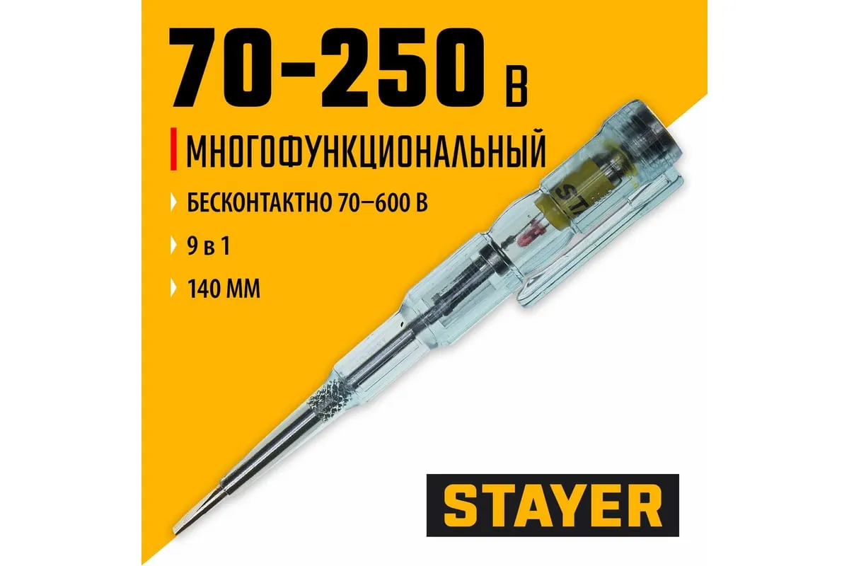 Тестер напряжения STAYER 4520-18 применяется для определения наличия напряжения в проводниках как контактным, так и бесконтактным способами. Инструмент работает от двух батареек, входящих в комплект поставки. Вес тестера составляет 0.06 кг.