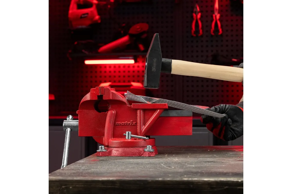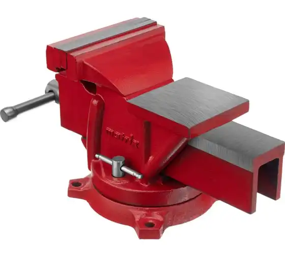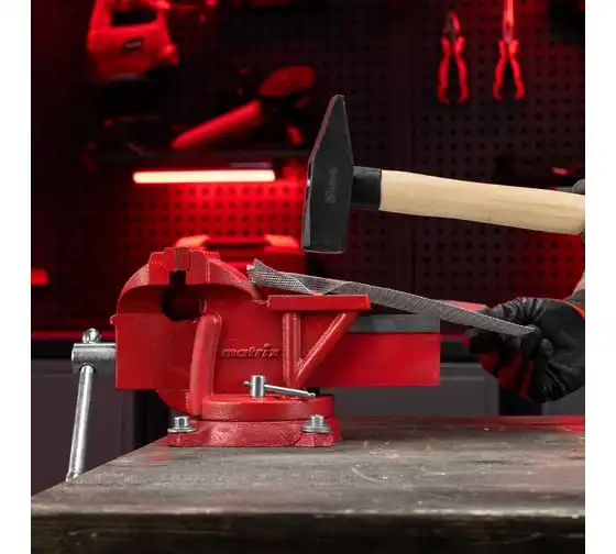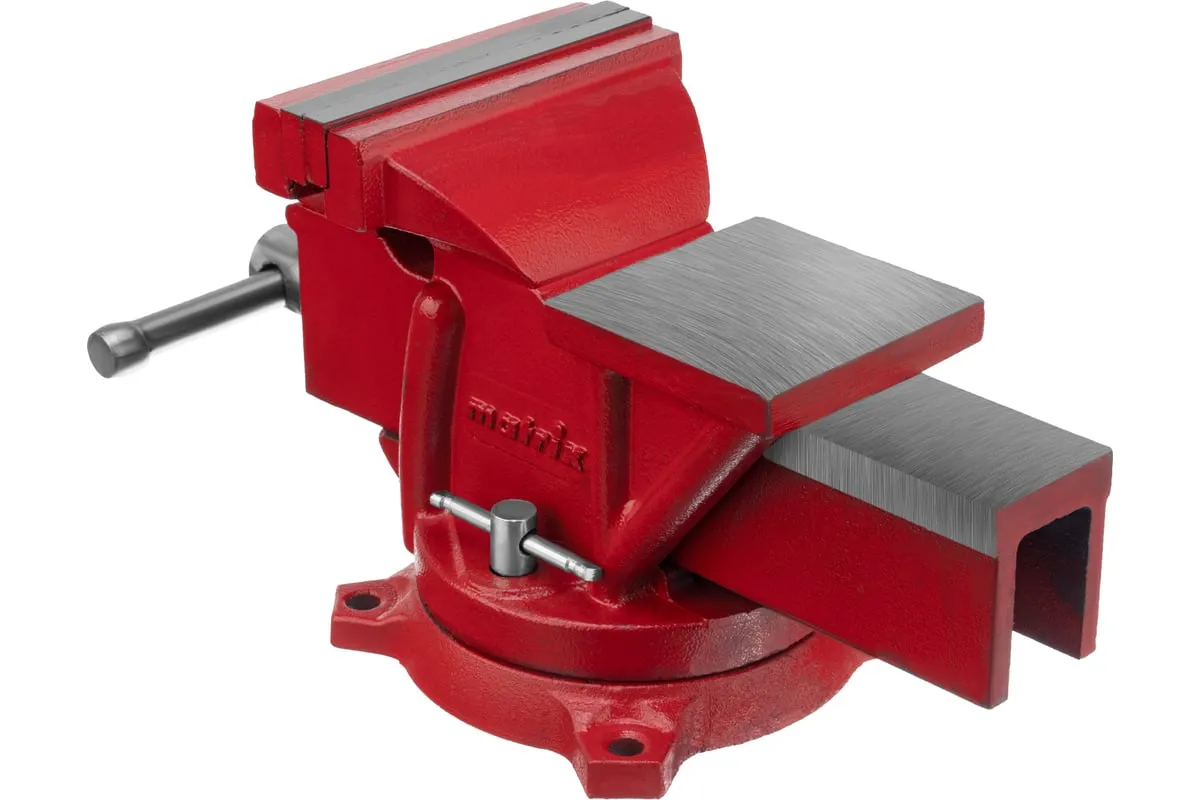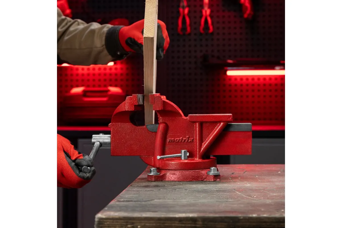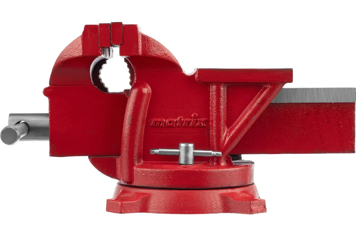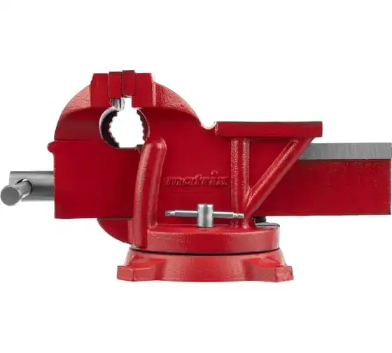 Поворотные слесарные тиски Matrix 18601, с наковальней и губками шириной 125 мм, имеют рабочий ход 115 мм и предназначены для захвата и фиксации различных деталей. Поворотный механизм с прижимными винтами позволяет вращать тиски на 360° и фиксировать их в выбранном положении для удобной обработки заготовок с разных сторон. Инструмент используется для шлифовки, сверления и проведения других работ. Будет полезен в мастерской и гараже.