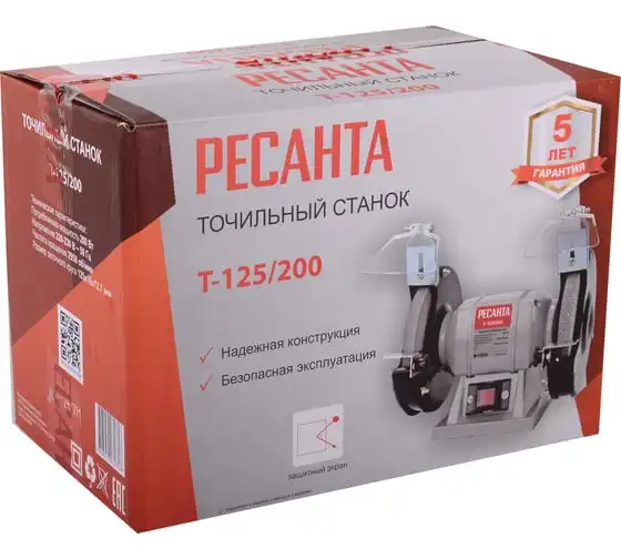 Точильный станок Ресанта предназначен для профессиональной заточки режущих поверхностей. Асинхронный электрический двигатель мощностью 200 Вт позволяет использовать его для ножей, стамесок, ножниц, зубил. Максимальная скорость вращения шлифовального круга равна 2950 об/мин. Это обеспечивает высокую производительность и быстроту заточки. Размер круга составляет 125х16 мм. Модель выпускается с двумя установленными шлифовальными кругами типа А36 для грубой обработки металла и А60 — для более тонкой. Их посадочный диаметр равен 12,7 мм.