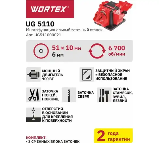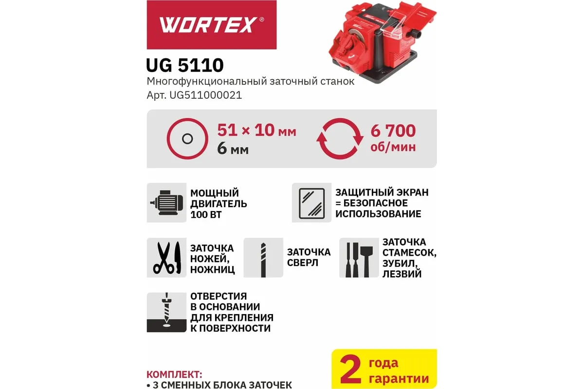 Точильный станок, точило WORTEX UG 5110 UG511000021 применяется для заточки различного режущего инструмента (сверл, стамесок, зубил, лезвий, ножей и ножниц). Выполнение работ обеспечивает шлифовальный круг размером 51х10х6 мм. Благодаря большому числу оборотов заточка не потребует много времени. Защитный экран из прозрачного пластика дает возможность визуально контролировать выполнение операции, а также оберегает оператора от вылета искр. В основании устройства предусмотрены отверстия для крепления к поверхности. Станок работает от сети.