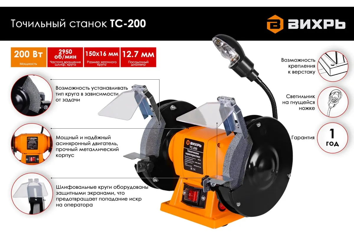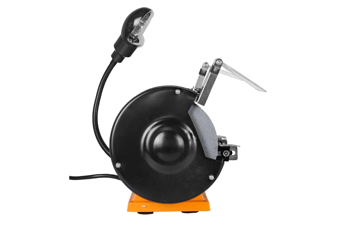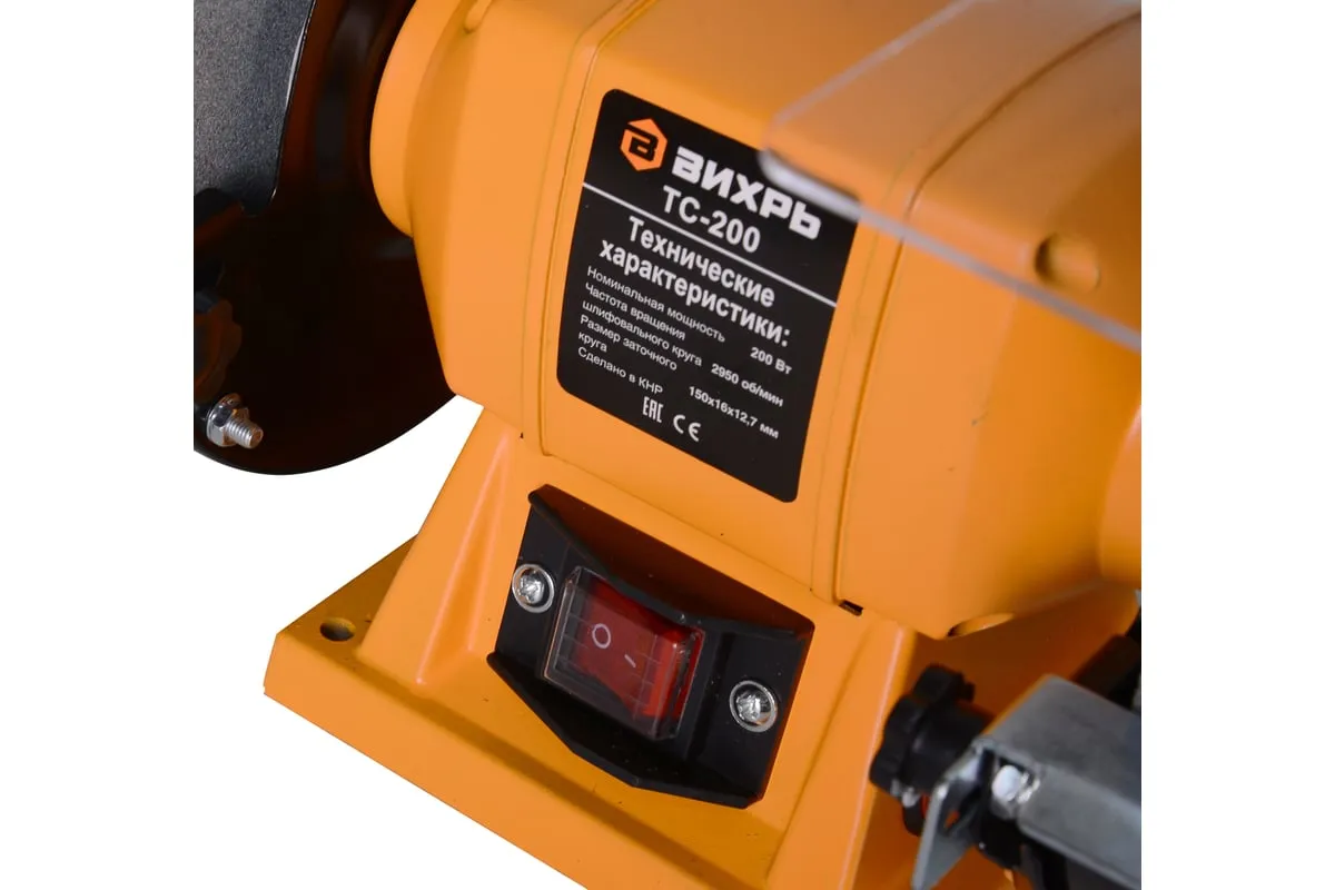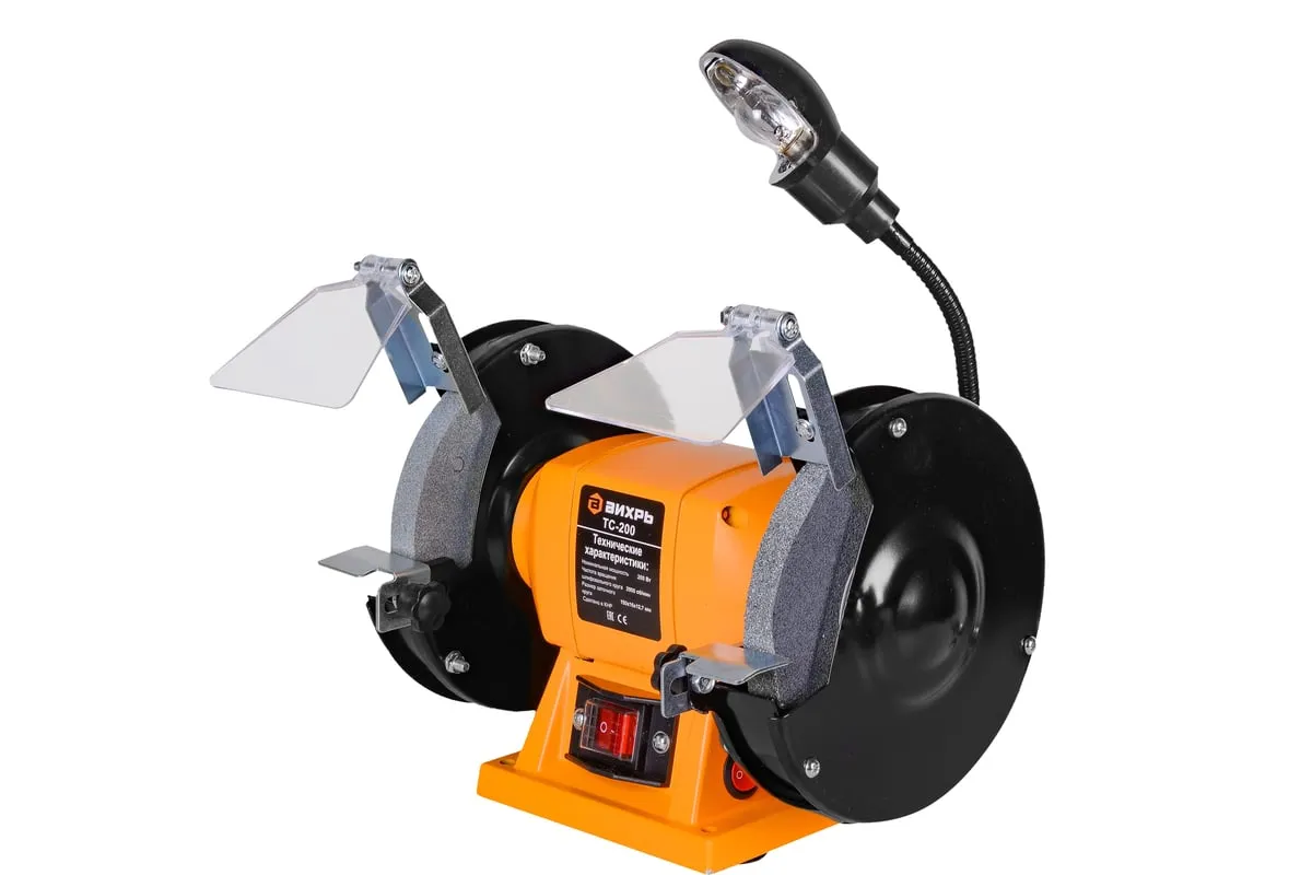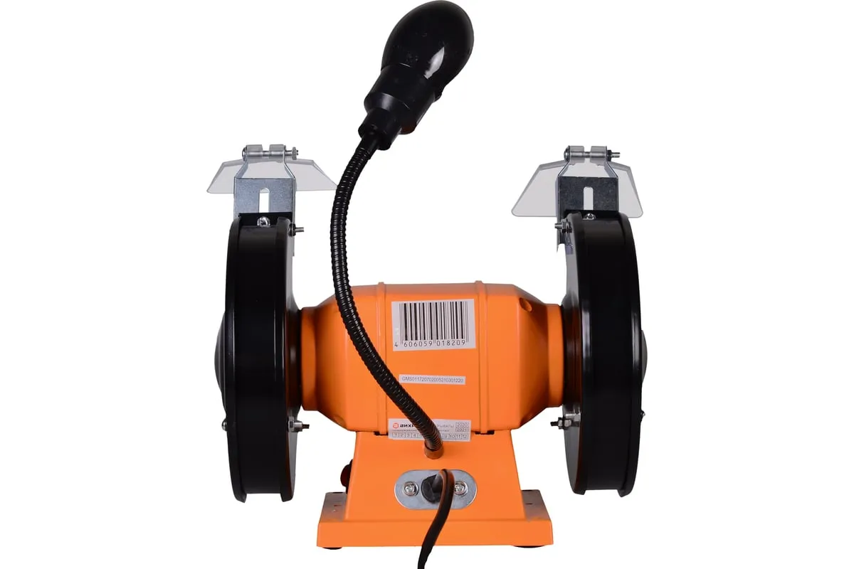 Помещен электромотор в корпус из алюминия. Для простого и удобного крепления, чтобы обеспечить надежную фиксацию в процессе работы, в корпусе предусмотрены отверстия. Чтобы обеспечить безопасность во время работы, на корпусе точила устанавливаются защитные кожухи с искрогасителями, которые эффективно отражают большую часть окалины. Прозрачный защитный экран обеспечивает удобство и защиту во время работы. Также в комплектацию станка входят рабочие упоры, которые помогают удерживать изделия при заточке. Имеется и подсветка, которая значительно упрощает использование инструмента при недостаточном освещении.