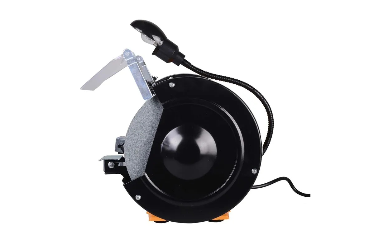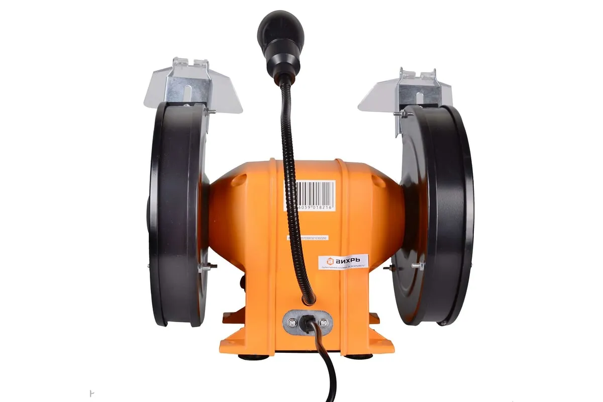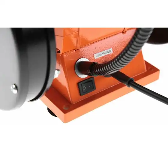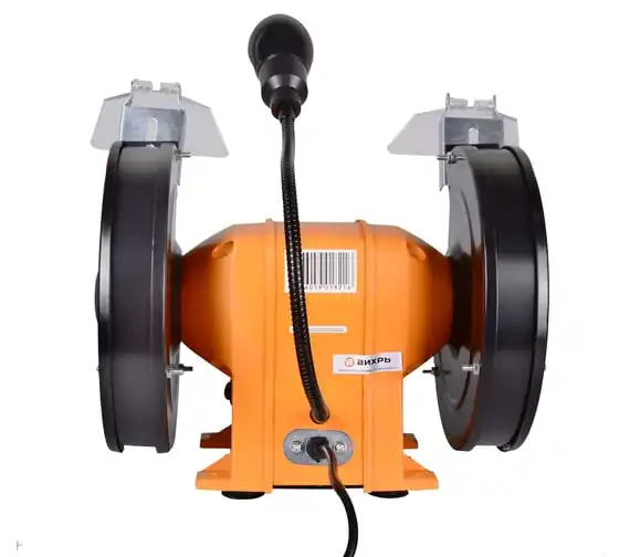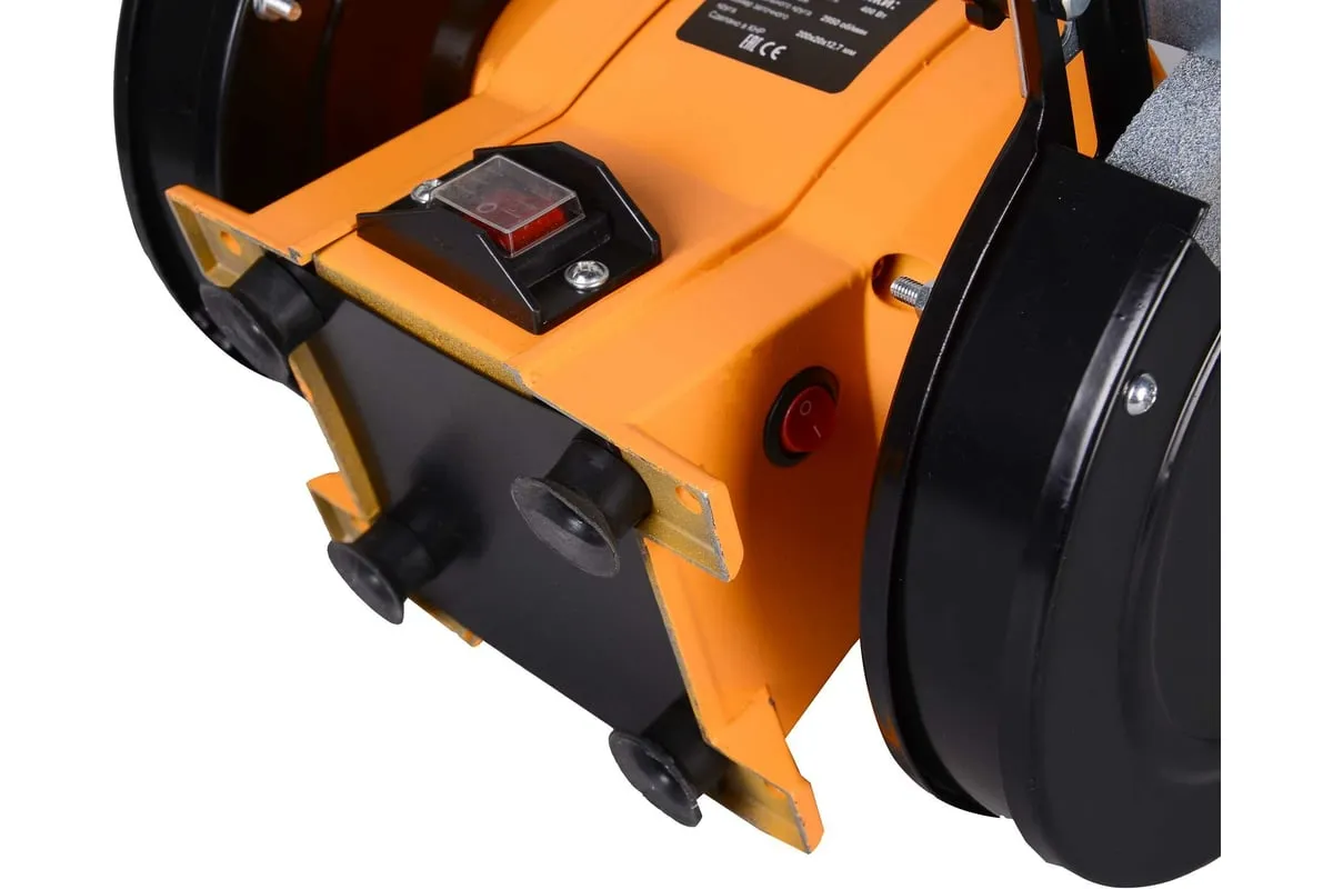 Устройство оснащено асинхронным электродвигателем и является самым мощным в данной линейке. Наличие асинхронного типа мотора минимизирует уровень вибрации при работе устройства. На металлическом корпусе установлены 2 шлифовальных круга диаметром 200 мм, толщиной 25 мм. Для обеспечения безопасности пользователя на станке имеются искрогасители и прозрачные экраны. Наличие упоров в основании корпуса обеспечивает стабильность работающего агрегата. При необходимости его можно зафиксировать на верстаке, для чего предусмотрены специальные отверстия в нижней части кожуха. Это устранит вибрацию и исключит риск смещения устройства во время эксплуатации. Точильный станок оснащен лампой на гибком проводе, что позволяет обеспечивать дополнительное освещение рабочей зоны.