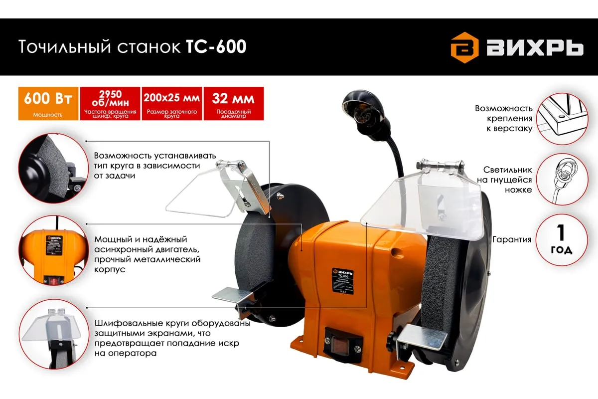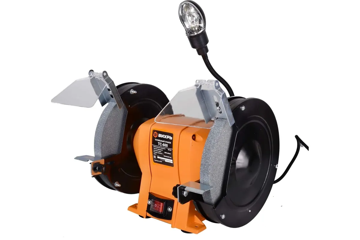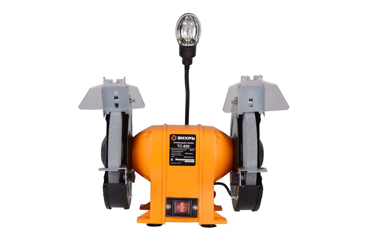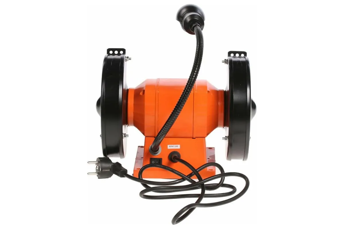 Устройство оснащено асинхронным электродвигателем и является самым мощным в данной линейке. Наличие асинхронного типа мотора минимизирует уровень вибрации при работе устройства. На металлическом корпусе установлены 2 шлифовальных круга диаметром 200 мм, толщиной 25 мм. Для обеспечения безопасности пользователя на станке имеются искрогасители и прозрачные экраны. Наличие упоров в основании корпуса обеспечивает стабильность работающего агрегата. При необходимости его можно зафиксировать на верстаке, для чего предусмотрены специальные отверстия в нижней части кожуха. Это устранит вибрацию и исключит риск смещения устройства во время эксплуатации. Точильный станок оснащен лампой на гибком проводе, что позволяет обеспечивать дополнительное освещение рабочей зоны.
