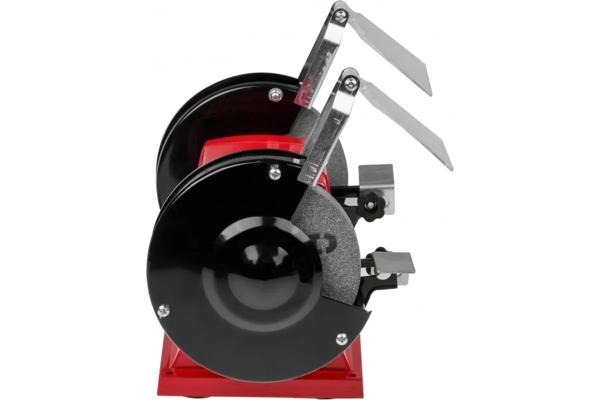 Модель имеет устойчивое основание и пылезащищенный выключатель. Два установленных круга имеют разную зернистость (мелкую и крупную) для заточки различного инструмента.