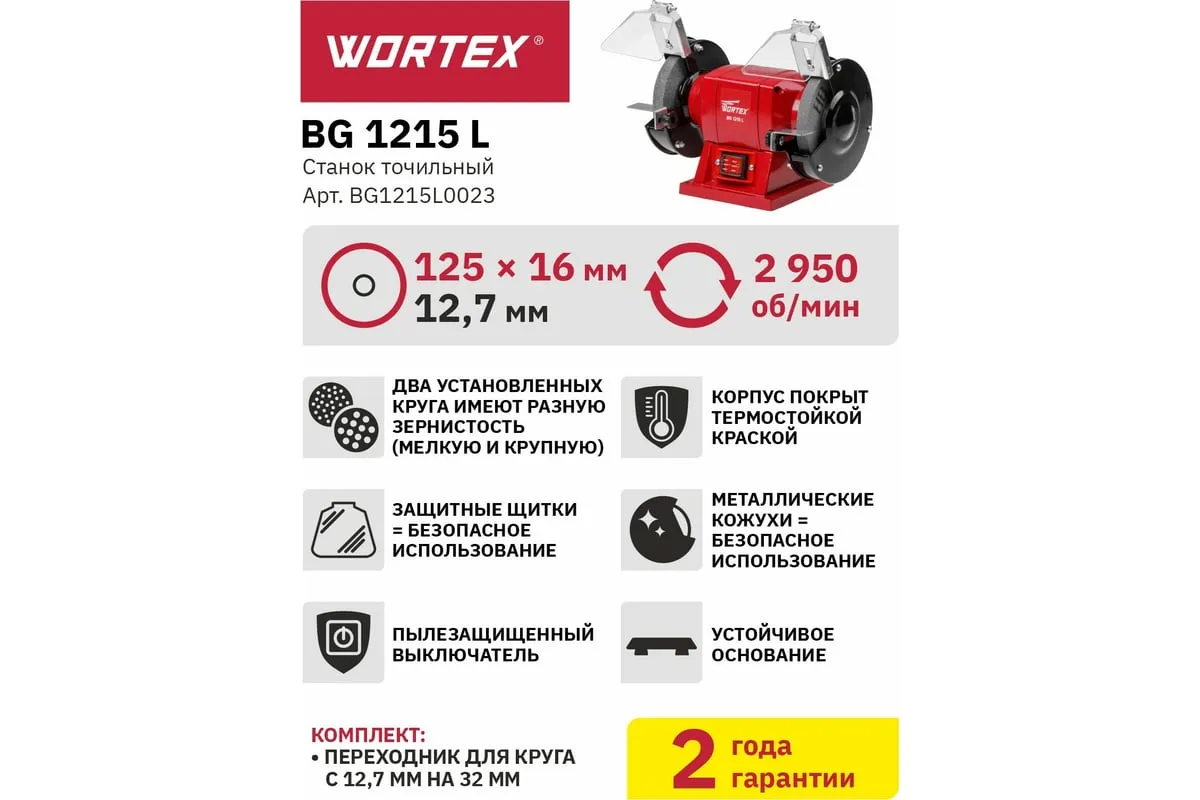 Точильный станок WORTEX BG1215L0023 предназначен для заточки инструмента. Корпус модели выполнен из качественного металла и покрыт термостойкой краской для защиты от коррозии. Станок оснащен защитными щитками и металлическими кожухами для безопасного использования.