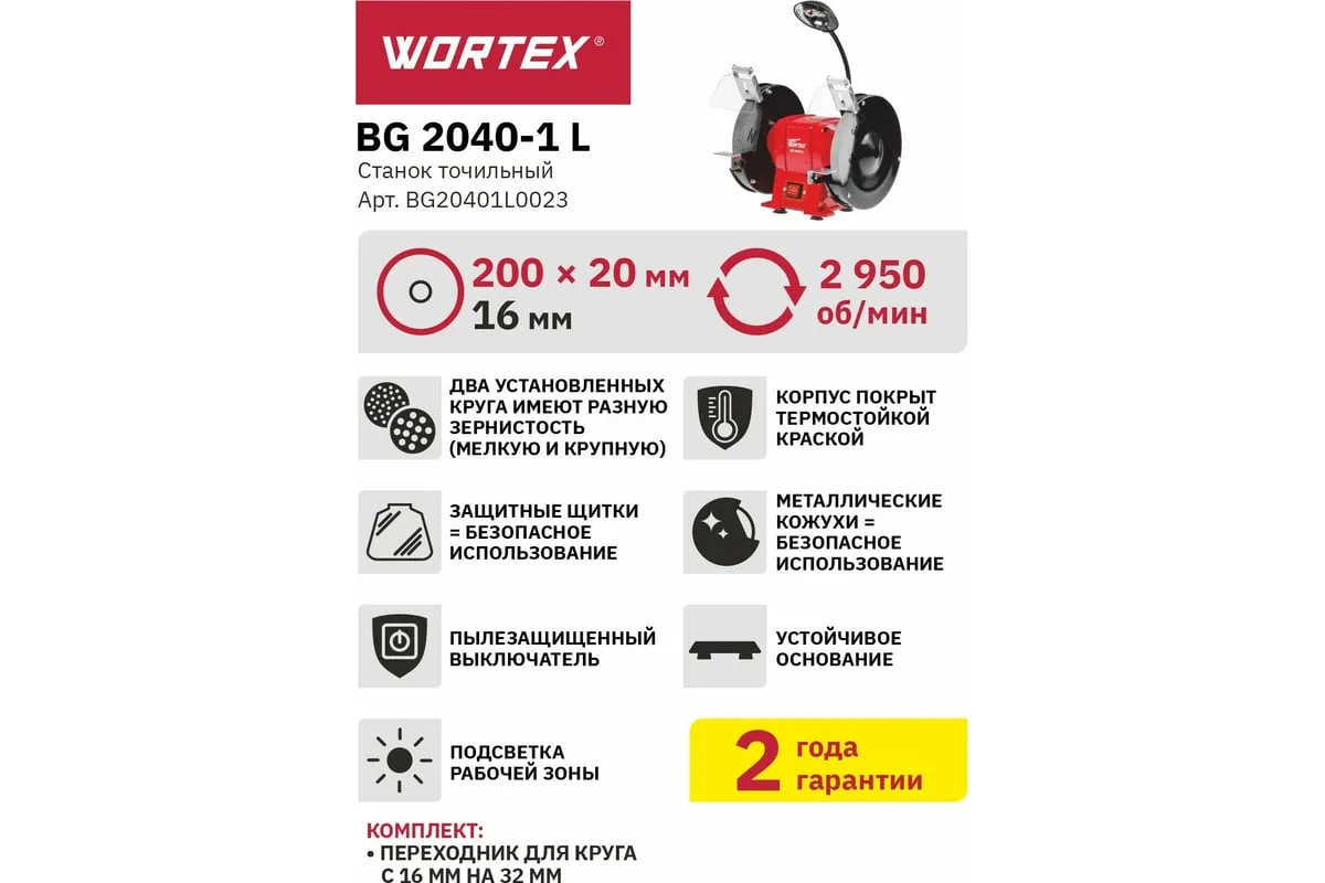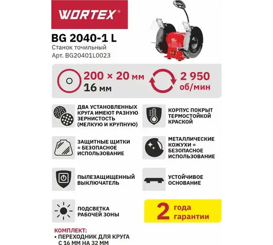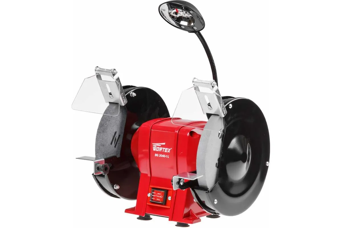 Точильный станок WORTEX BG20401L0023 предназначен для заточки инструмента. Корпус модели выполнен из качественного металла и покрыт термостойкой краской для защиты от коррозии. Станок оснащен защитными щитками и металлическими кожухами для безопасного использования.