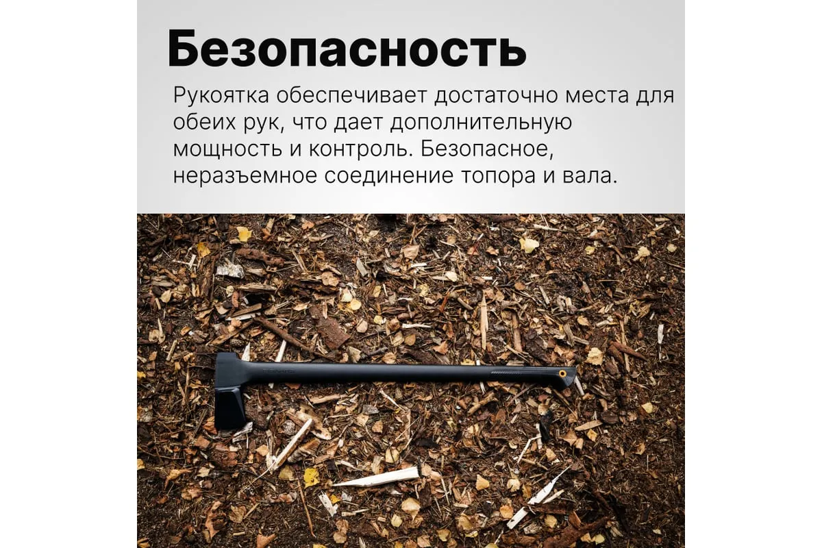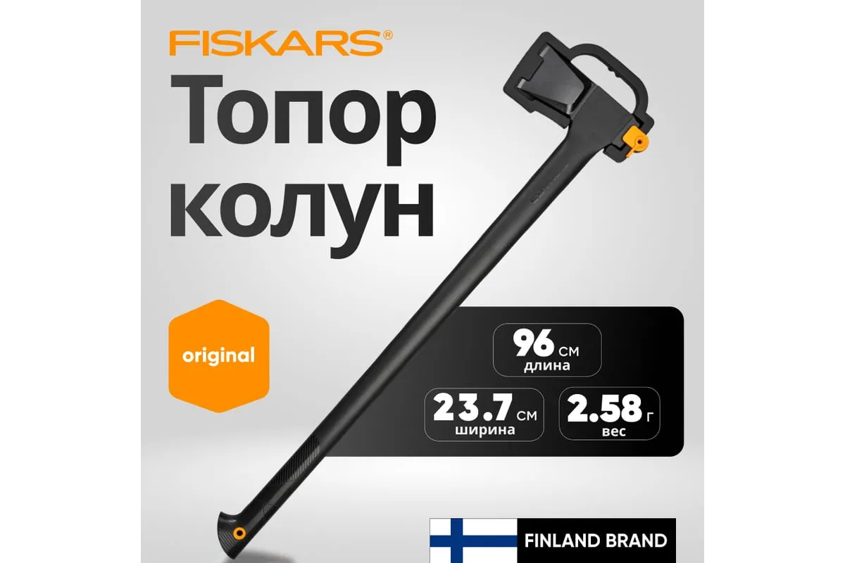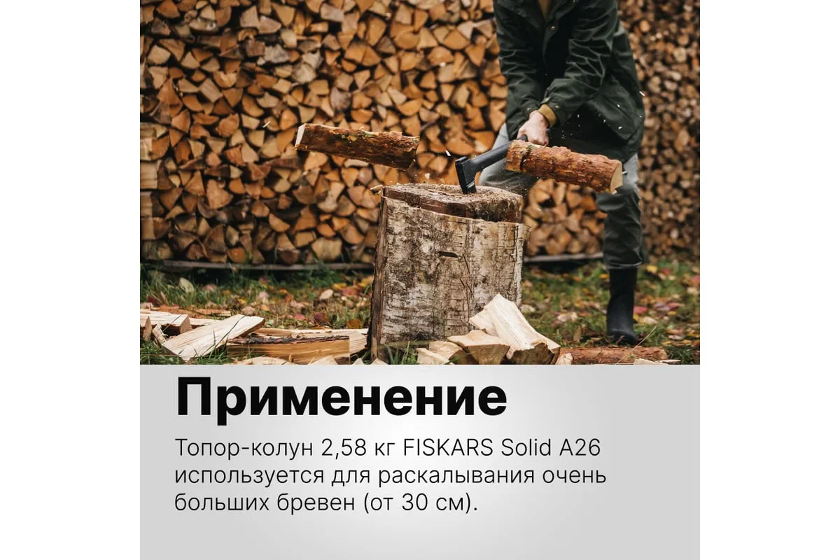 Топор-колун 2,58 кг FISKARS Solid A26 (1052043) используется для раскалывания очень больших бревен более 30см. Безопасное, неразъемное соединение топора и вала.