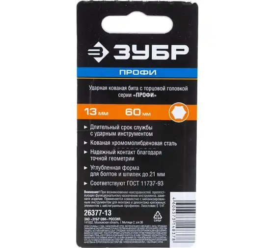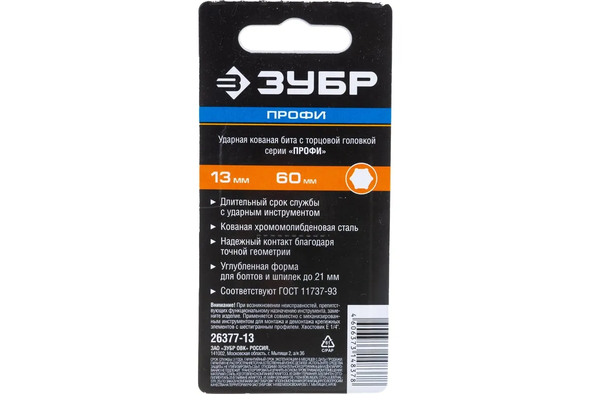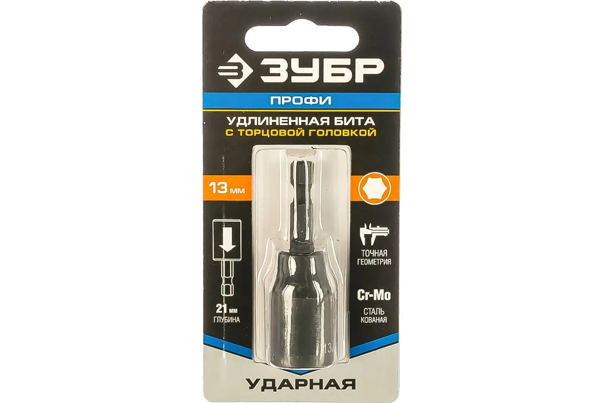 Торцевая головка удлиненная 13 мм "ПРОФИ" Зубр 26377-13 используется для закручивания и откручивания гаек и болтов с помощью инструмента с шестигранным патроном. Изготовлена из кованой хроммолибденовой стали, обеспечивающей длительный срок службы, и имеет углубленную форму для работы с болтами и шпильками длиной до 21 мм. Торсионная зона предохраняет наконечник головки от разрушения импульсными шуруповертами.