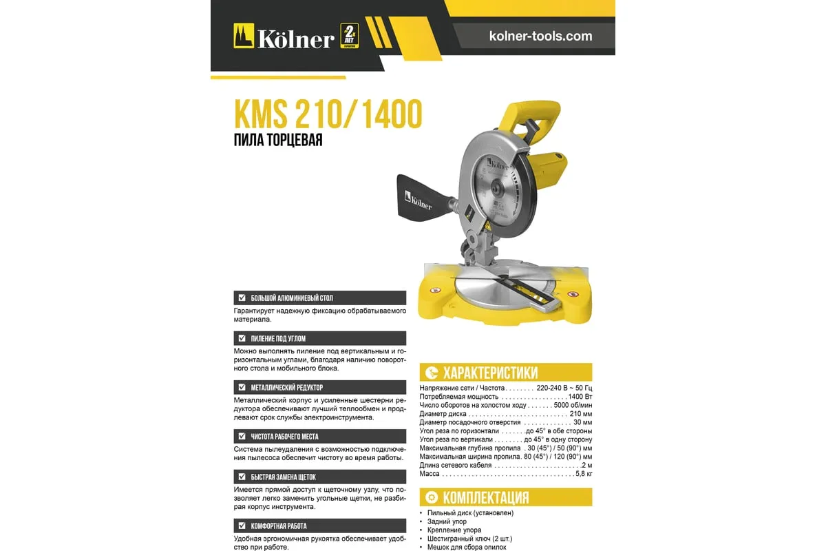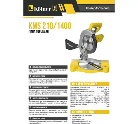 Торцевая пила Kolner KМS 210/1400 имеет блокировку шпинделя для быстрой и безопасной замены пильного диска. В свободное от работы время диск прикрыт дополнительным защитным кожухом, что обеспечивает безопасное хранение и транспортировку, а также исключает травматизм. Легкий доступ к щеткам предусматривает их самостоятельную замену без обращения в сервисные центры.