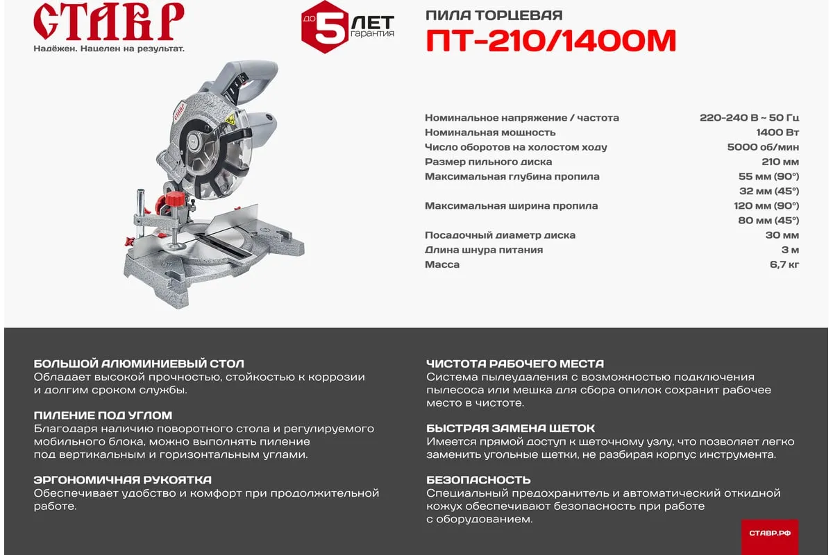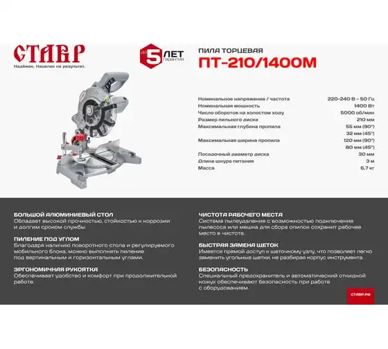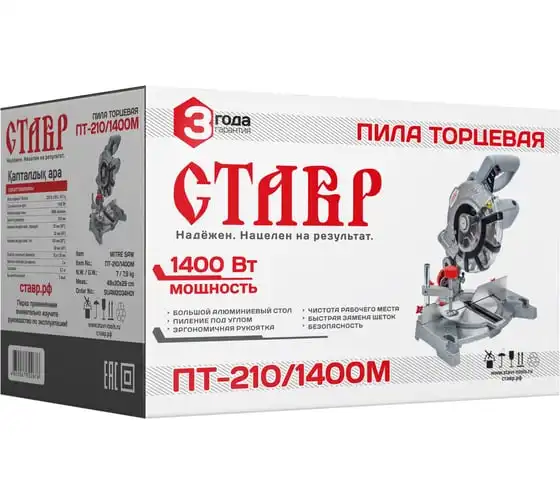 Торцевая пила Ставр ПТ-210/1400М используется для прямого и поперечного пиления заготовок из древесины. Угол распила может достигать 45 градусов в обе стороны. Легкий доступ к щеткам предусматривает их самостоятельную замену без обращения в сервисный центр. Для поддержания чистоты на рабочем месте можно подключить пылесос или пылесборный мешок.