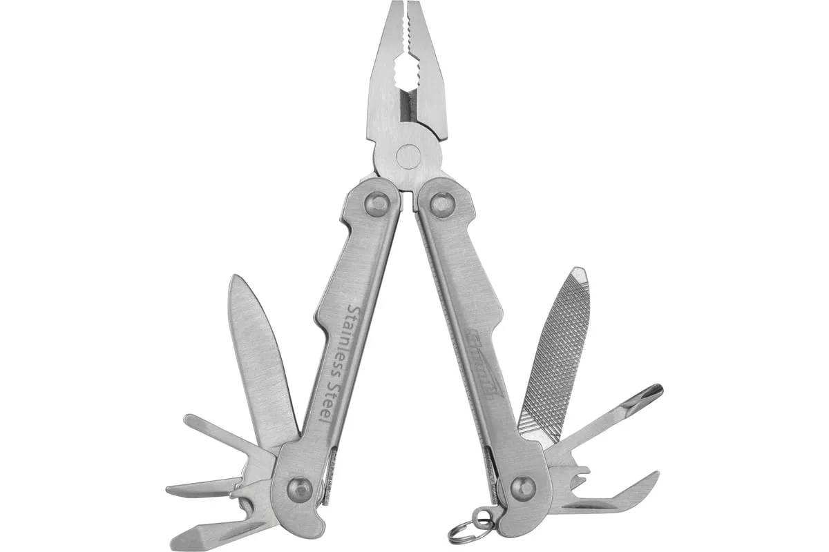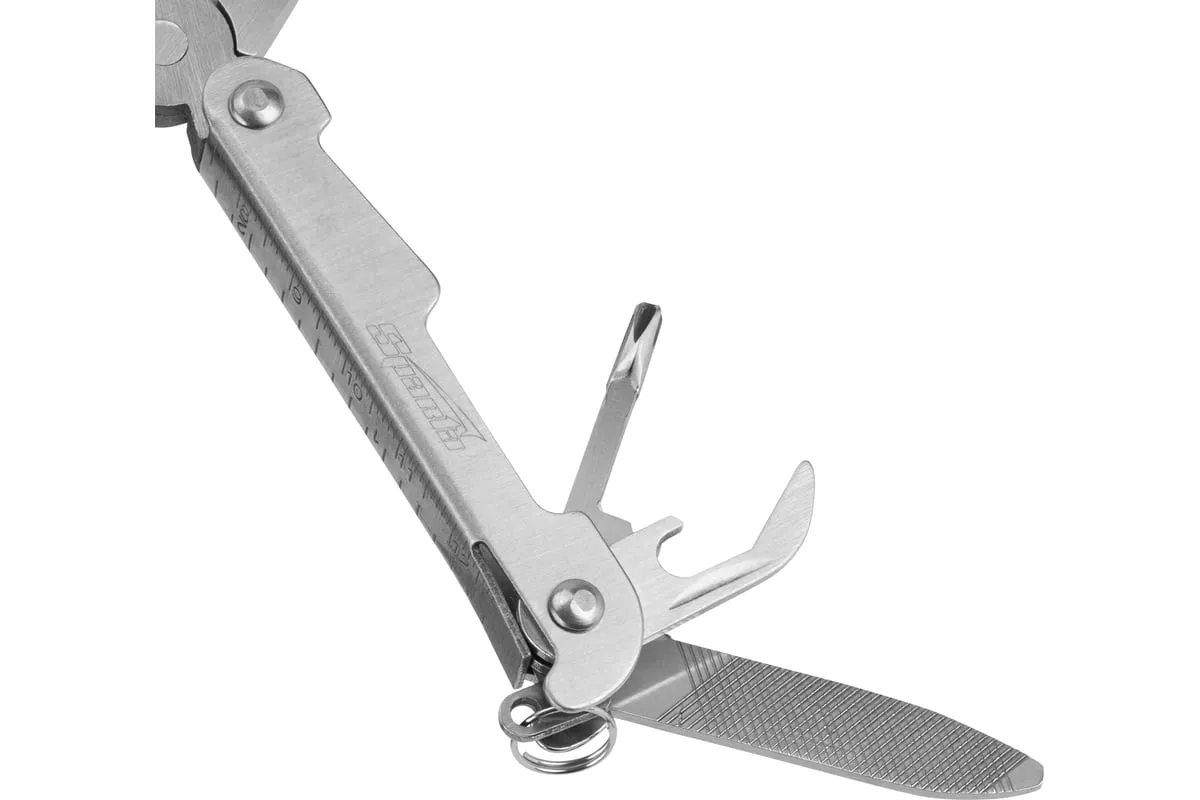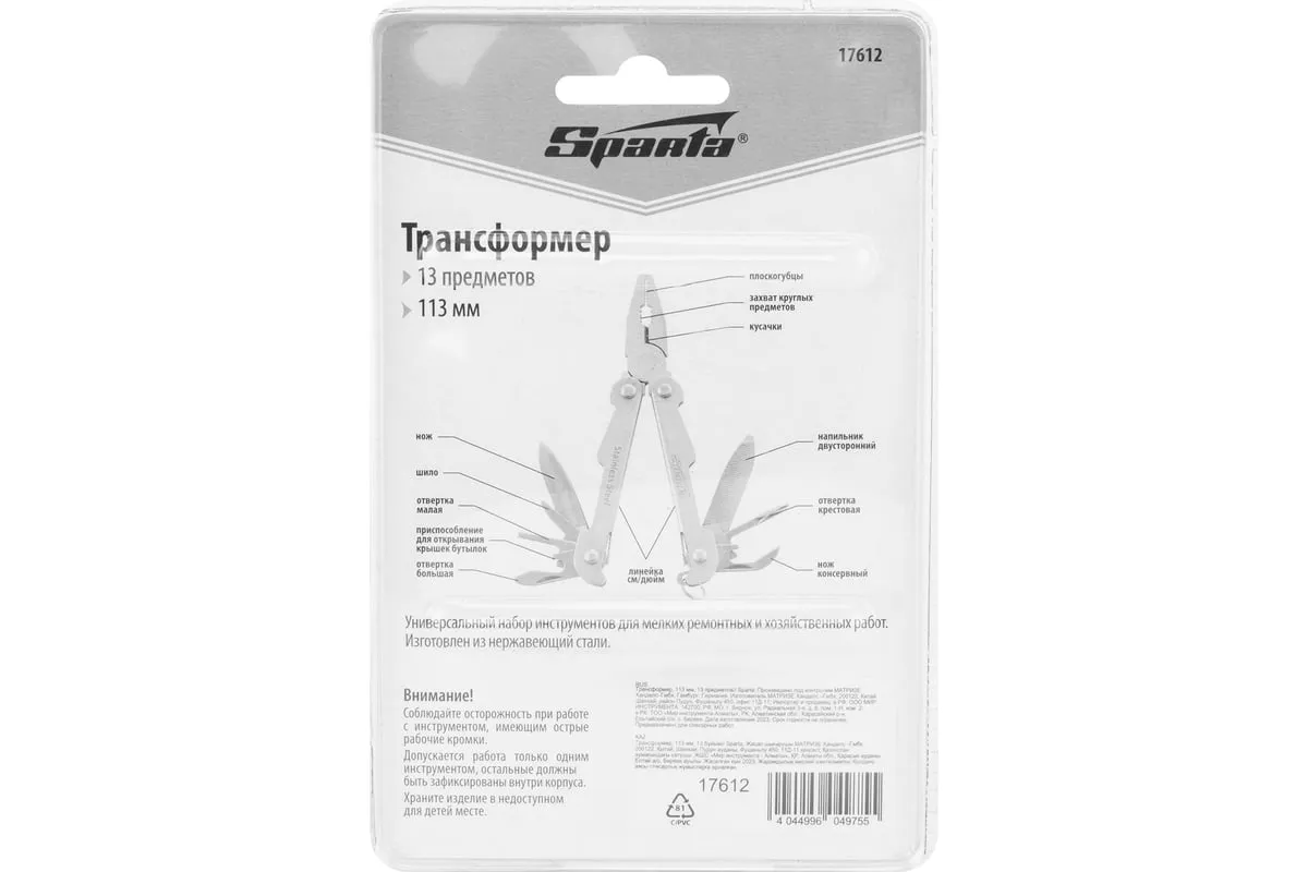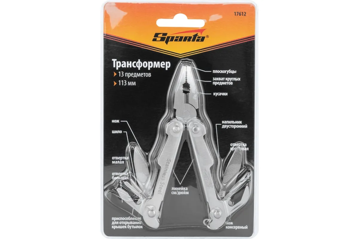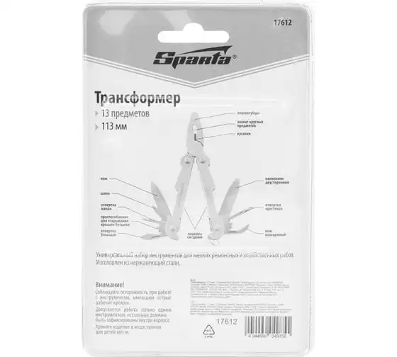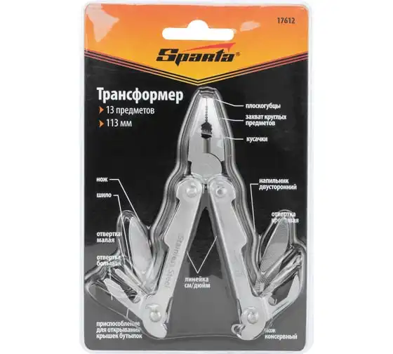 Трансформер Sparta 113 мм, 13 предметов 17612 объединяет в себе слесарные и бытовые инструменты. Пригодится дома, на даче, в походе или поездке, на рыбалке и охоте. Также он будет полезен в гараже. Компактный трансформер легко поместится в карман, сумку или рюкзак.