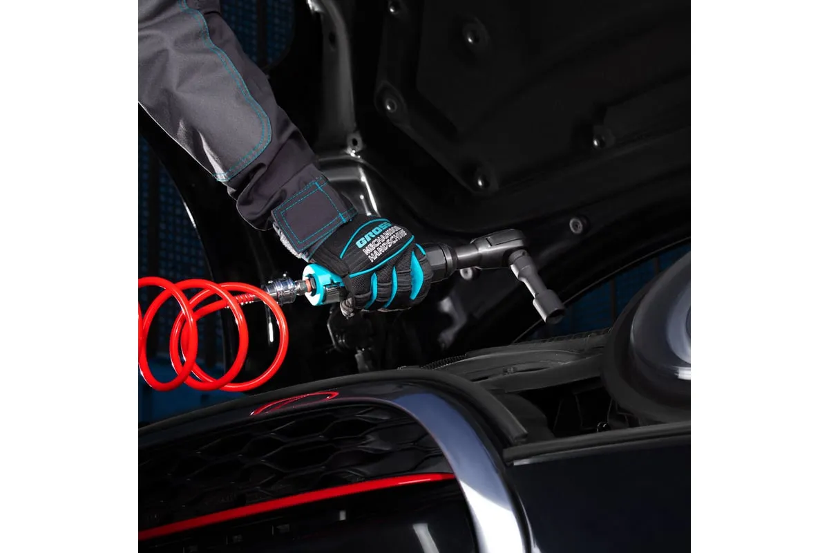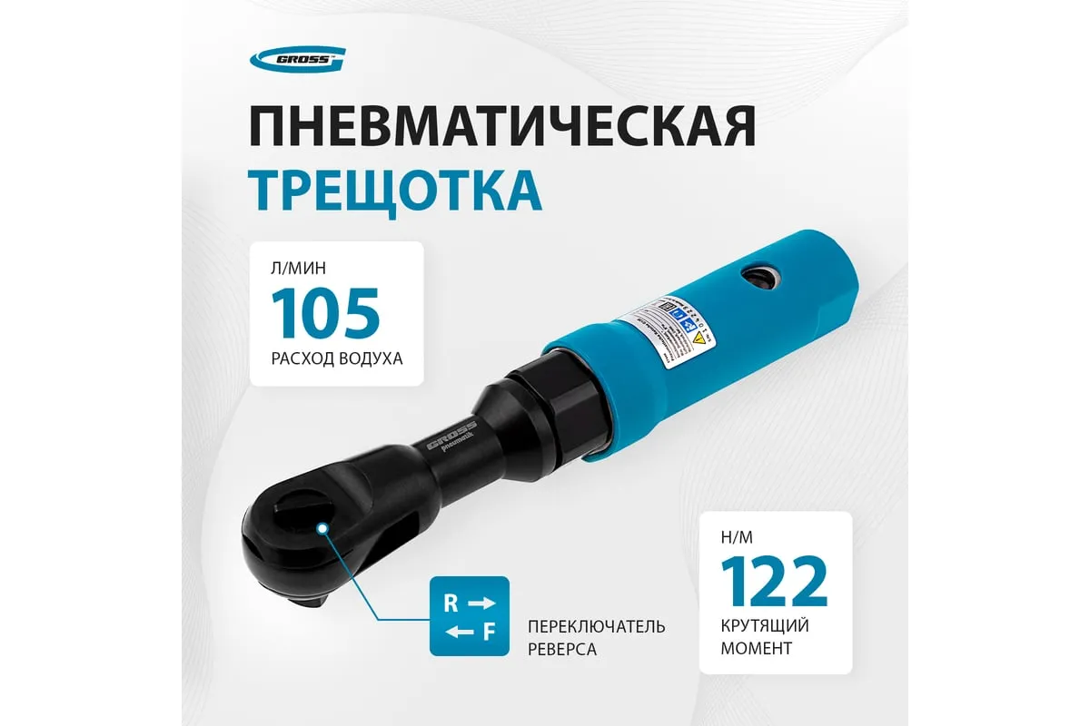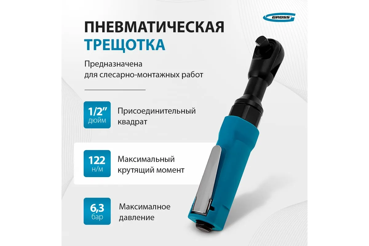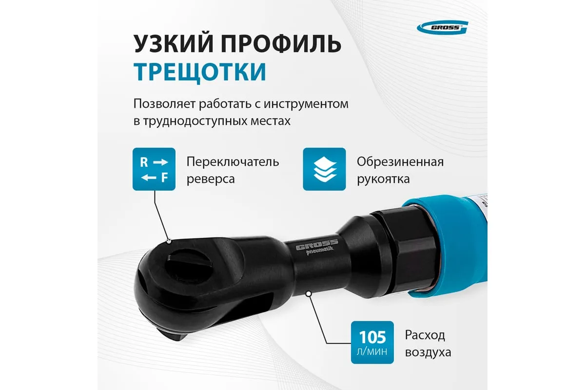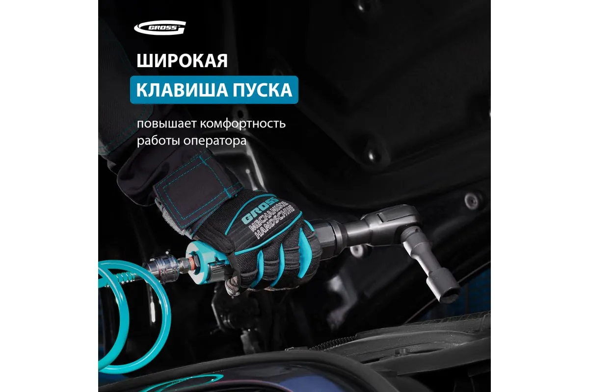 Пневматическая трещотка GROSS G120 7446 имеет узкий корпус, что позволяет работать в труднодоступных местах. Широкая клавиша "Пуск" обеспечивает удобное управление инструментом. Рукоятка снабжена резиновым покрытием, что делает рабочий процесс гораздо комфортнее.