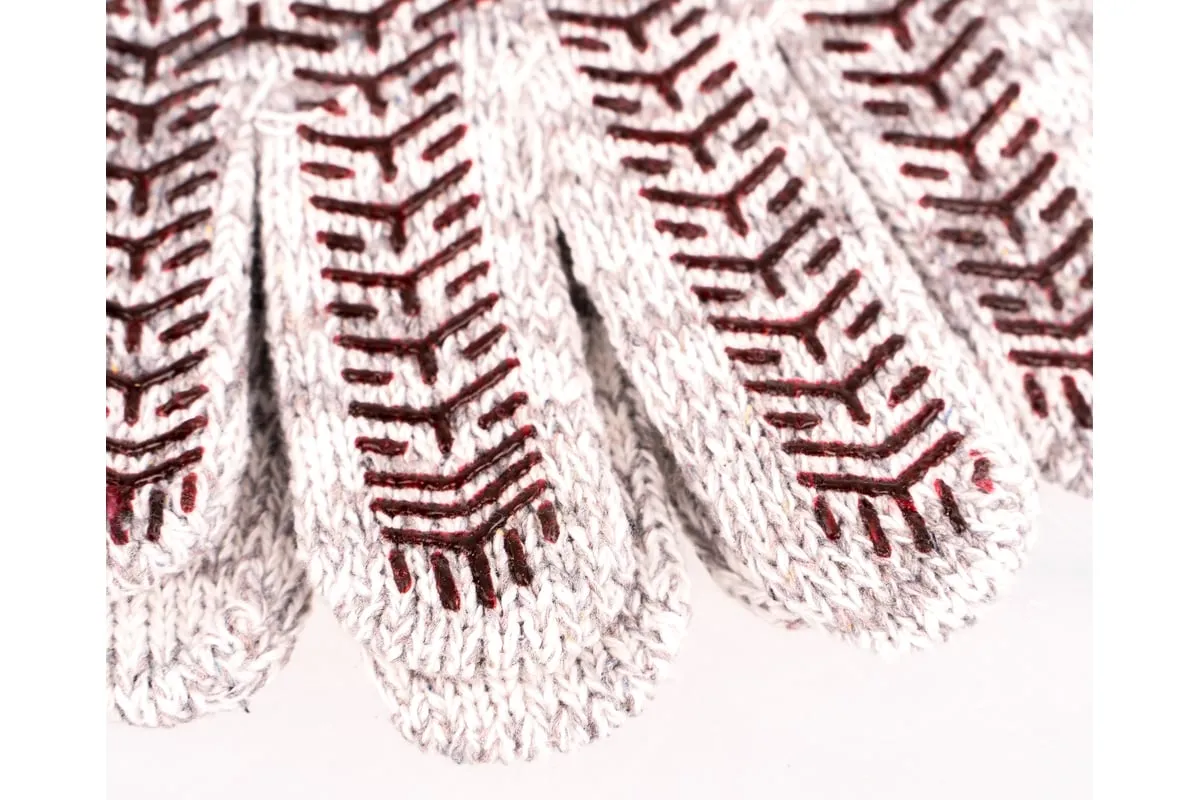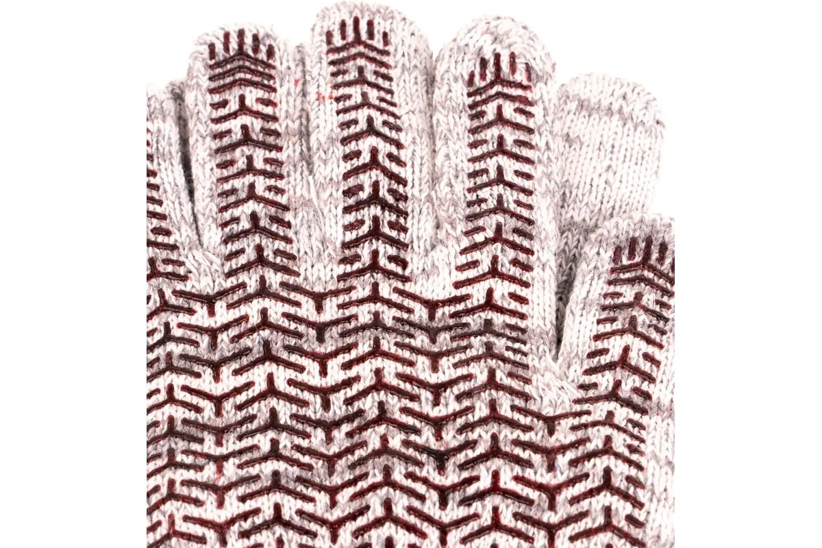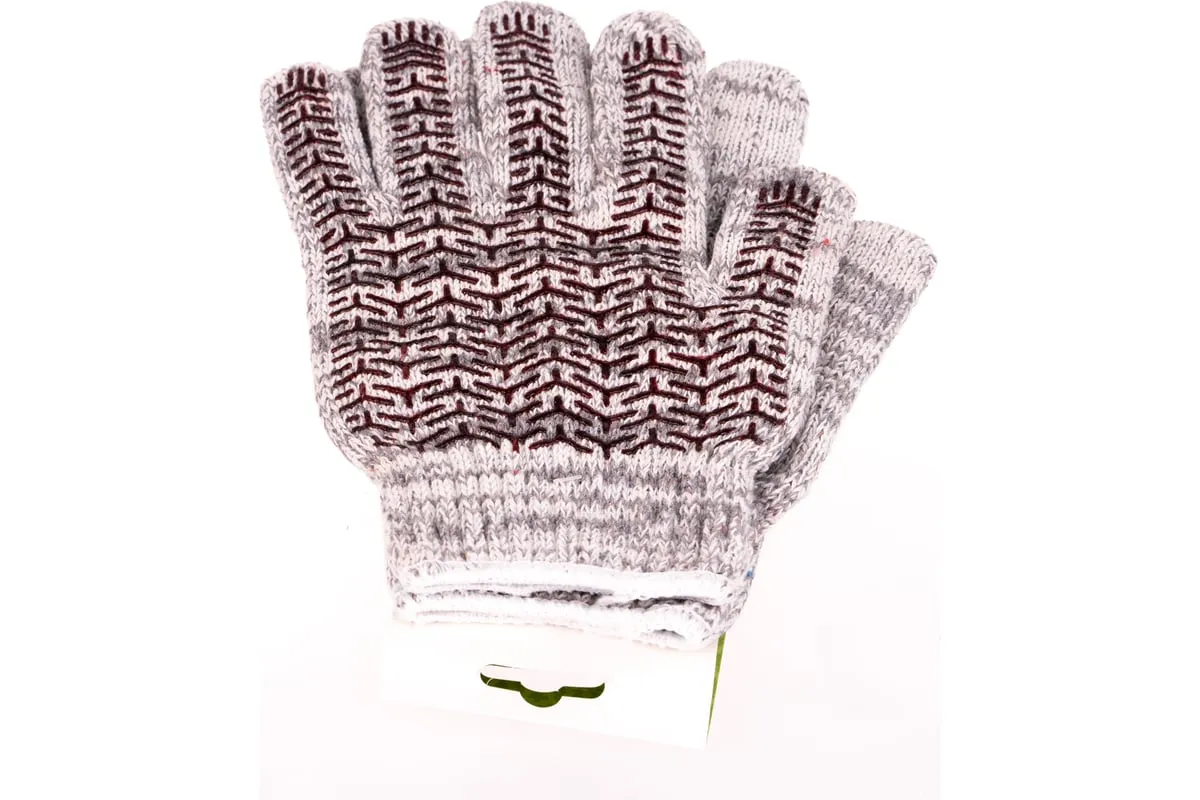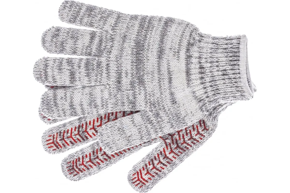 Усиленные трикотажные перчатки Сибртех 68182, бело-серый меланж, с гелевым ПВХ-покрытием, 7 класса вязки, надевают на руки при выполнении тяжелых строительных, монтажных, ремонтных, сборочных и погрузо-разгрузочных работ. Толстая эластичная пряжа надежно защищает кисти рук от травм и попадания грязи, не препятствуя движениям пальцев. Нанесенный на ладонную сторону ПВХ-гель исключает скольжение и способствует надежному захвату инструментов и других предметов.