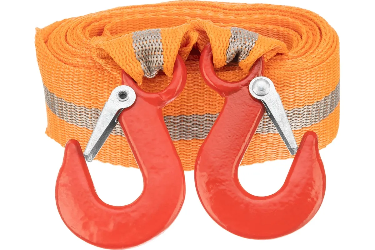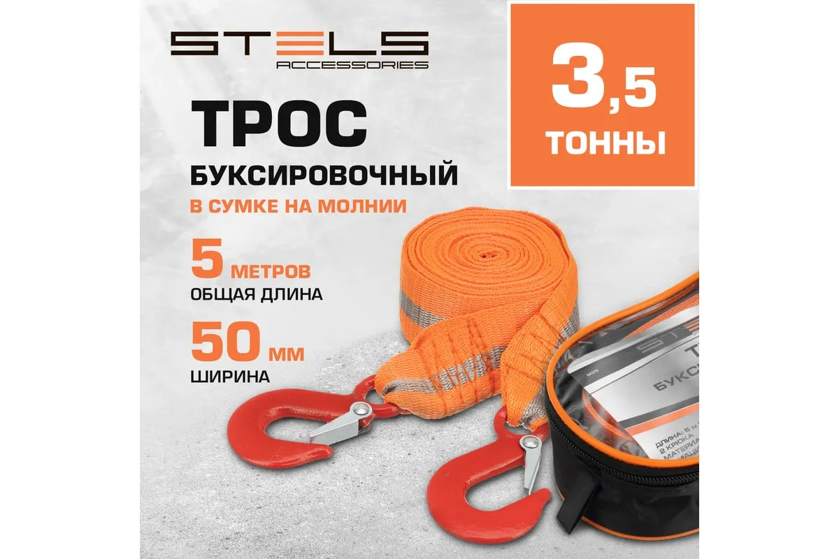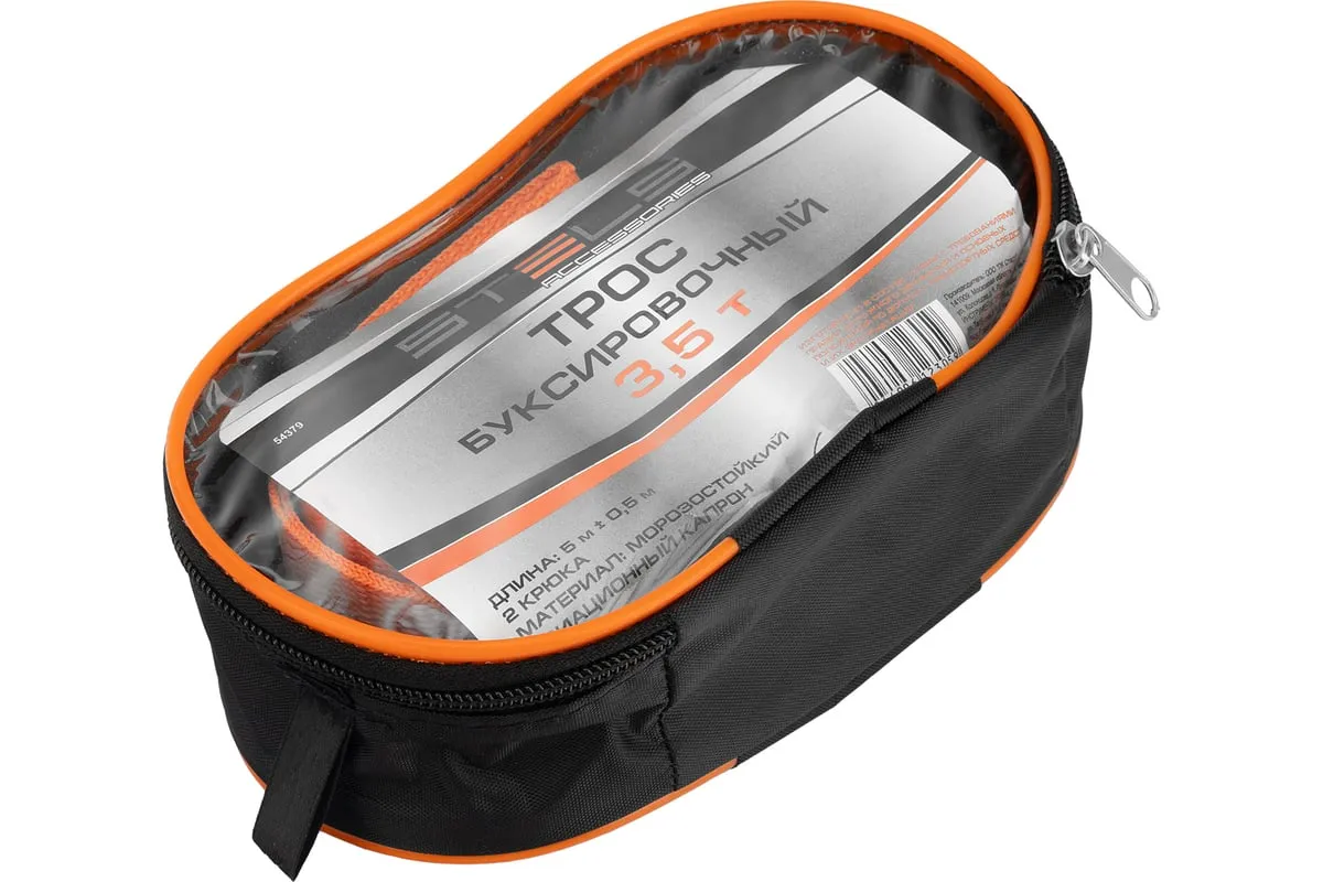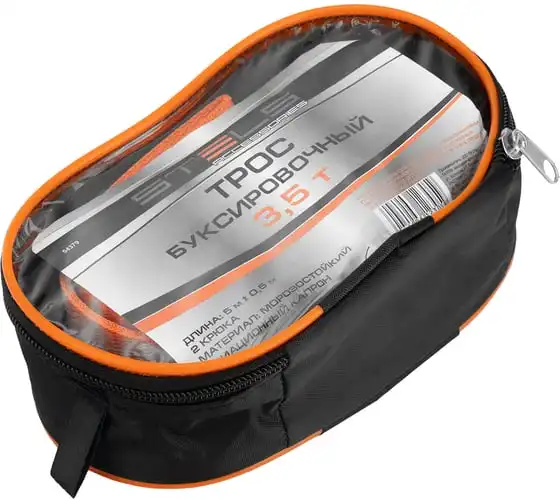 Трос буксировочный Stels 54379 с 2 крюками, поставляющийся в сумке на молнии, используется для буксировки на гибкой сцепке легковых автомобилей массой до 3,5 тонн. Выручит автолюбителя в сложной ситуации на дороге: если закончилось топливо, сломался двигатель, застряли колеса и т. д.
