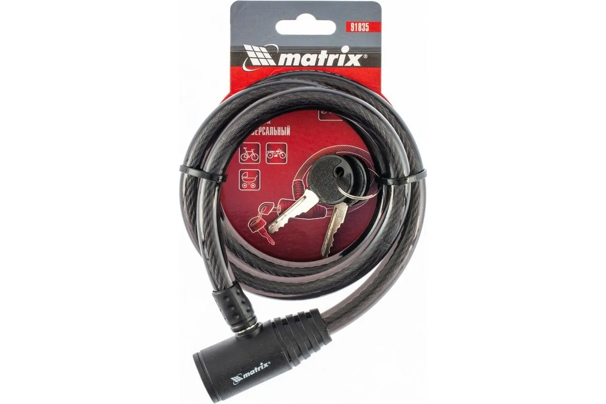 Универсальный тросовый замок 12 х 960 мм Matrix 91835 позволяет обезопасить имущество от кражи. С его помощью можно пристегнуть велосипед, мопед, коляску и т.д. к неподвижной опоре. Также его можно применять для защиты помещений от взлома. Трос весит всего 245 г и помещается в небольшую сумку, поэтому он удобен для транспортировки.