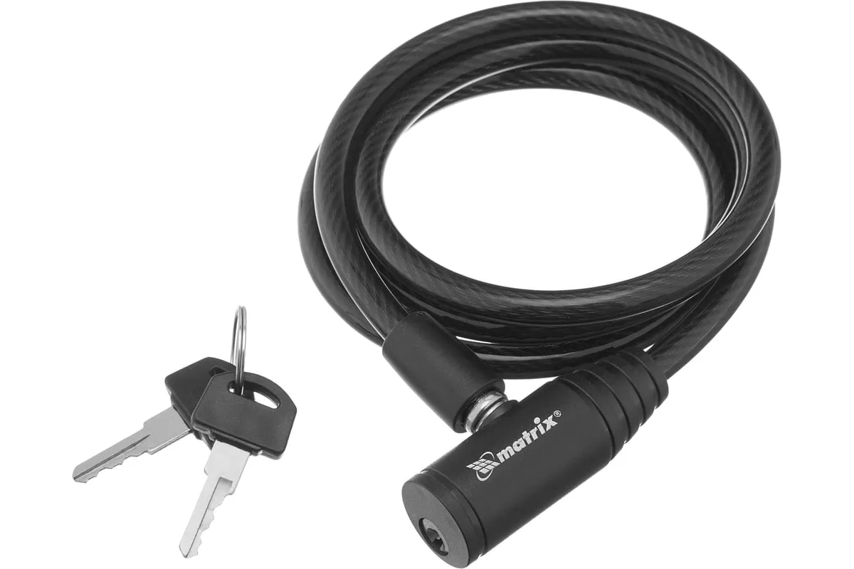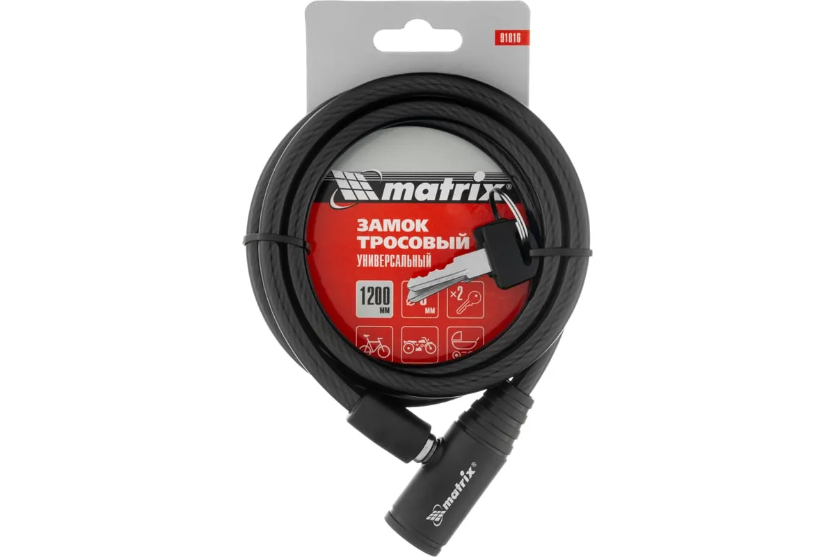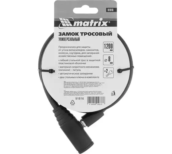 Тросовый универсальный замок MATRIX 8х1200 мм 91816 - это приспособление с автоматическим запиранием, которое предназначено для запирания помещений, а также обеспечения сохранности коляскам, велосипедам, санкам и т.д. Конструкция представляет собой стальной трос в пластиковой оболочке и механизм секретности из латуни.