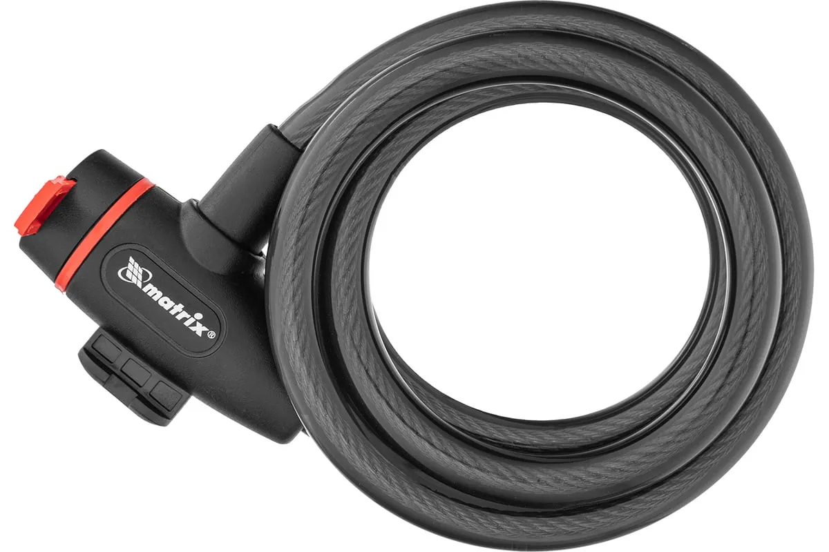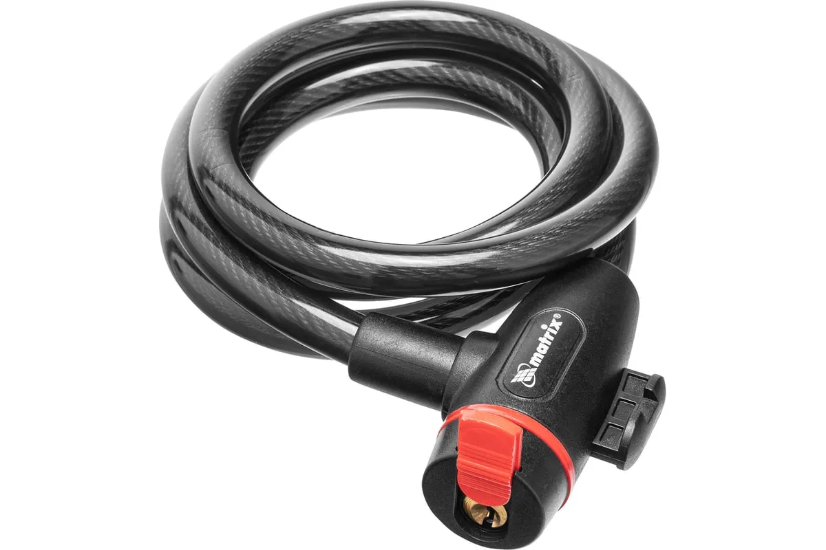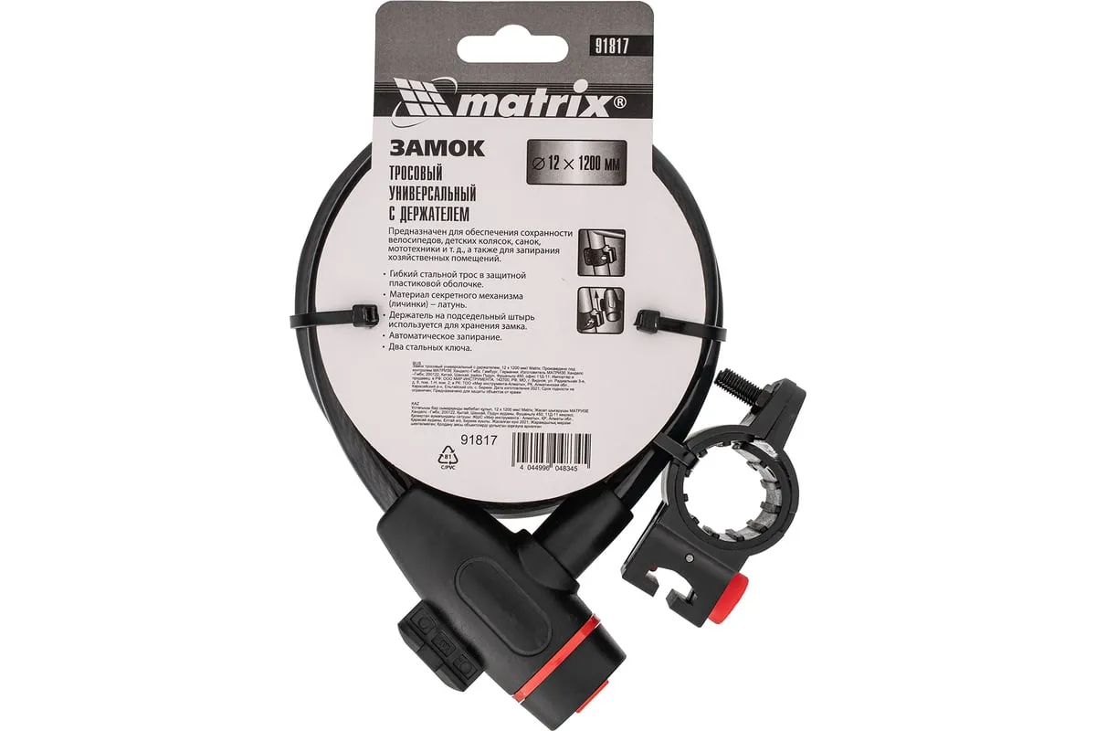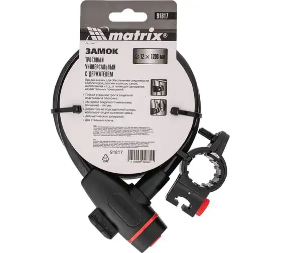Тросовый универсальный замок с держателем MATRIX 12х1200 мм 91817 обеспечивает сохранность коляскам, велосипедам, мототехнике и т.п. Также замок пригодится для запирания помещений. Гибкий трос выполнен из стали и обладает защитной пластиковой оболочкой. Замок обладает автоматическим запиранием. Изделие обладает держателем для хранения ключа.