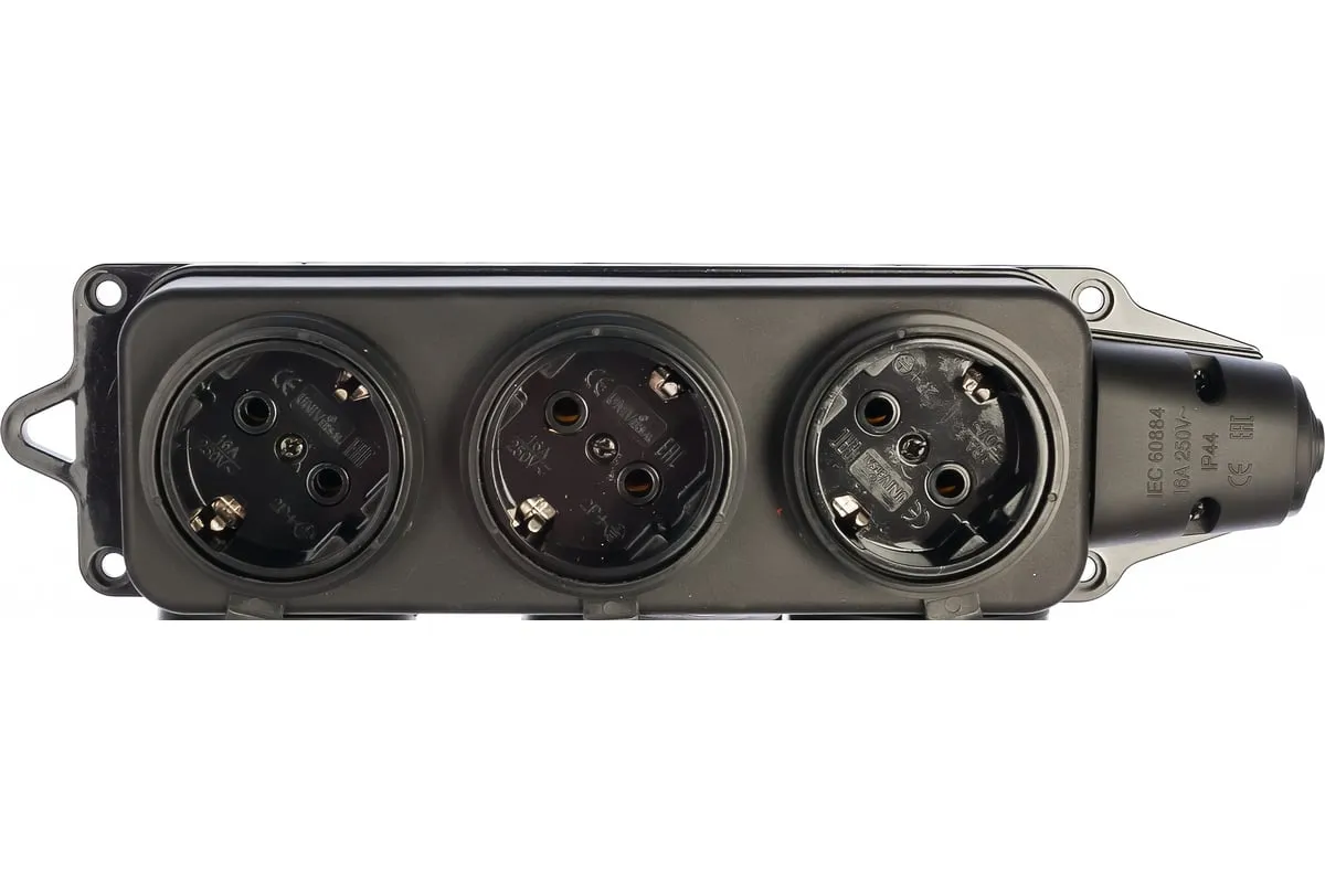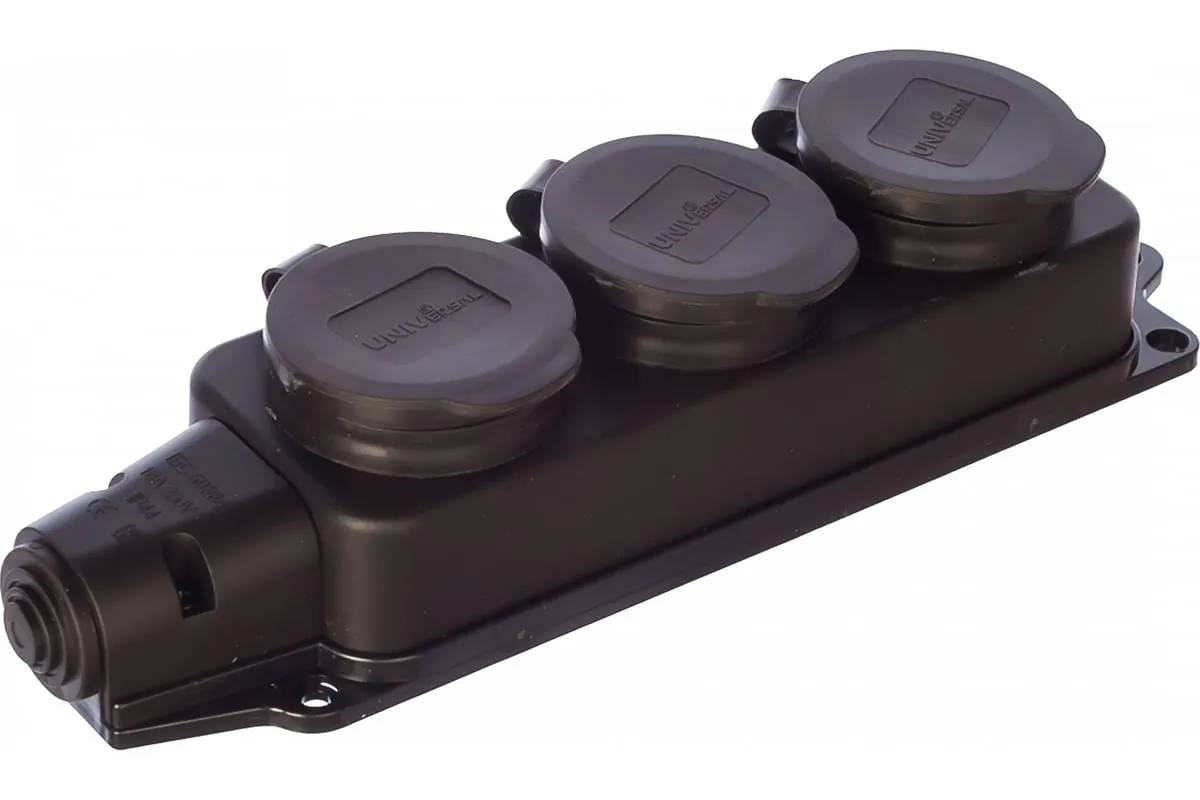 Тройная однофазная каучуковая колодка с заглушками UNIVersal 602230 - силовой разъем для создания надежных и защищенных соединений. Изделие дает возможность подключения одновременно трех электроприборов вне помещения, например: строительного оборудования, электроинструмента, приборов электроснабжения и пр.