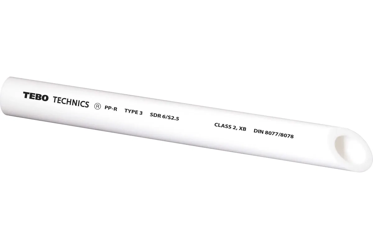Полипропиленовые трубы TEBO technics (SDR6) применяются в системах хозяйственно-питьевого назначения, горячего водоснабжения, а также в качестве технологических трубопроводов, транспортирующих жидкости и газы, не агрессивные к материалам трубы и фитингов. Изготовлены из современного материала — Polypropylene Random Copolymer («Рандом сополимер» PP-R тип 3).