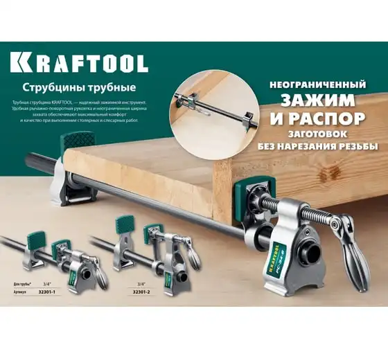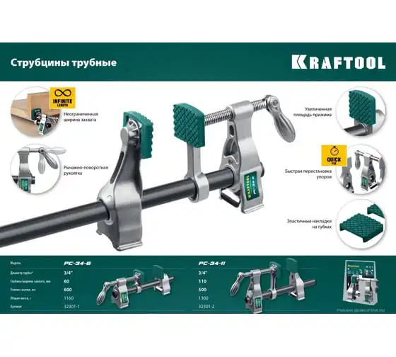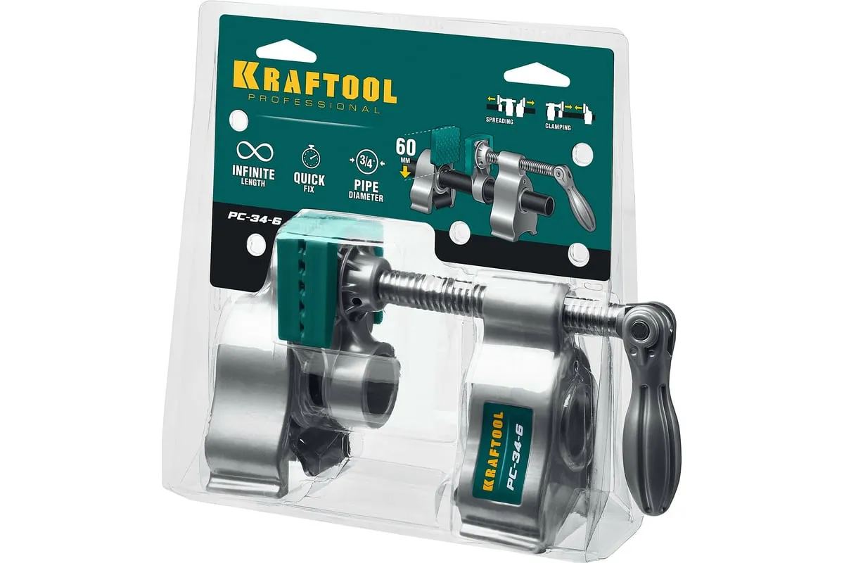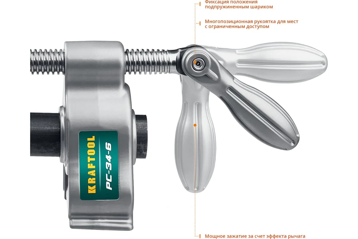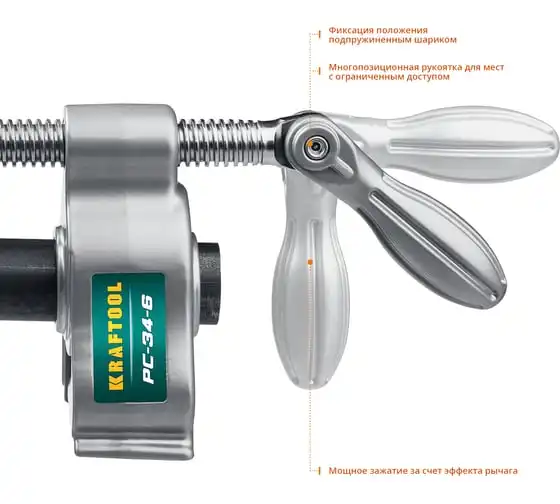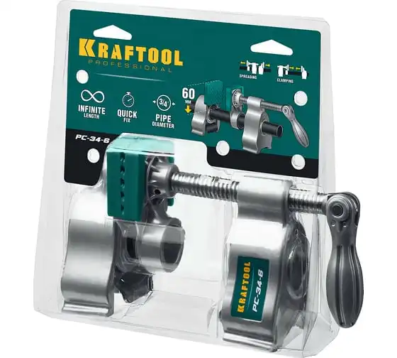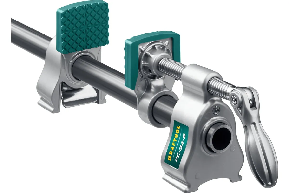 Трубная струбцина KRAFTOOL PC-34-6 3/4" 32301-1 предназначена для склеивании больших щитов, из которых обычно делают двери или столешницы. Неограниченная ширина захвата - надежный зажимной/распорный инструмент. Удобная рычажно-поворотная рукоятка, широкие ножки в основании, мягкие накладки на губки - обеспечивают максимальный комфорт при выполнении работ. Усилие - до 600 кг