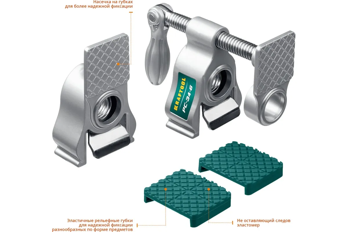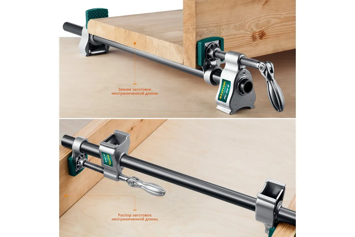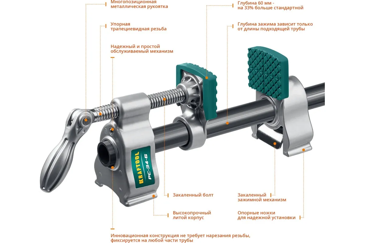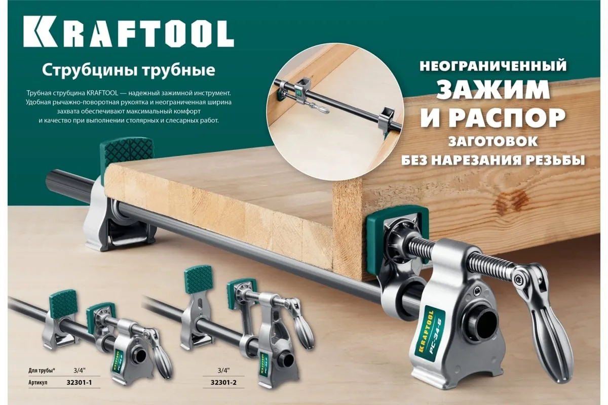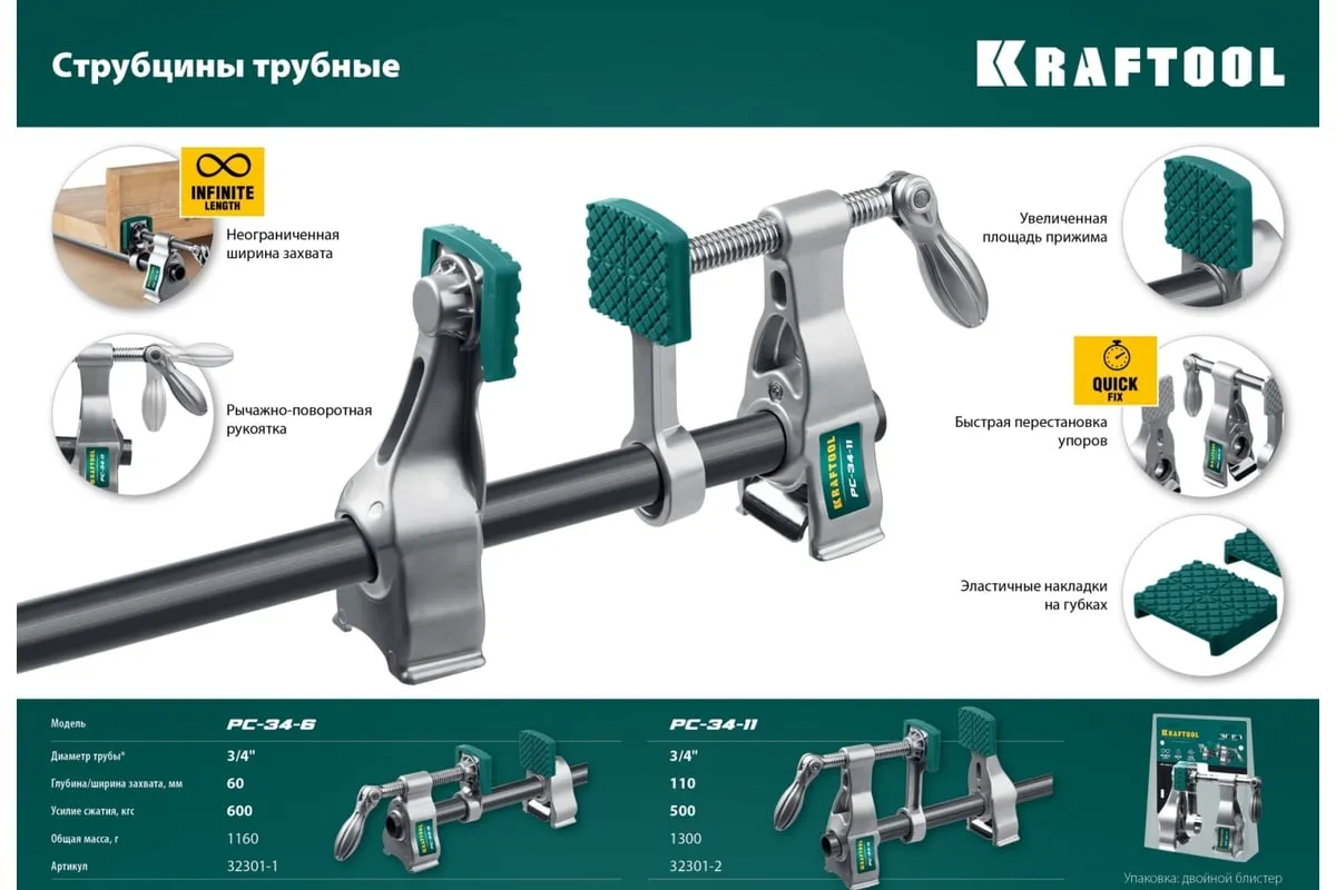 Трубная струбцина KRAFTOOL PC-34-6 3/4" 32301-1 предназначена для склеивании больших щитов, из которых обычно делают двери или столешницы. Неограниченная ширина захвата - надежный зажимной/распорный инструмент. Удобная рычажно-поворотная рукоятка, широкие ножки в основании, мягкие накладки на губки - обеспечивают максимальный комфорт при выполнении работ. Усилие - до 600 кг