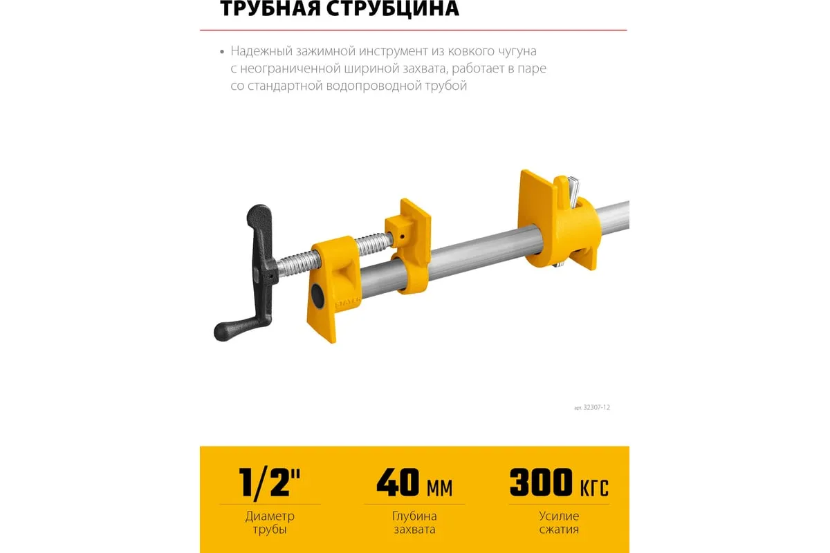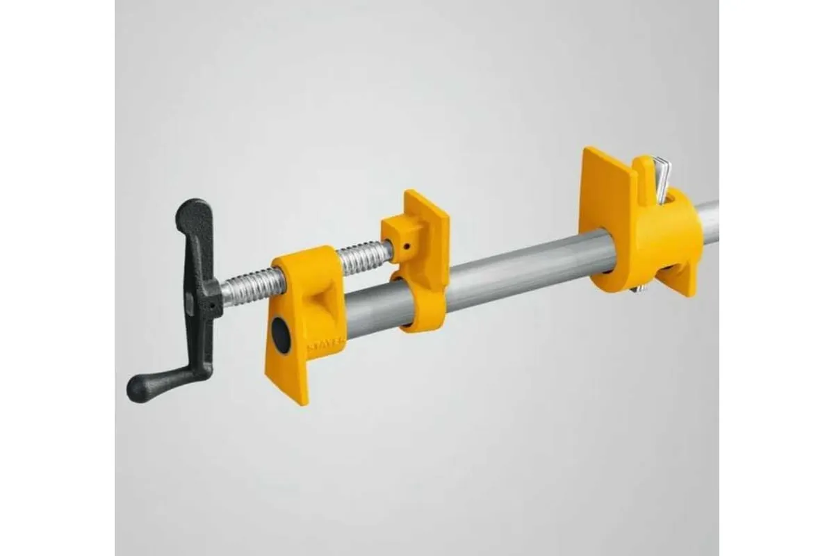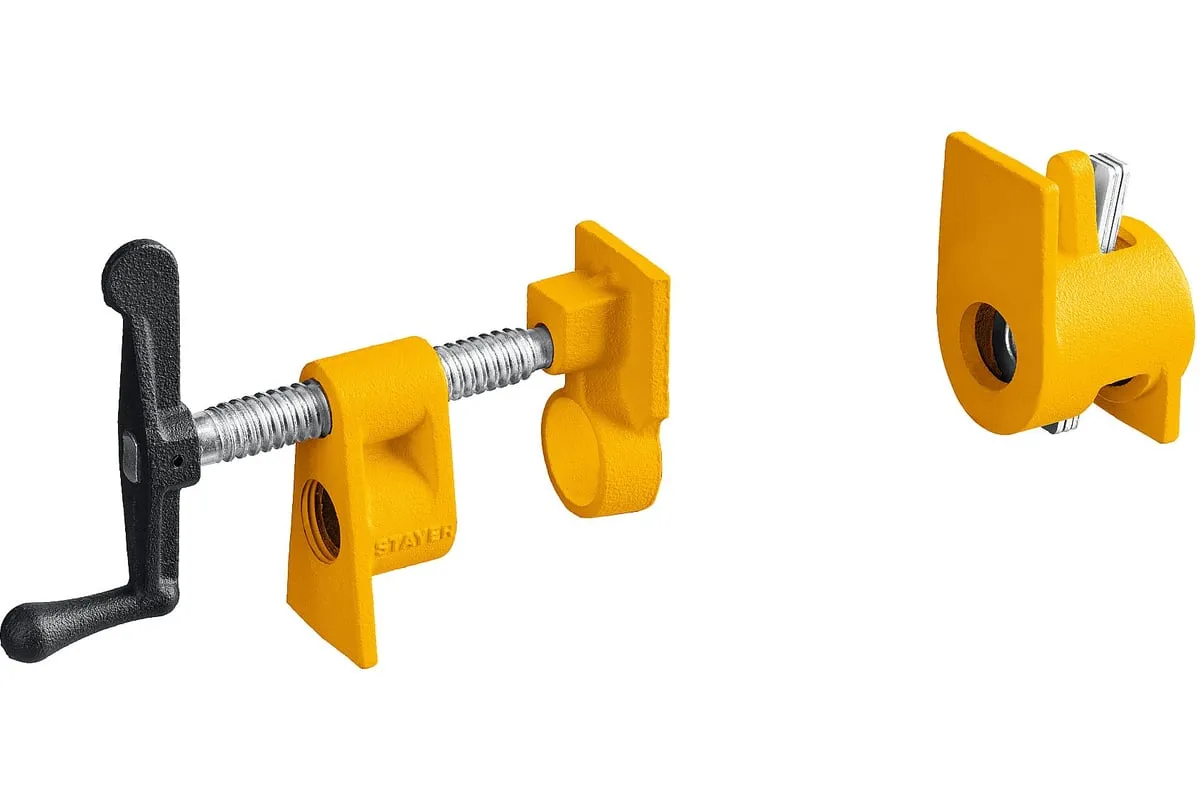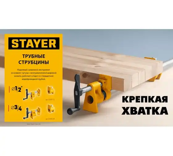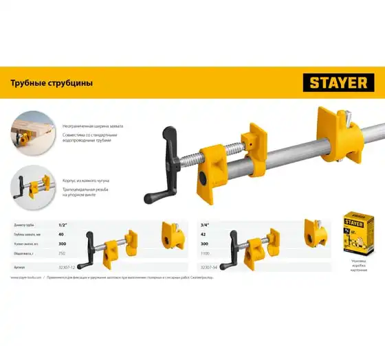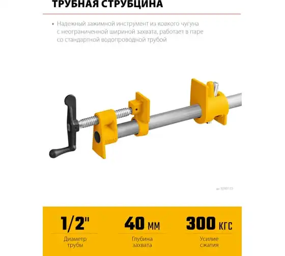 Трубная струбцина предназначена для быстрой и надежной фиксации заготовок и деталей из дерева, металла или пластика. Используется в столярном и слесарном деле, когда есть необходимость скрепить детали между собой для склейки или зафиксировать их к поверхности для сверления или шлифовки. Приспособление закрепляется на стандартной дюймовой трубе, ширина захвата зависит только от расстояния, на котором закреплены упорные площадки на трубе. Корпус изготовлен из ковкого чугуна с порошковым покрытием. Благодаря Т-образной рукоятке и прочному винтовому механизму инструмент позволяет надежно фиксировать различные предметы вручную.