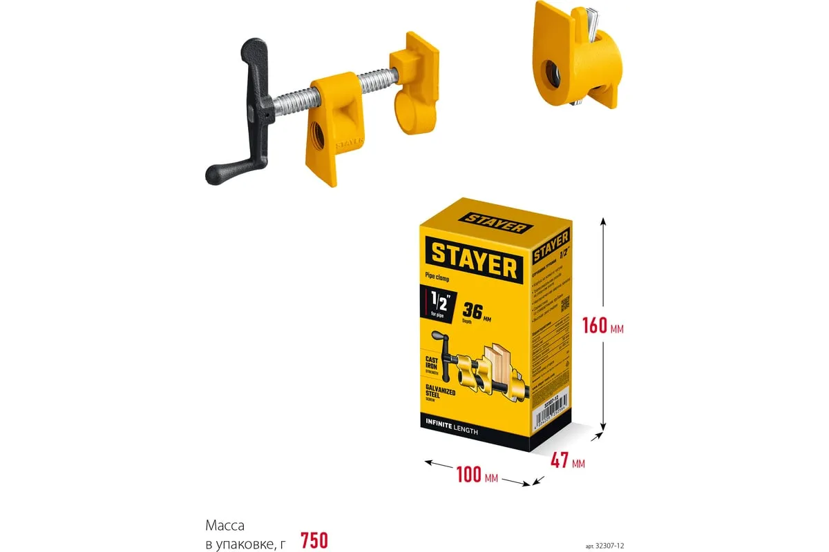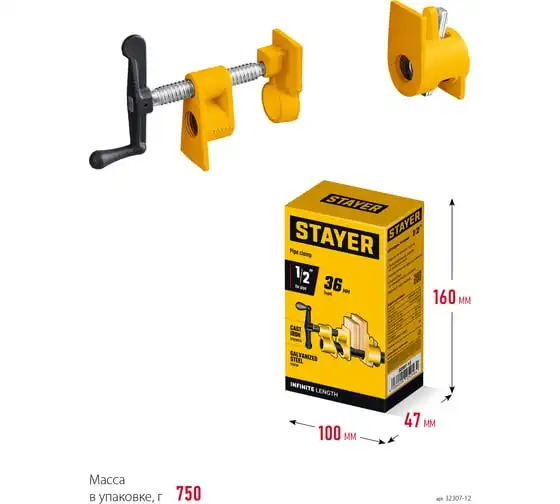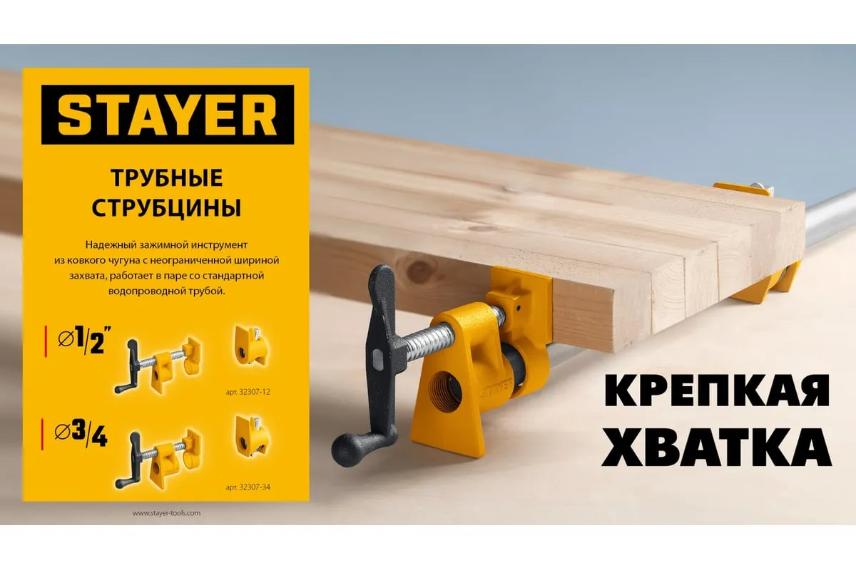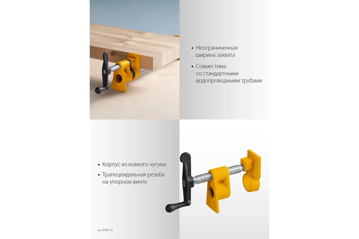 Трубная струбцина предназначена для быстрой и надежной фиксации заготовок и деталей из дерева, металла или пластика. Используется в столярном и слесарном деле, когда есть необходимость скрепить детали между собой для склейки или зафиксировать их к поверхности для сверления или шлифовки. Приспособление закрепляется на стандартной дюймовой трубе, ширина захвата зависит только от расстояния, на котором закреплены упорные площадки на трубе. Корпус изготовлен из ковкого чугуна с порошковым покрытием. Благодаря Т-образной рукоятке и прочному винтовому механизму инструмент позволяет надежно фиксировать различные предметы вручную.