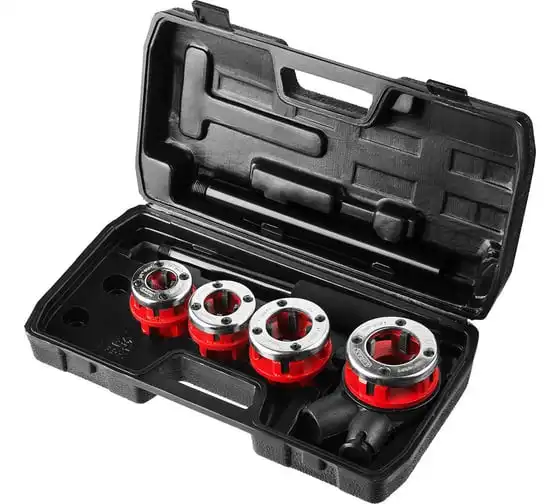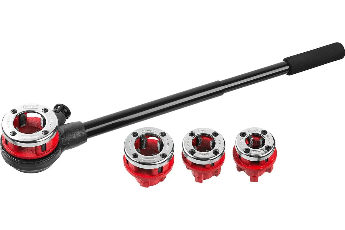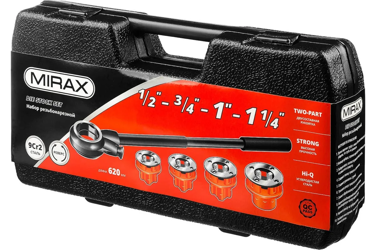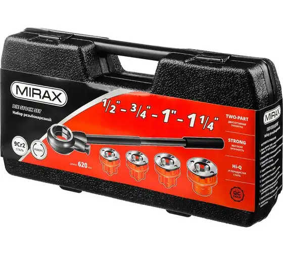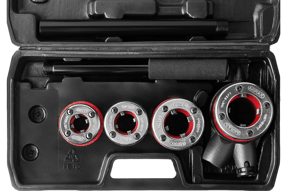 Трубный резьбонарезной набор №4 MIRAX 5 предметов 28240-H4 применяется для нарезания трубной конической трубы. В состав набора входят самые востребованные размеры клуппов для нарезания резьбы на металлических трубах. Резцы изготовлены из высококачественной углеродистой стали для ровного реза резьбы. Также в наборе имеется двухкомпонентная ручка трещотки с реверсом для более удобного использования. В прочном пластиковом кейсе набор удобно хранить и транспортировать.