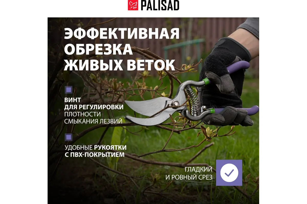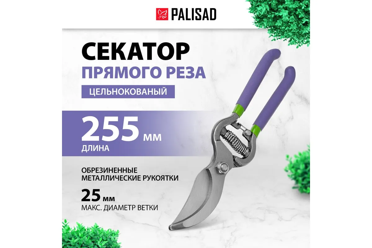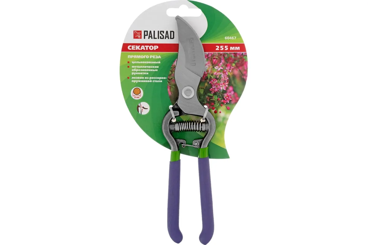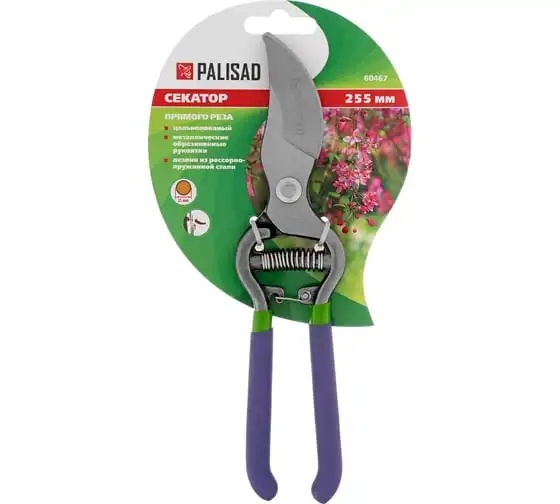 Цельнокованый секатор прямого реза Palisad 60467 длиной 255 мм, с металлическими обрезиненными рукоятками, используется для срезания живых веток диаметром до 25 мм. Движущиеся в параллельных плоскостях лезвия легко и быстро отсекают ветку, минимально повреждая растение. Плотность смыкания лезвий можно отрегулировать вращением винта. Секатор пригодится на загородном участке.