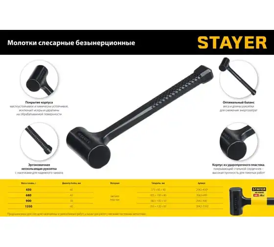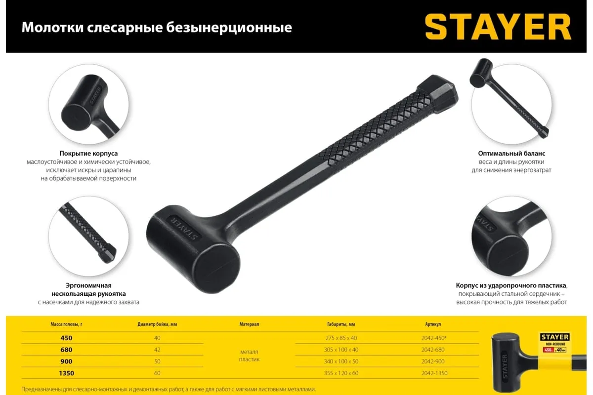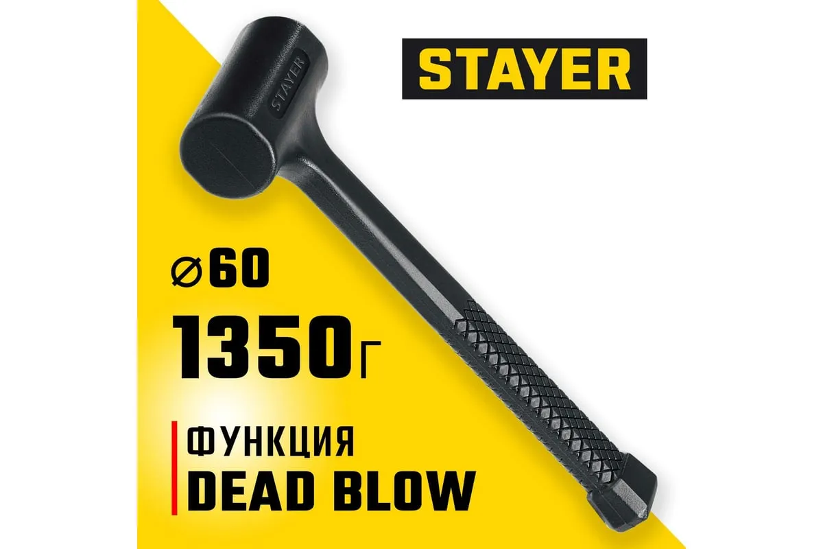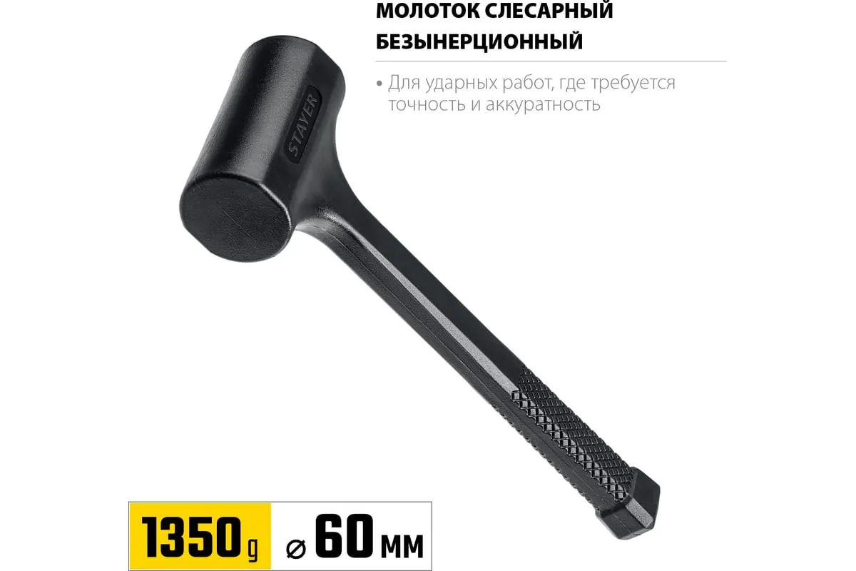 Цельнолитой безынерционный молоток STAYER 1350 г, 60 мм 2042-1350 используется для ударных работ, где требуется точность и аккуратность. Функция DEAD BLOW предотвращает отскок при ударе, повышает контроль и увеличивает мощность. Инструмент предназначен для слесарно-монтажных и демонтажных работ, а также для работ с мягкими листовыми материалами. Покрытие корпуса масло- и химически устойчивое, исключает искры и царапины на обрабатываемой поверхности.