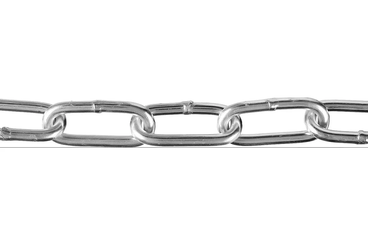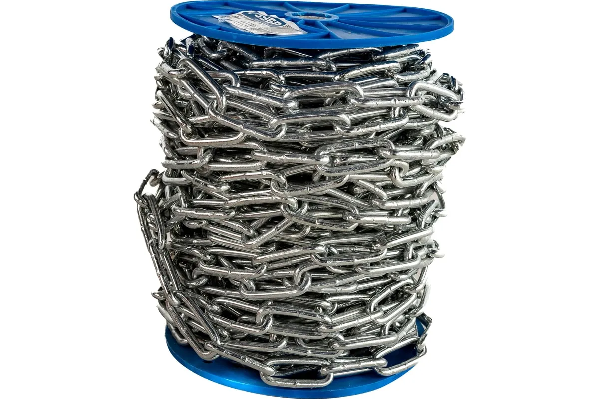 Цепь длиннозвенная Зубр 4-304030-06 предназначена для перемещения грузов и их подъема на нужную высоту с помощью различных грузоподъемных устройств. Она изготовлена из оцинкованной углеродистой стали с помощью сварки. Цепь можно легко укорачивать до нужного размера путем образования петли, вставляя звено в звено. Не предназначена для ударных нагрузок. Характеристики: