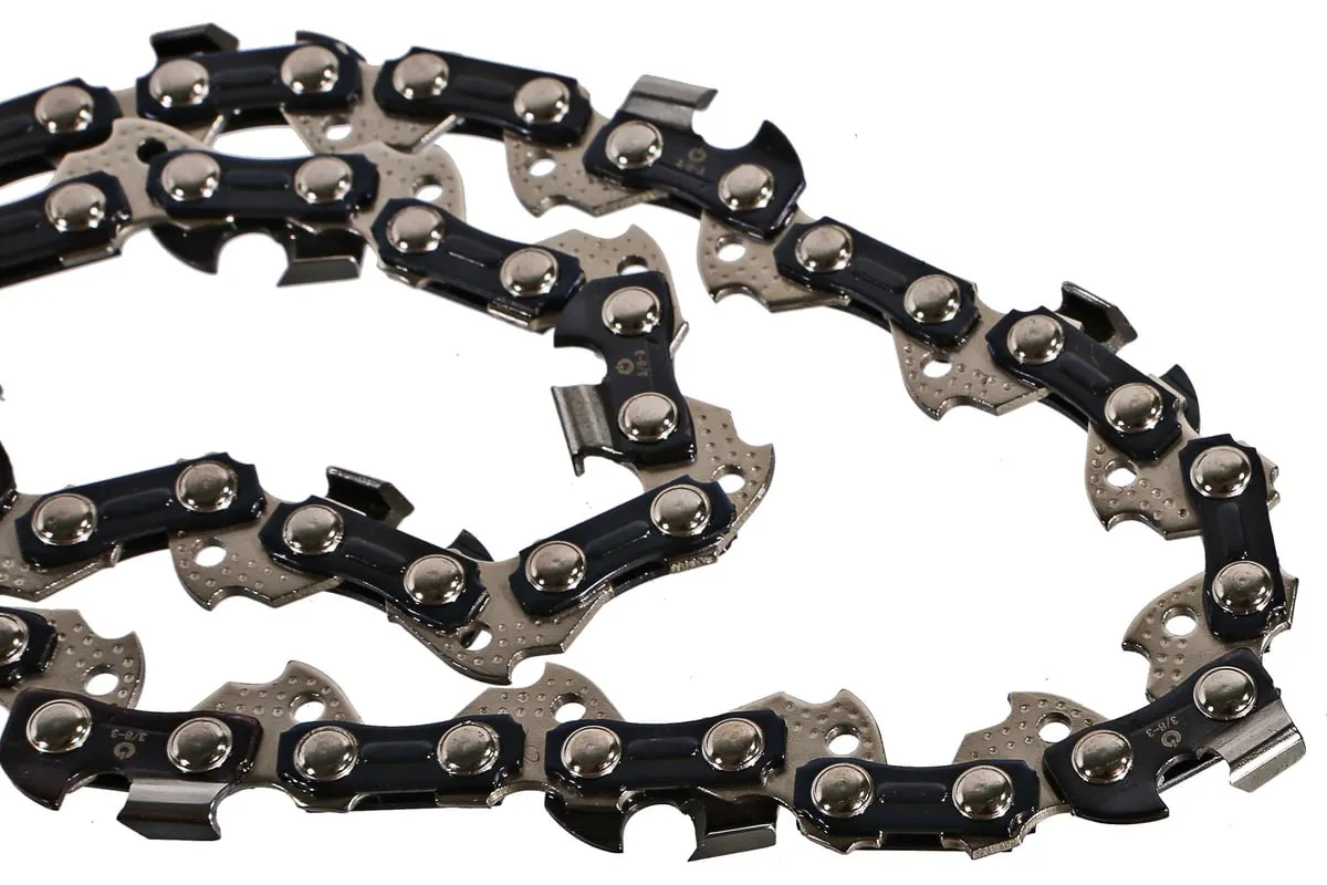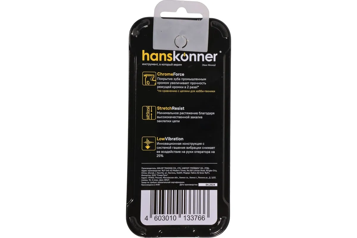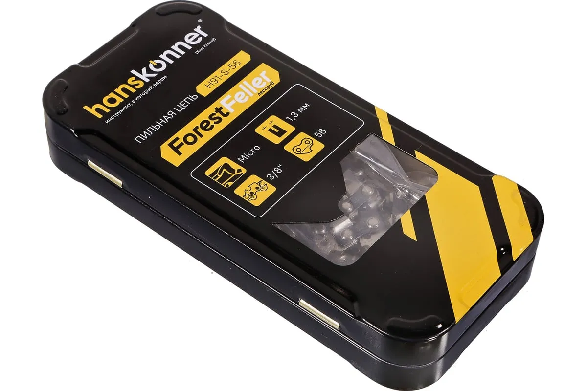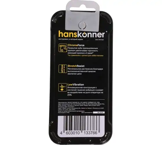 Покрытие зуба промышленным хромом увеличивает прочность режущей кромки в 2 раза. Минимальное растяжение благодаря высококачественной закалке заклепки цепи. Инновационная конструкция с системой гашения вибрации снижает ее воздействие на руки оператора на 25%. Удобный металлический кейс для хранения и транспортировки цепи, метизов.