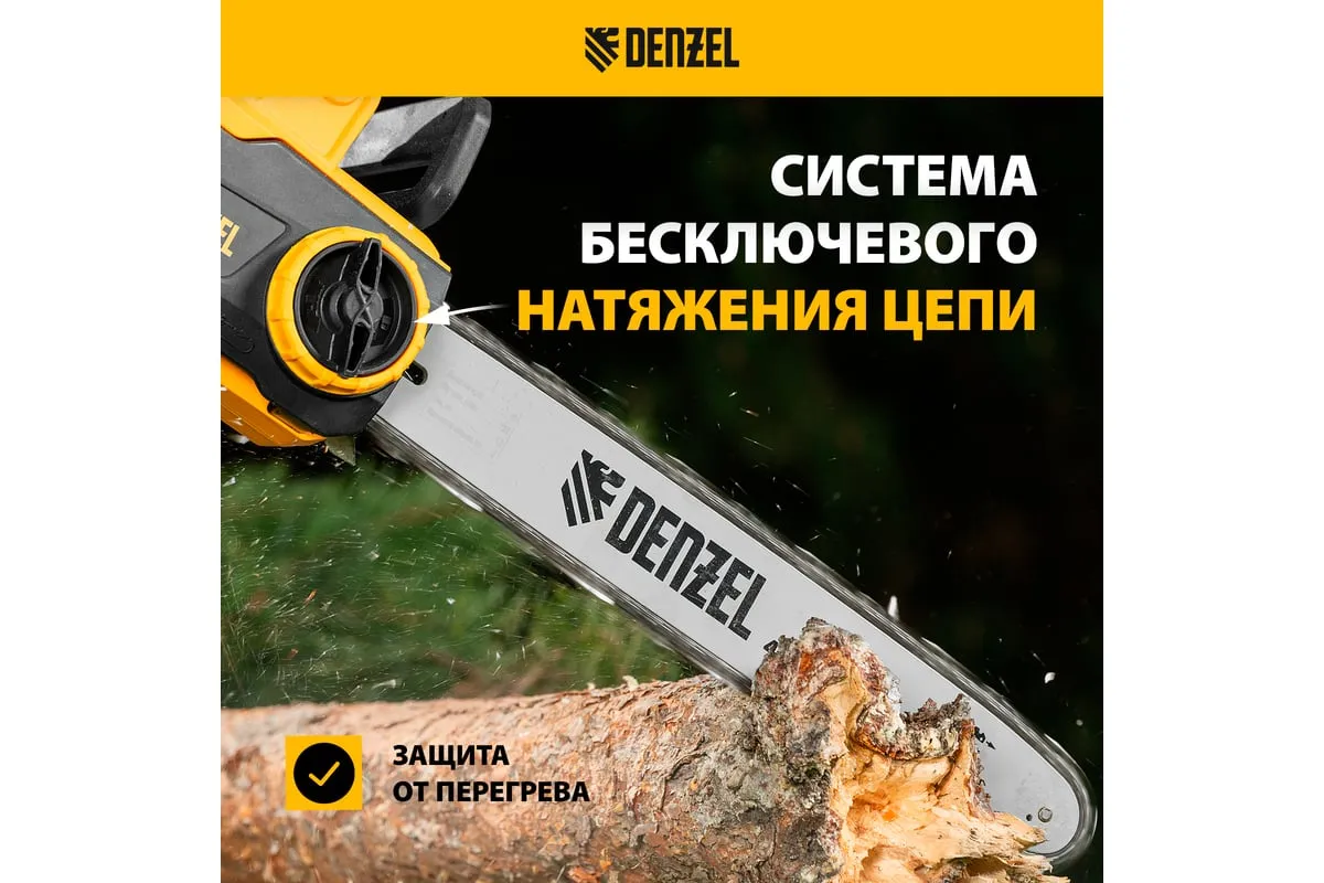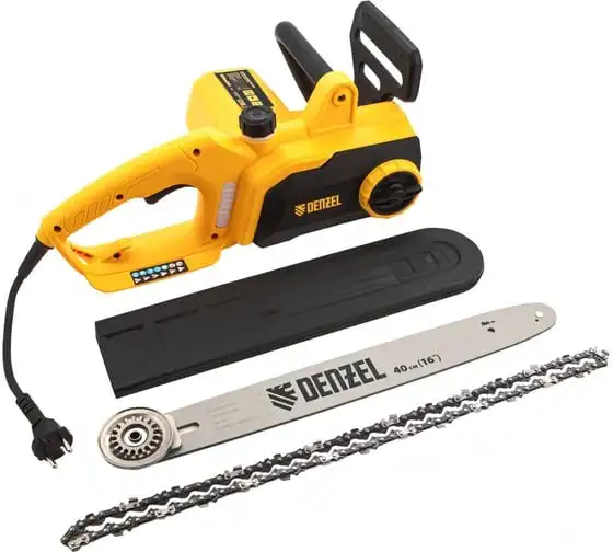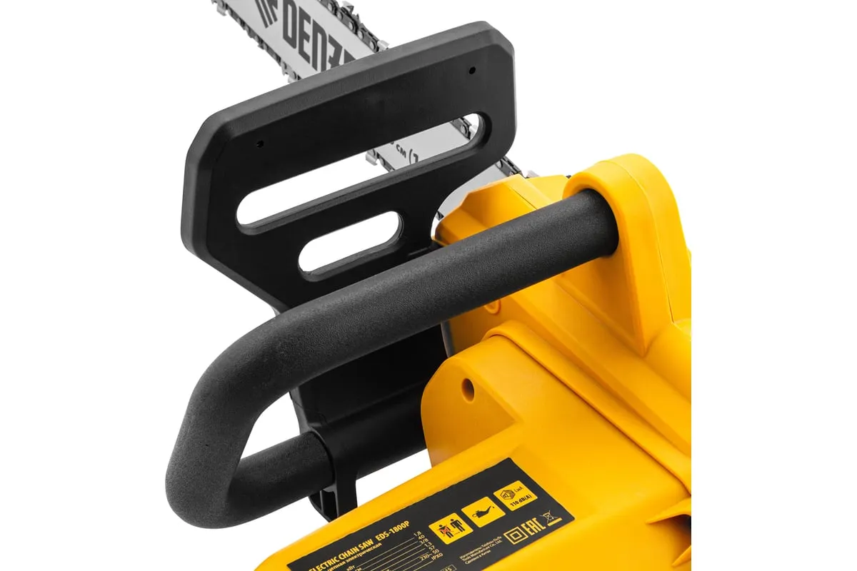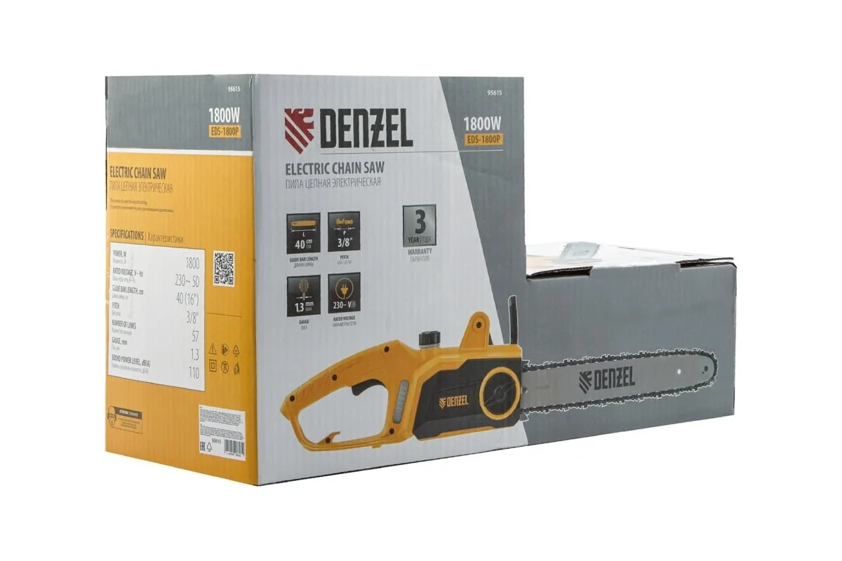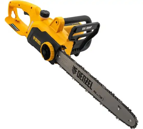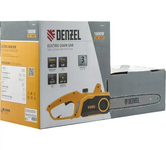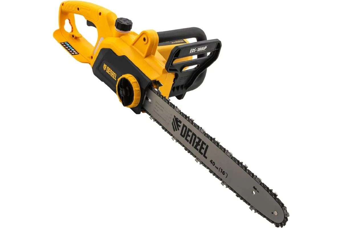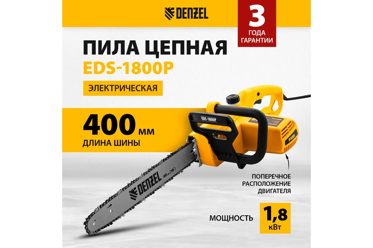 Цепная электрическая пила DENZEL EDS-1800P 95615 оснащена электромотором мощностью 1.8 кВт, который обеспечивает ровный распил различных пород древесины. Шина длиной 40 см справится с валкой деревьев, подравниванием ветвей, заготовкой дров и т.д.