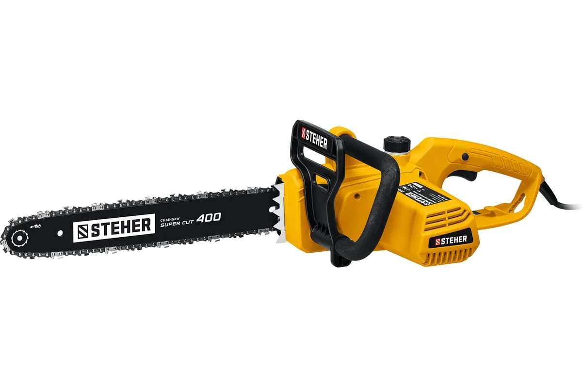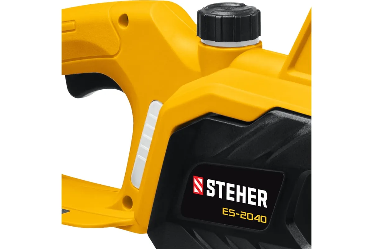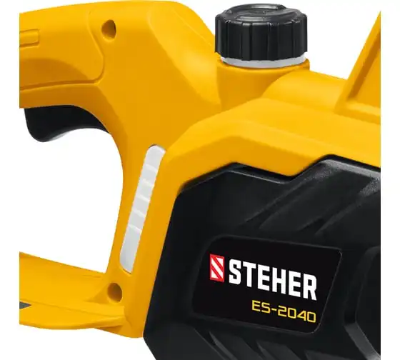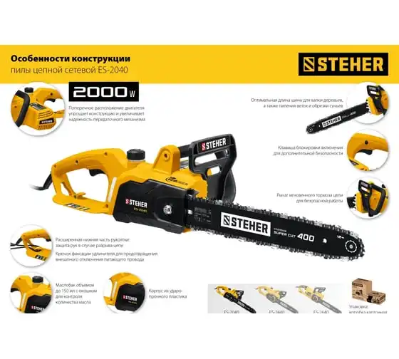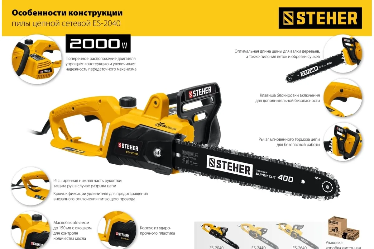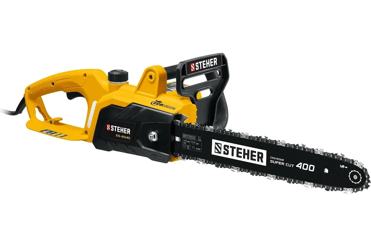 Цепная электрическая пила STEHER 2000 Вт ES-2040 применяется для валки деревьев, а так же пиления веток, обрезки сучьев, пиления деревянных балок, досок и тому подобное. Поперечное расположение двигателяупрощает конструкцию и увеличивает надежность передаточного механизма. Шина длиной 40 см позволяет распиливать заготовки большого диаметра. Основной тормоз мгновенного действияобеспечивает высокую безопасность работы. Автоматическая система смазки цепи дозировано подает масло в зависимости от нагрузки. Термопредохранитель для защиты двигателя от перегрузки при тяжелой работе. Уловитель цепи и клавиша блокировки включения для дополнительной безопасности. Крючок фиксации удлинителя для исключения чрезмерного натяжения и внезапного отключения питающего провода. Для работы с инструментом дополнительно требуется приобрести масло (рекомендуем ЗУБР ЗМПМ) и удлинитель-шнур (сечение провода не менее 1 мм²).