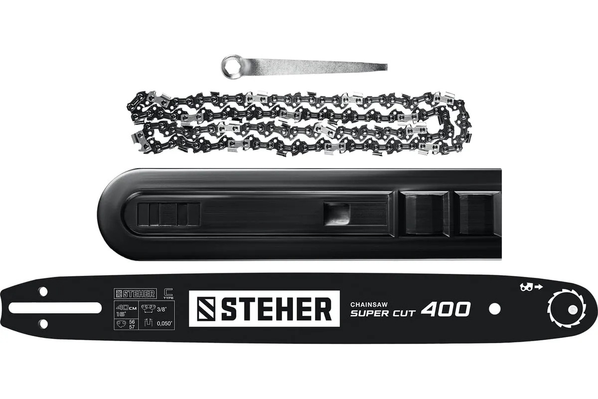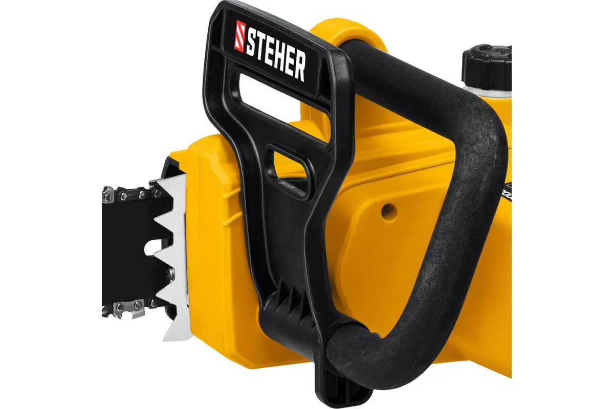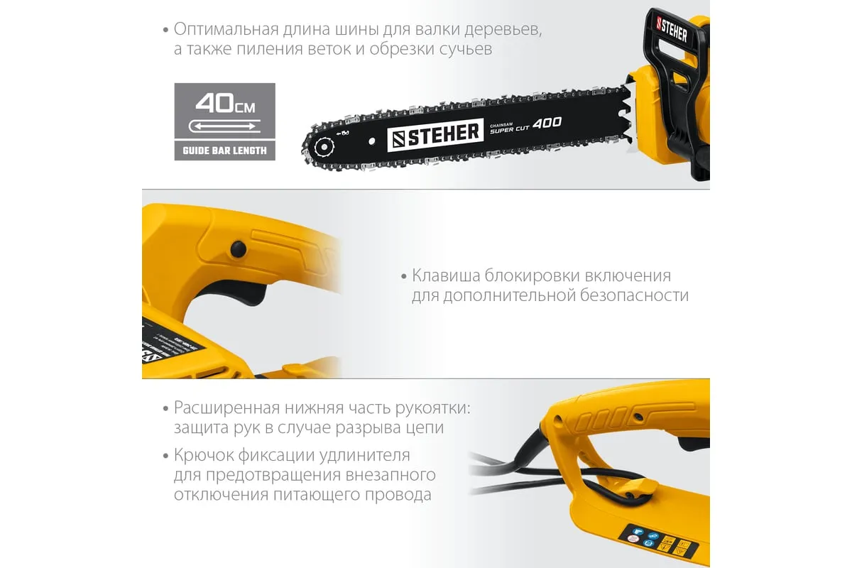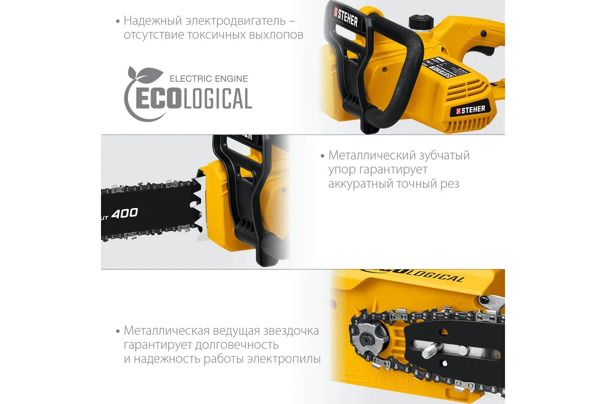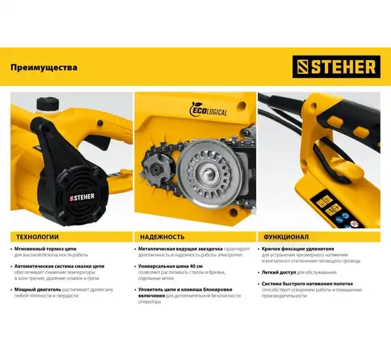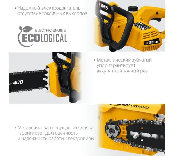 Цепная электрическая пила STEHER 2000 Вт ES-2040 применяется для валки деревьев, а так же пиления веток, обрезки сучьев, пиления деревянных балок, досок и тому подобное. Поперечное расположение двигателяупрощает конструкцию и увеличивает надежность передаточного механизма. Шина длиной 40 см позволяет распиливать заготовки большого диаметра. Основной тормоз мгновенного действияобеспечивает высокую безопасность работы. Автоматическая система смазки цепи дозировано подает масло в зависимости от нагрузки. Термопредохранитель для защиты двигателя от перегрузки при тяжелой работе. Уловитель цепи и клавиша блокировки включения для дополнительной безопасности. Крючок фиксации удлинителя для исключения чрезмерного натяжения и внезапного отключения питающего провода. Для работы с инструментом дополнительно требуется приобрести масло (рекомендуем ЗУБР ЗМПМ) и удлинитель-шнур (сечение провода не менее 1 мм²).