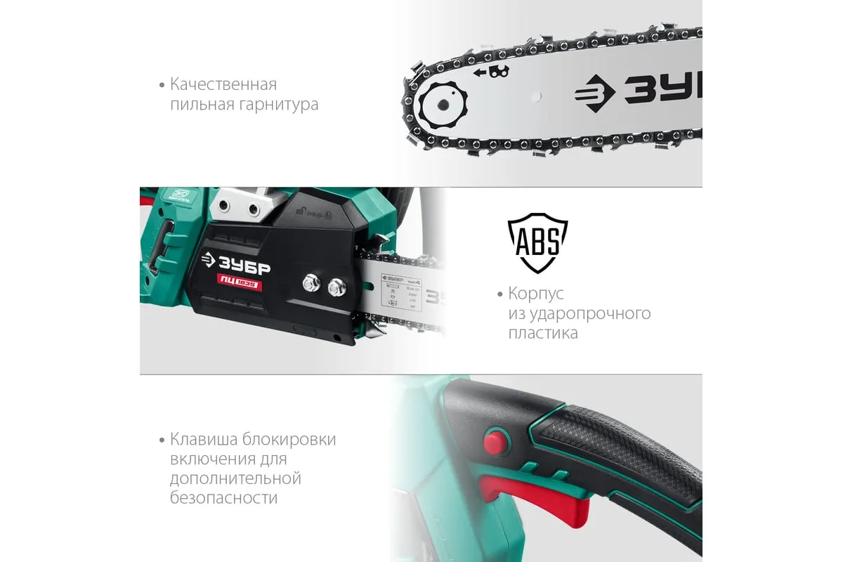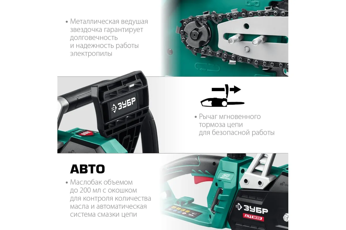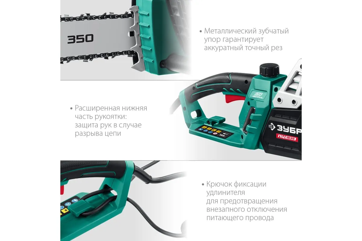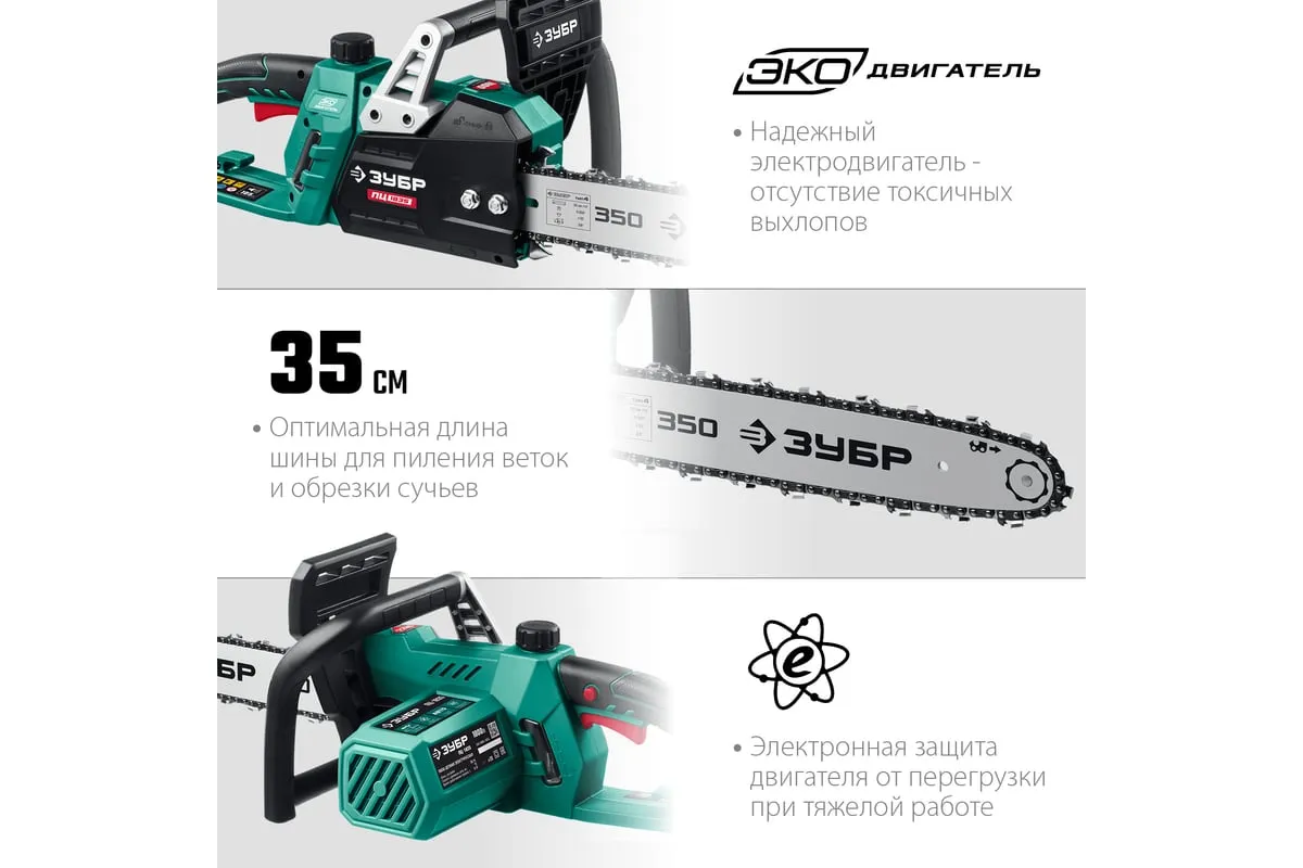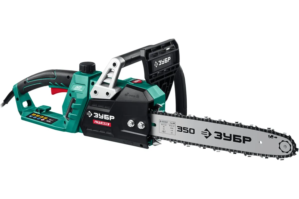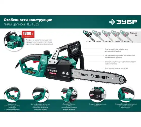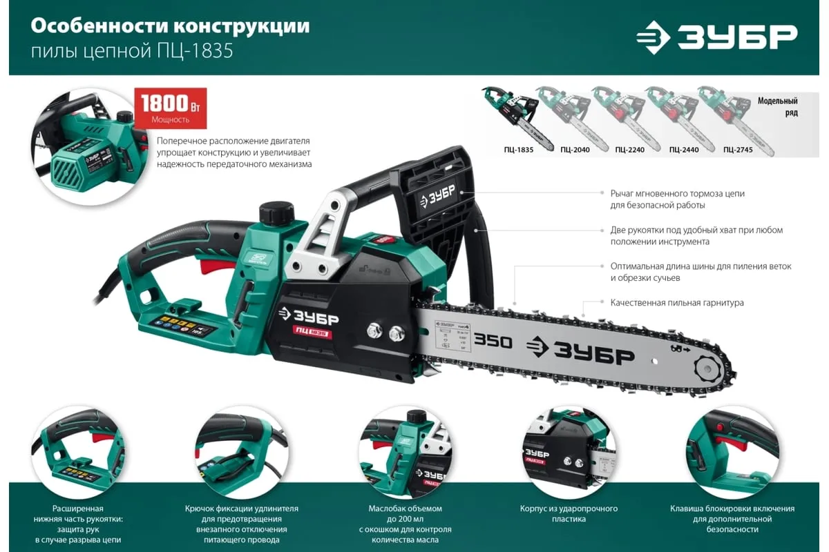 Цепная электрическая пила ЗУБР 1800 Вт ПЦ-1835 - универсальный и надежный помощник для валки деревьев, а так же пиления веток, обрезки сучьев, пиления деревянных бревен и проч. Простота обслуживания. В отличие от бензиновой, электрическая пила не требует постоянных расходных материалов (топлива), не имеет проблем с запуском при любой температуре, требует минимальных операций при подготовке к работе. Мощный двигатель, простое натяжение и дозированная смазка цепи, практически отсутствующая вибрация, минимальное обслуживание делают пилу легкой в обращении икомфортной в работе. Мгновенная остановка цепи, приводимая в действие при откидывании защитного щитка, а также встроенный цепеуловитель и металлический упорспособствуют безопасности применения.