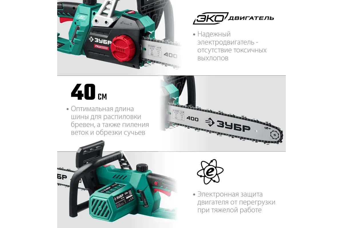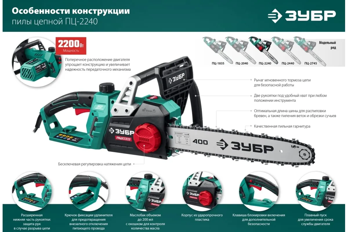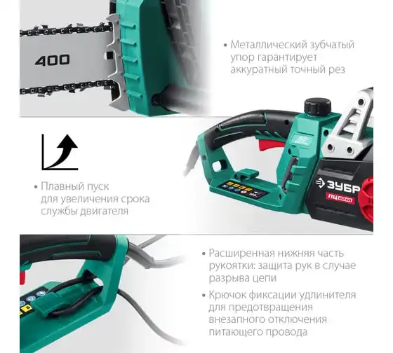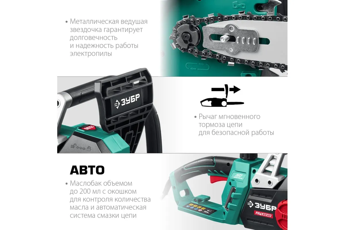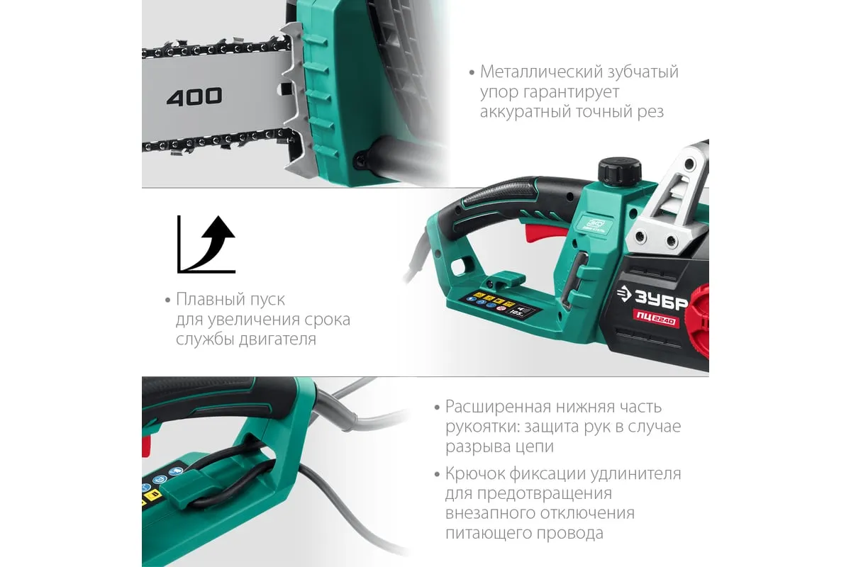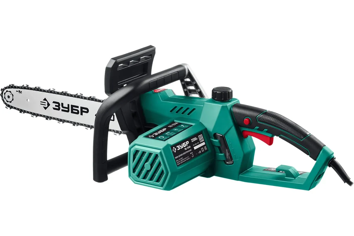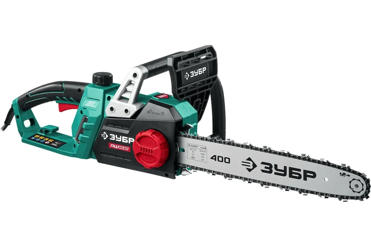 Цепная электрическая пила ЗУБР 2200 Вт ПЦ-2240 - универсальный и надежный помощник для валки деревьев, а так же пиления веток, обрезки сучьев, пиления деревянных бревен и проч. Простота обслуживания. В отличие от бензиновой, электрическая пила не требует постоянных расходных материалов (топлива), не имеет проблем с запуском при любой температуре, требует минимальных операций при подготовке к работе. Мощный двигатель, простое натяжение и дозированная смазка цепи, практически отсутствующая вибрация, минимальное обслуживание делают пилу легкой в обращении икомфортной в работе. Мгновенная остановка цепи, приводимая в действие при откидывании защитного щитка, а также встроенный цепеуловитель и металлический упорспособствуют безопасности применения.