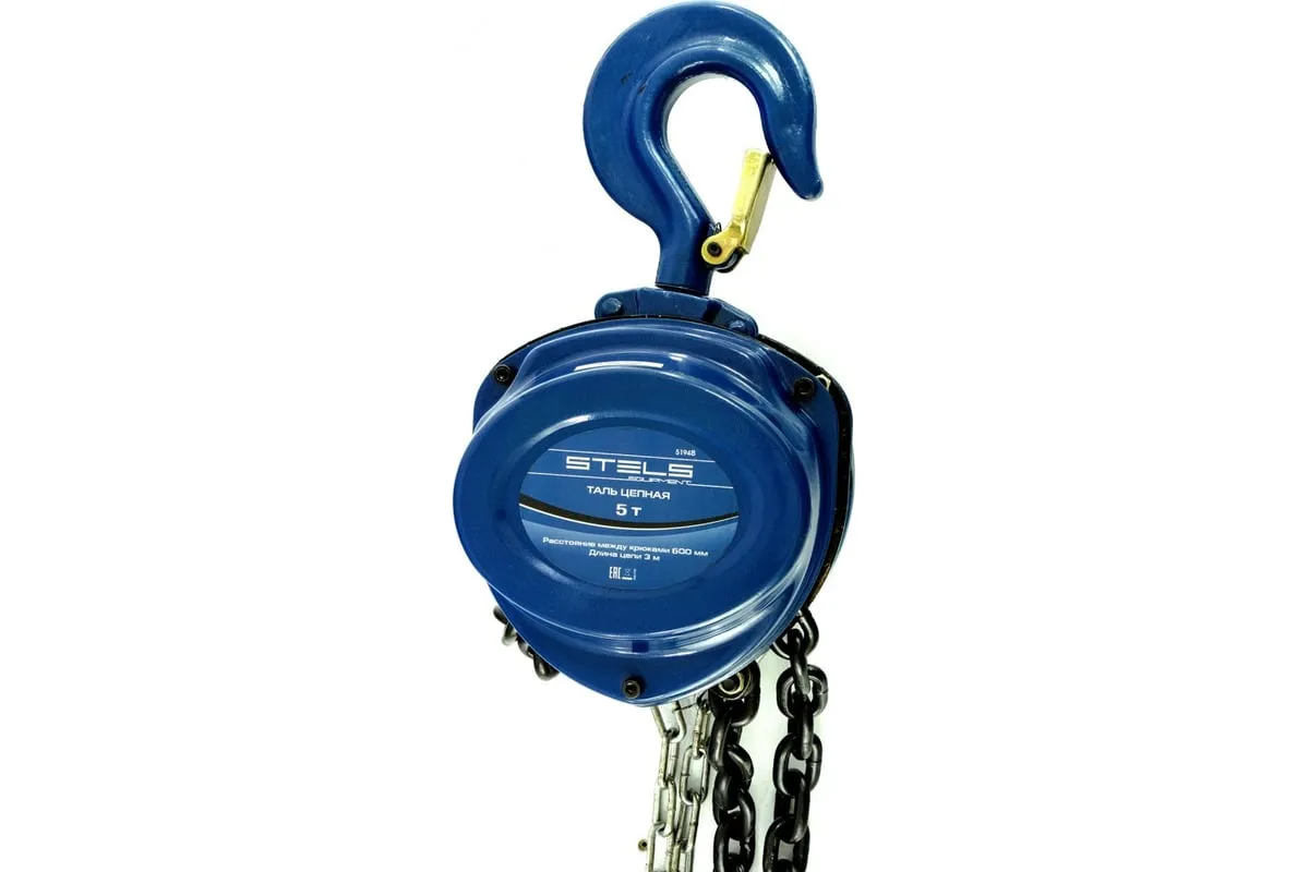 Цепная таль 5 т. STELS 51948 представляет собой подъёмное оборудование для погрузочных и разгрузочных работ. Устройство применяется на строительных объектах, в производстве, на складах, а также в гаражах и автосервисах. Таль способна выдержать груз до 5 тонн. Управляется вручную с помощью цепи.