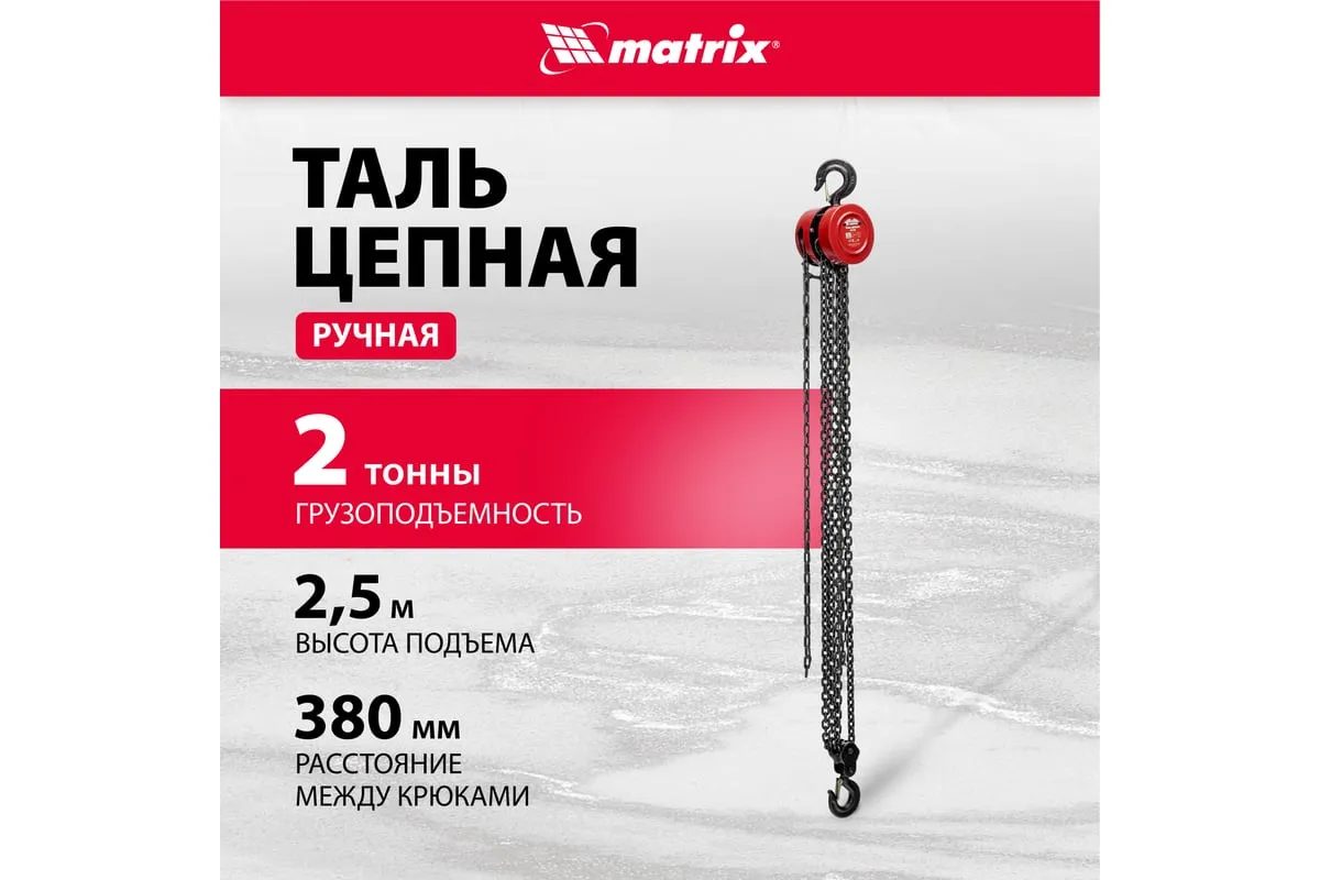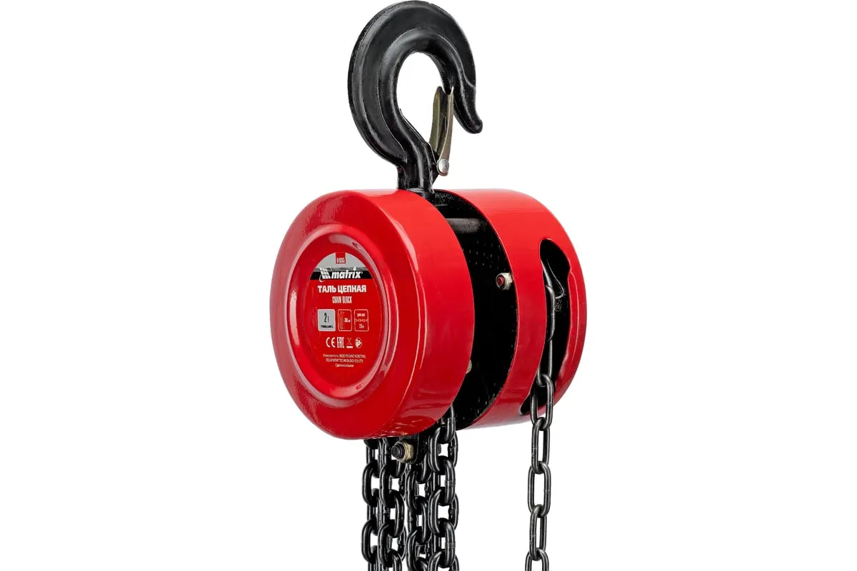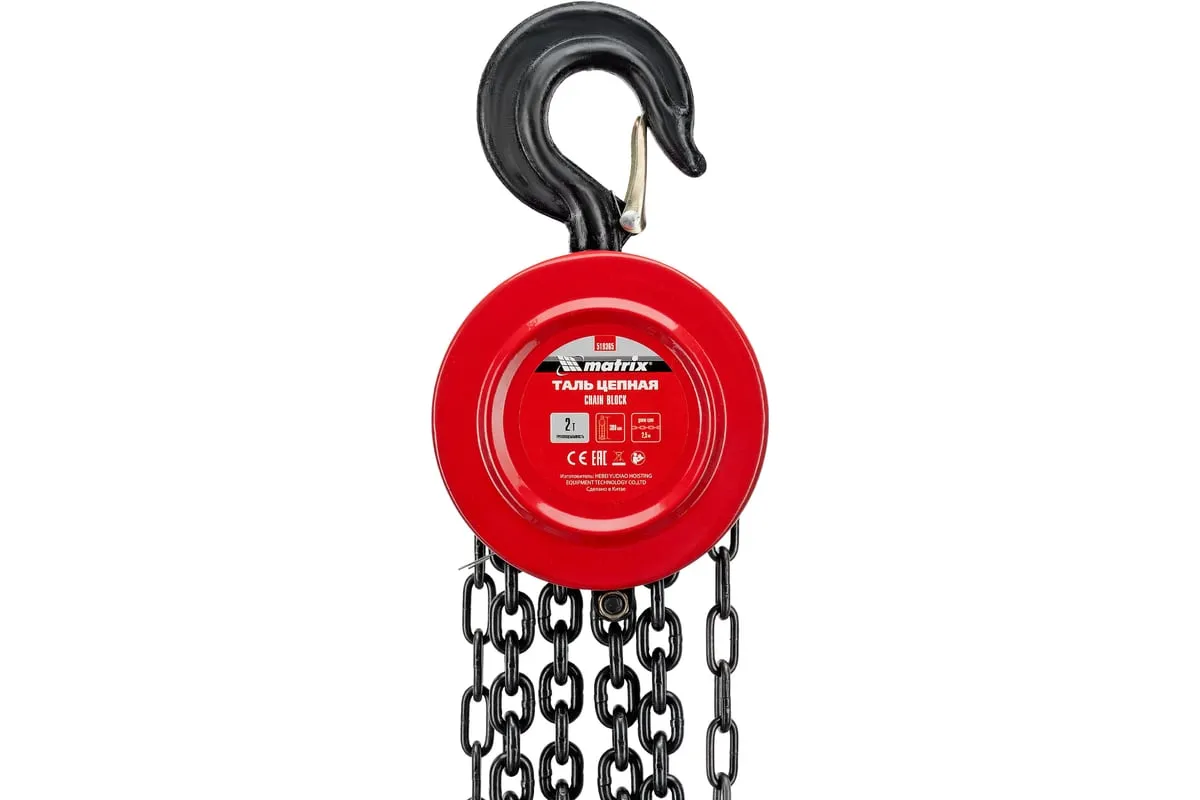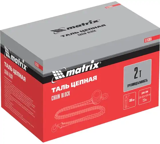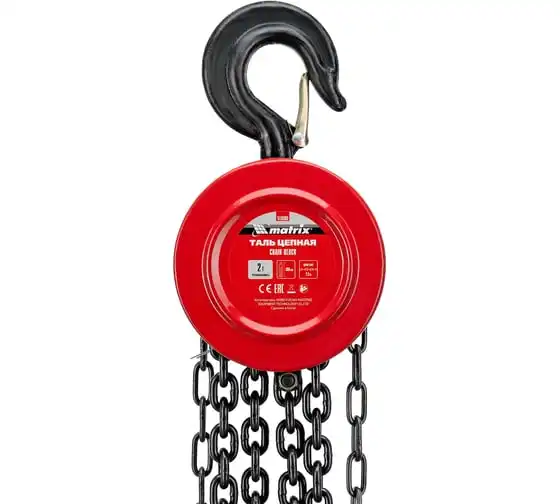 Цепная таль MATRIX 2 т 519365 не требует питания от электричества, поэтому может использоваться вдали от его источников. Грузоподъемная цепь закалена, что говорит о ее надежности и прочности. Специальная форма крюка позволяет легко закрепить на нем стропы. Таль проста в работе и практически не имеет ограничений. Ударопрочный металлический корпус защищает механизм от пыли, грязи и случайных механических повреждений