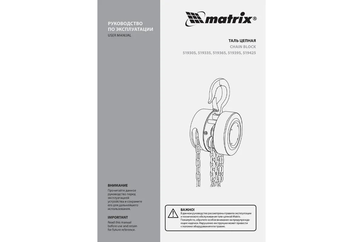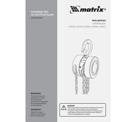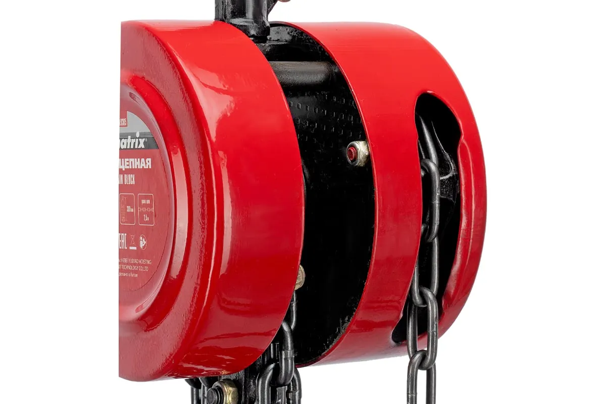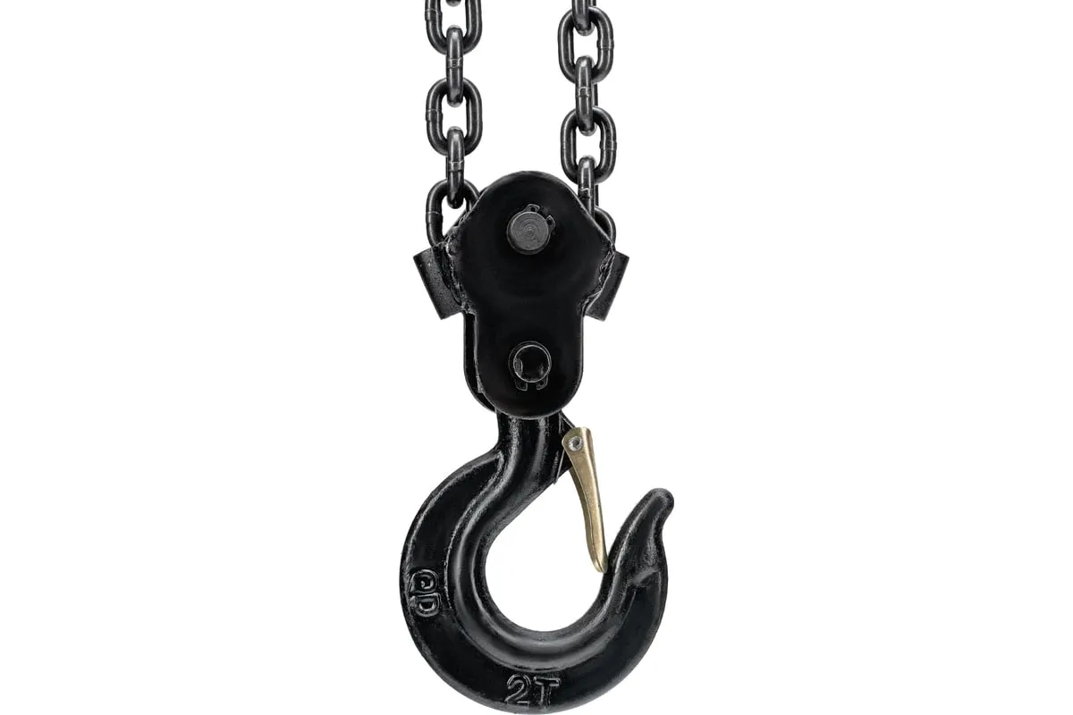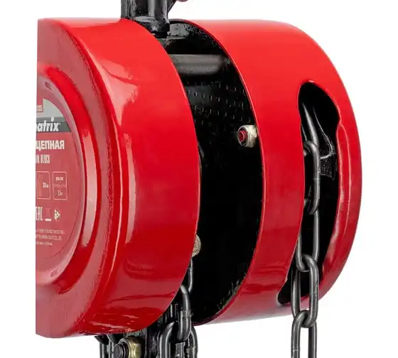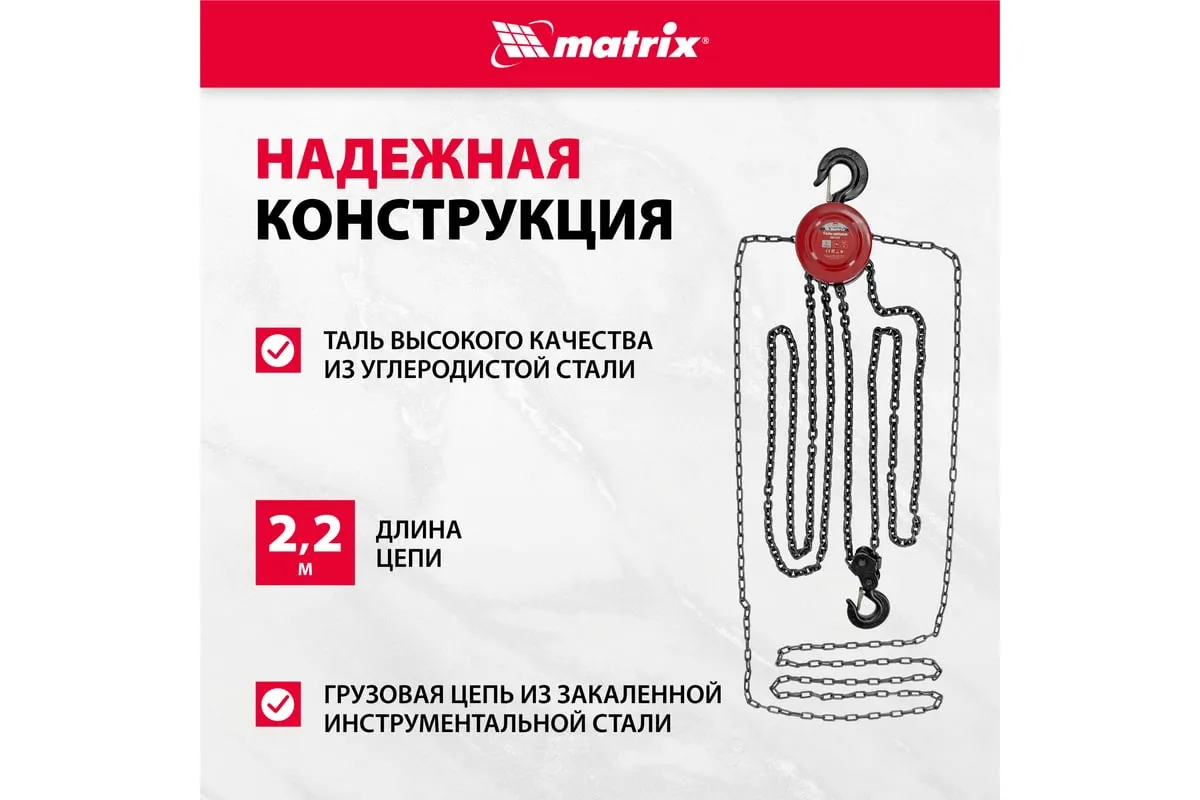 Цепная таль MATRIX 2 т 519365 не требует питания от электричества, поэтому может использоваться вдали от его источников. Грузоподъемная цепь закалена, что говорит о ее надежности и прочности. Специальная форма крюка позволяет легко закрепить на нем стропы. Таль проста в работе и практически не имеет ограничений. Ударопрочный металлический корпус защищает механизм от пыли, грязи и случайных механических повреждений