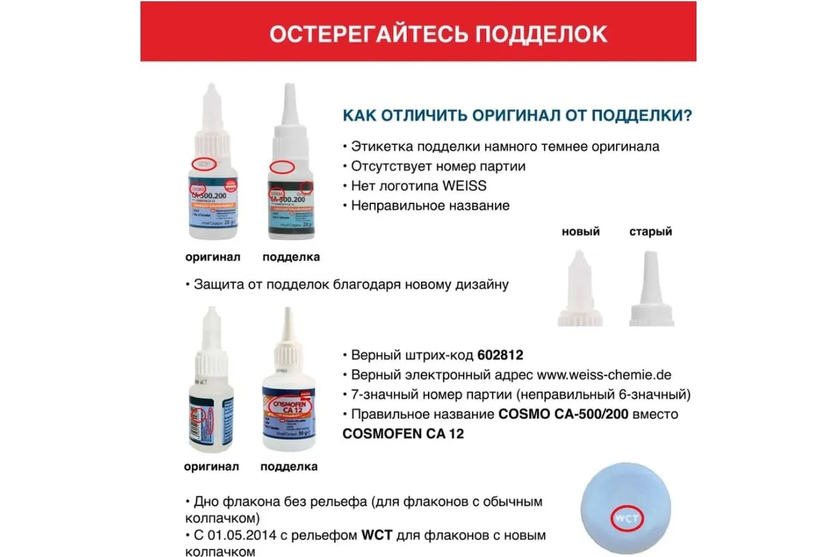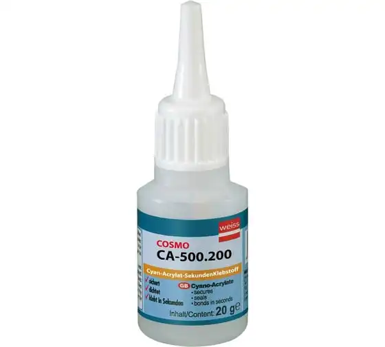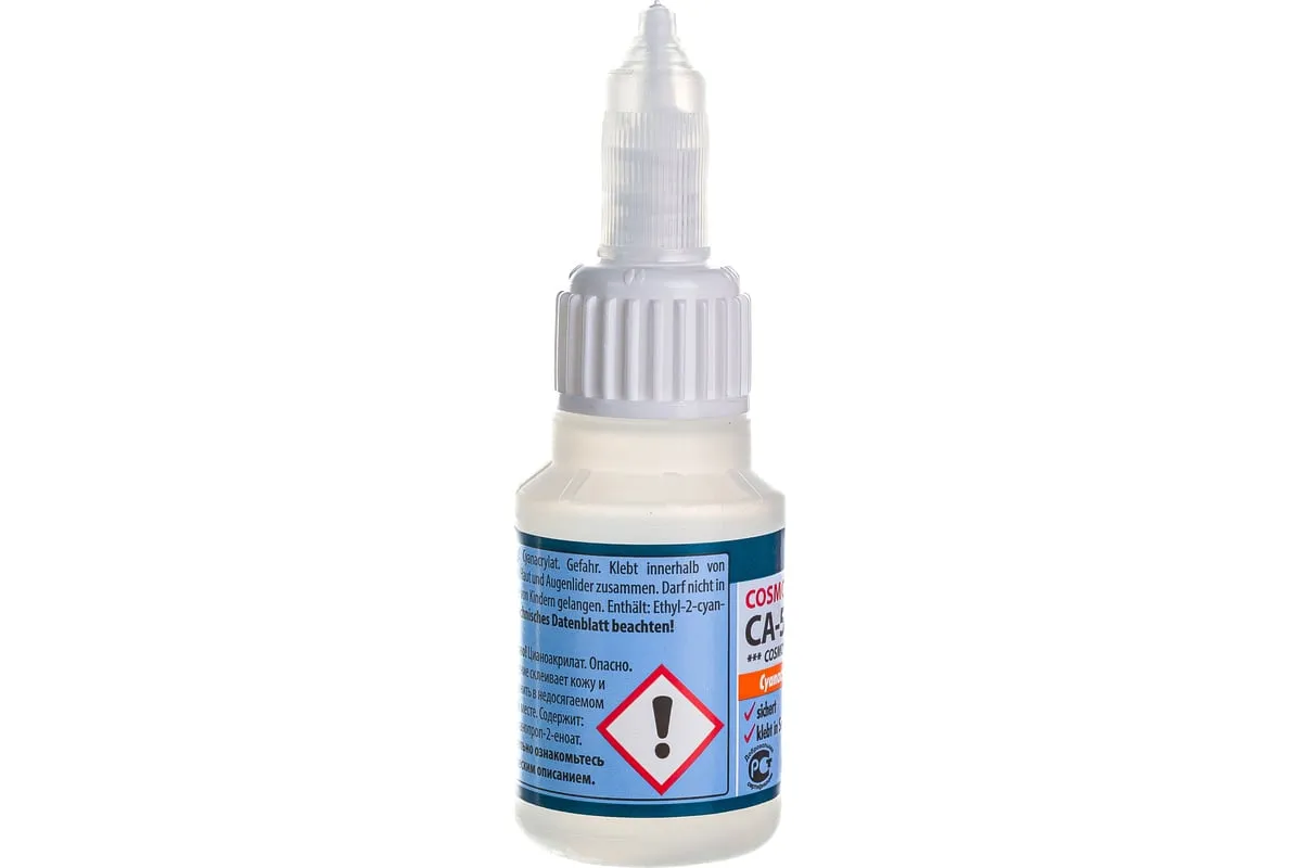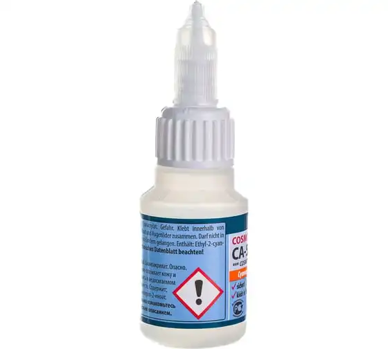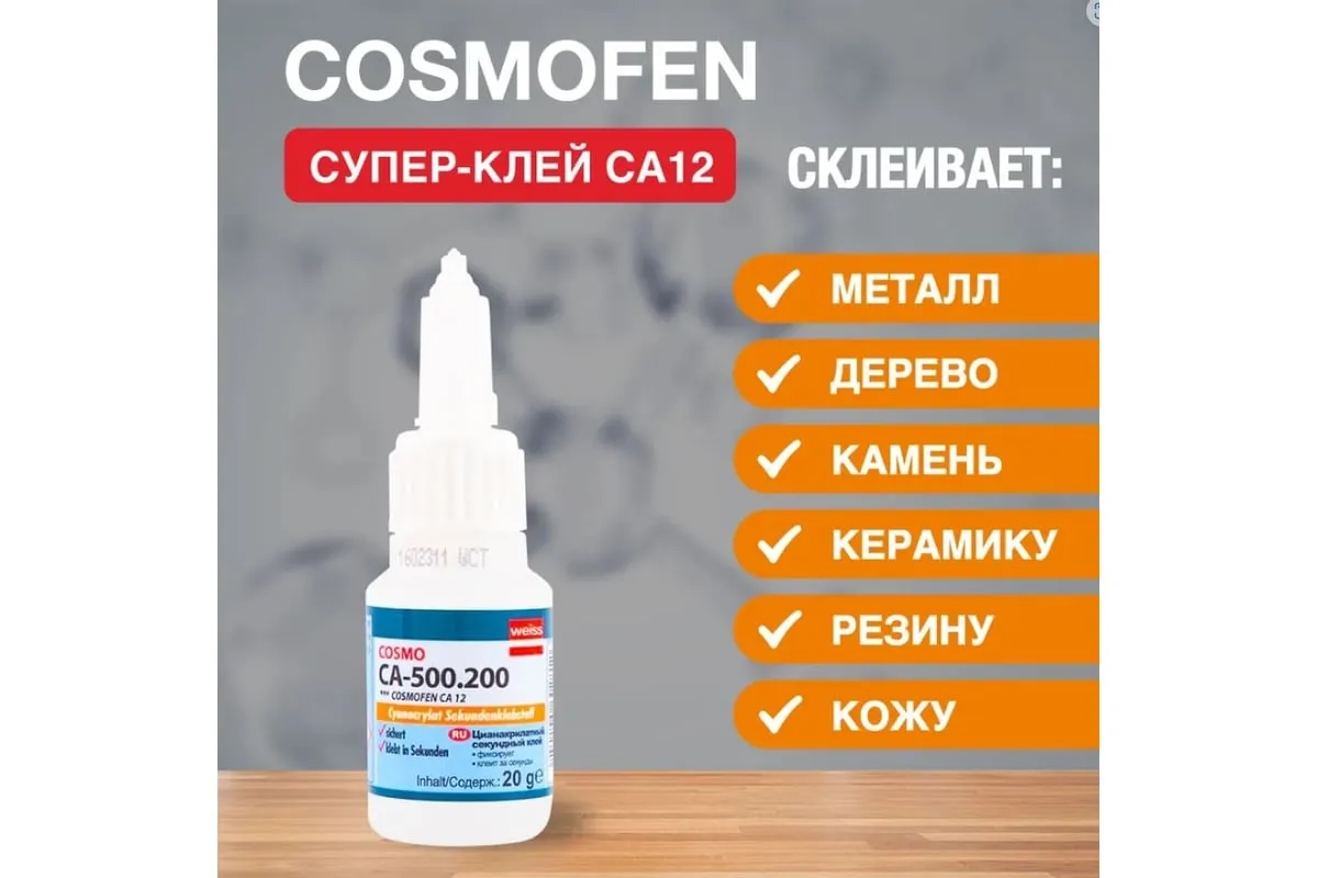 Цианоакрилатный клей COSMOFEN COSMO CA-500.200 - секундный супер-быстрый клей, обладает повышенной прочностью. По результатам испытаний клей Космофен CА-12 признан лучшим "секундным" клеем в области как бытового, так и промышленного применения! Благодаря своим уникальным характеристикам клей Космофен имеет самый широкий спектр областей применения: в быту - прекрасно склеивает все виды пластика, резину, металл, керамику и стекло, незаменим при проведении сантехнических работ, при производстве рекламной продукции, игрушек, в сфере сервисного обслуживания и ремонта автомобилей. Время выдерживания склеиваемых поверхностей составляет считанные секунды. При застывании супер клей момент образует прозрачную пленку, не заметную для глаз. Не использовать клей для склеивания пористых поверхностей. Клей са 12 очень практичен и легок в применении.